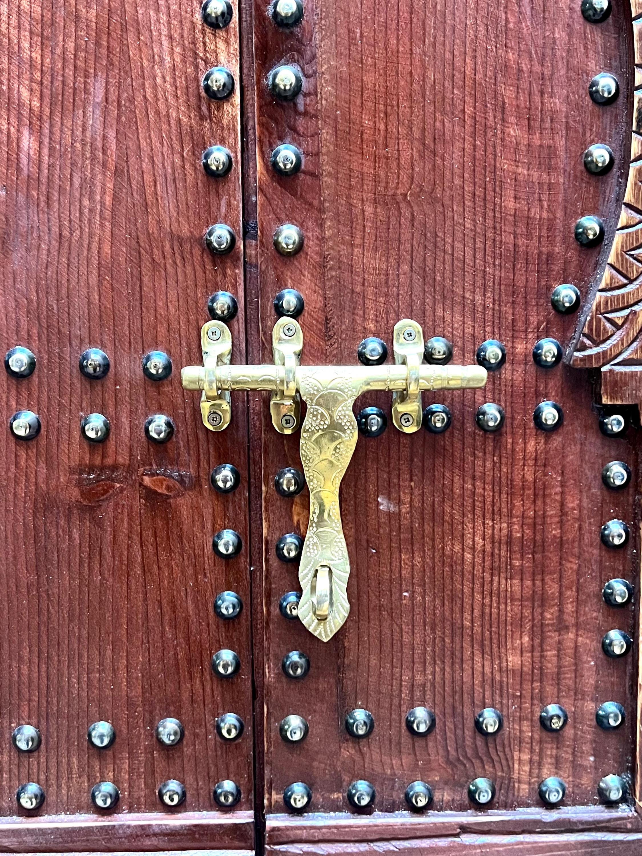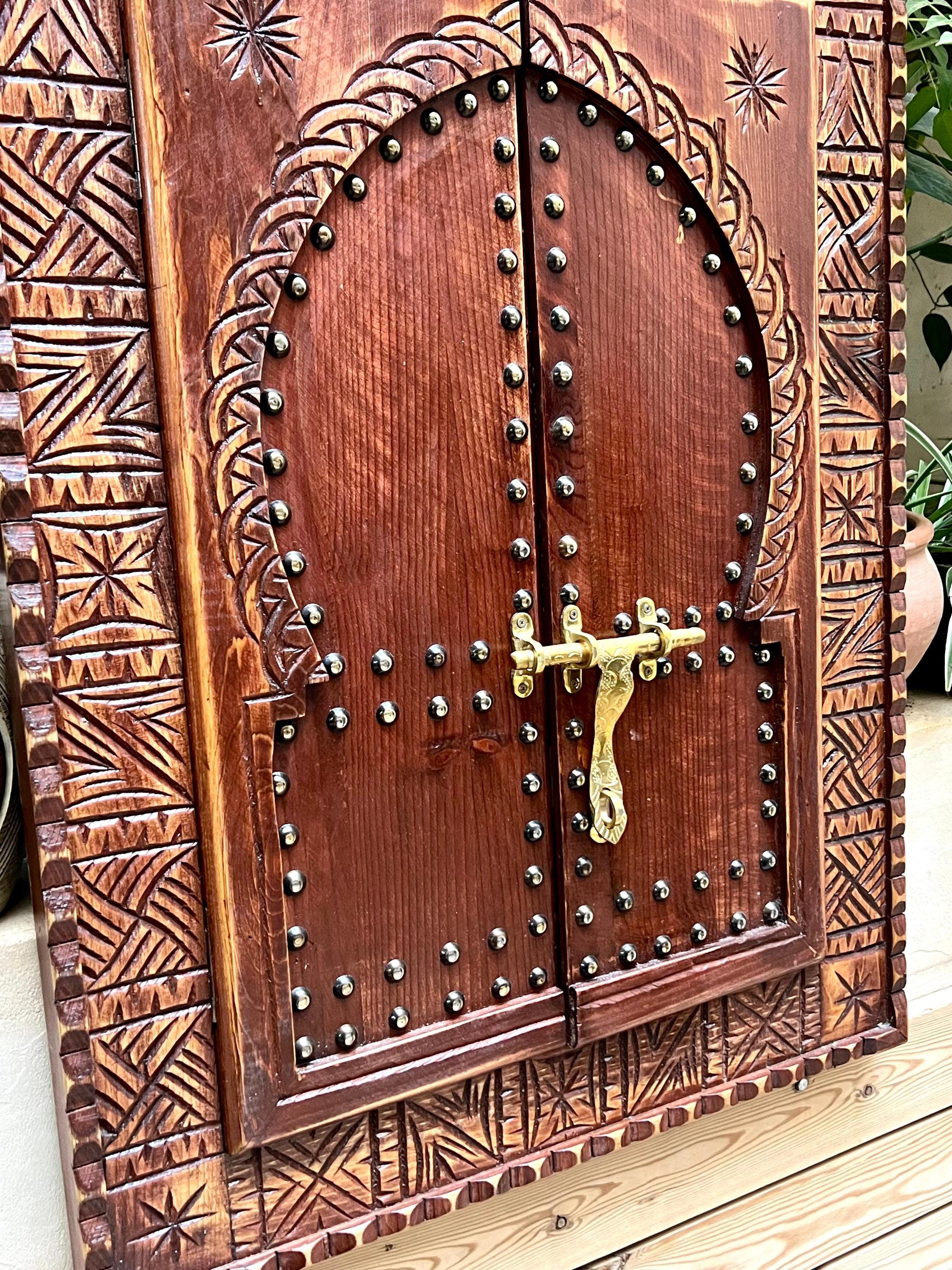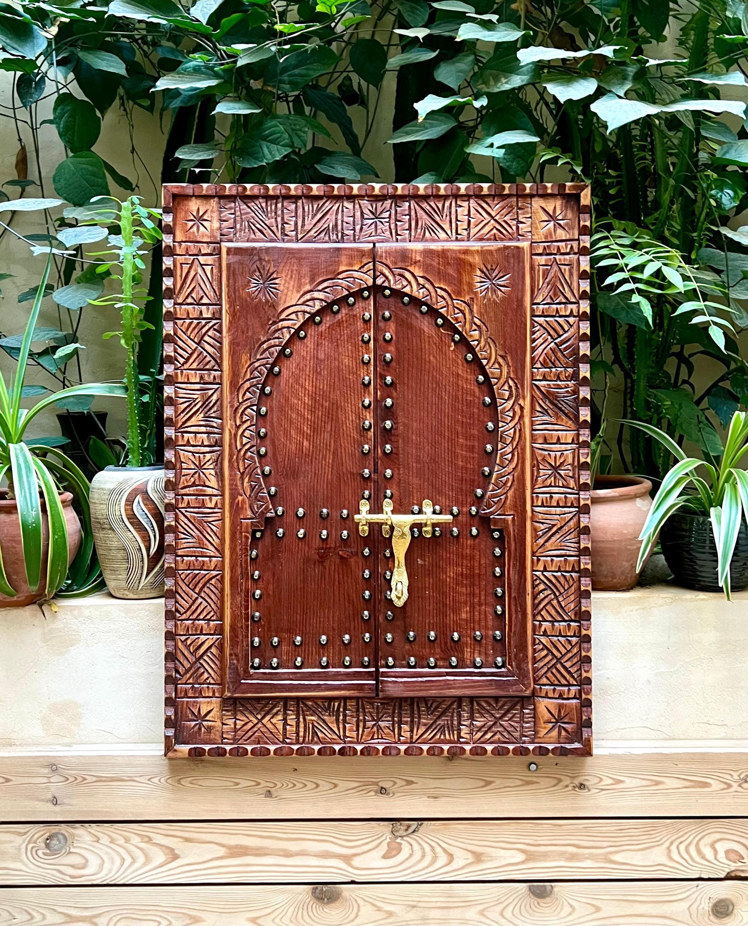 Bring an authentic touch of Moroccan craftsmanship into your home with this handmade cedar wood window frame, intricately carved and decorated by skilled artisans. Featuring a classic Moorish arched door design with brass studs, this unique piece is both functional and decorative.
