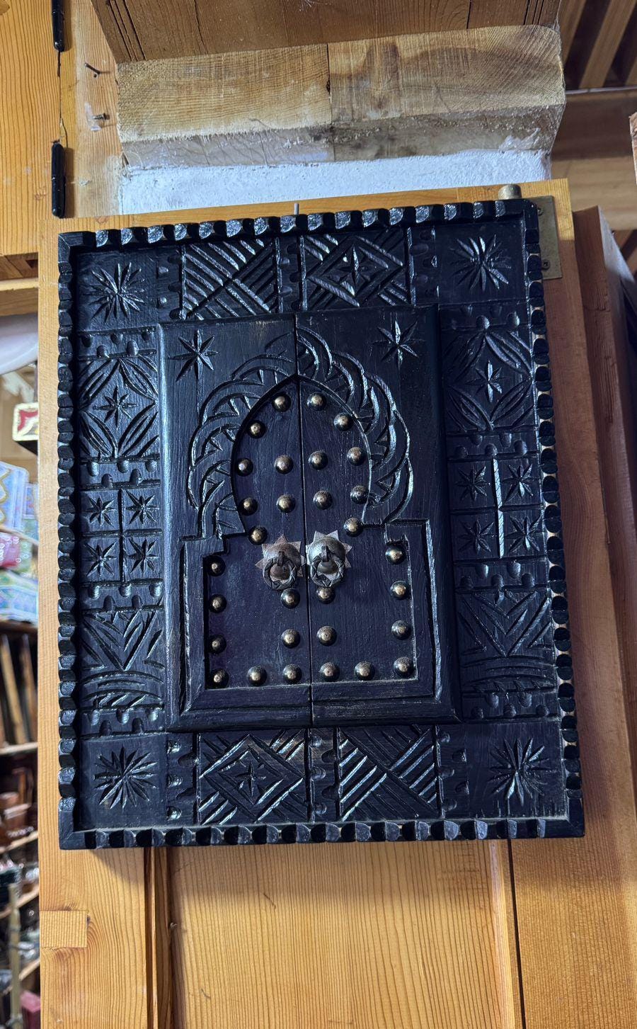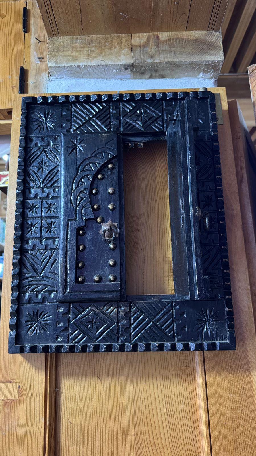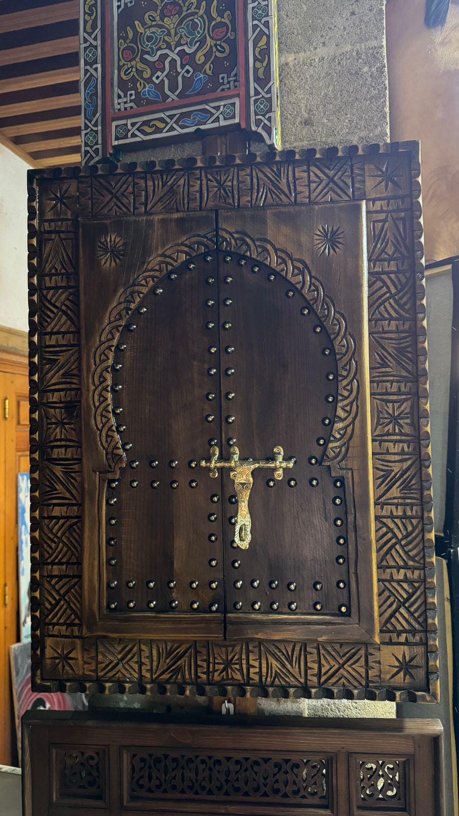 Bring an authentic touch of Moroccan craftsmanship into your home with this handmade cedar wood window frame, intricately carved and decorated by skilled artisans. Featuring a classic Moorish arched door design with brass studs, this unique piece is both functional and decorative.
