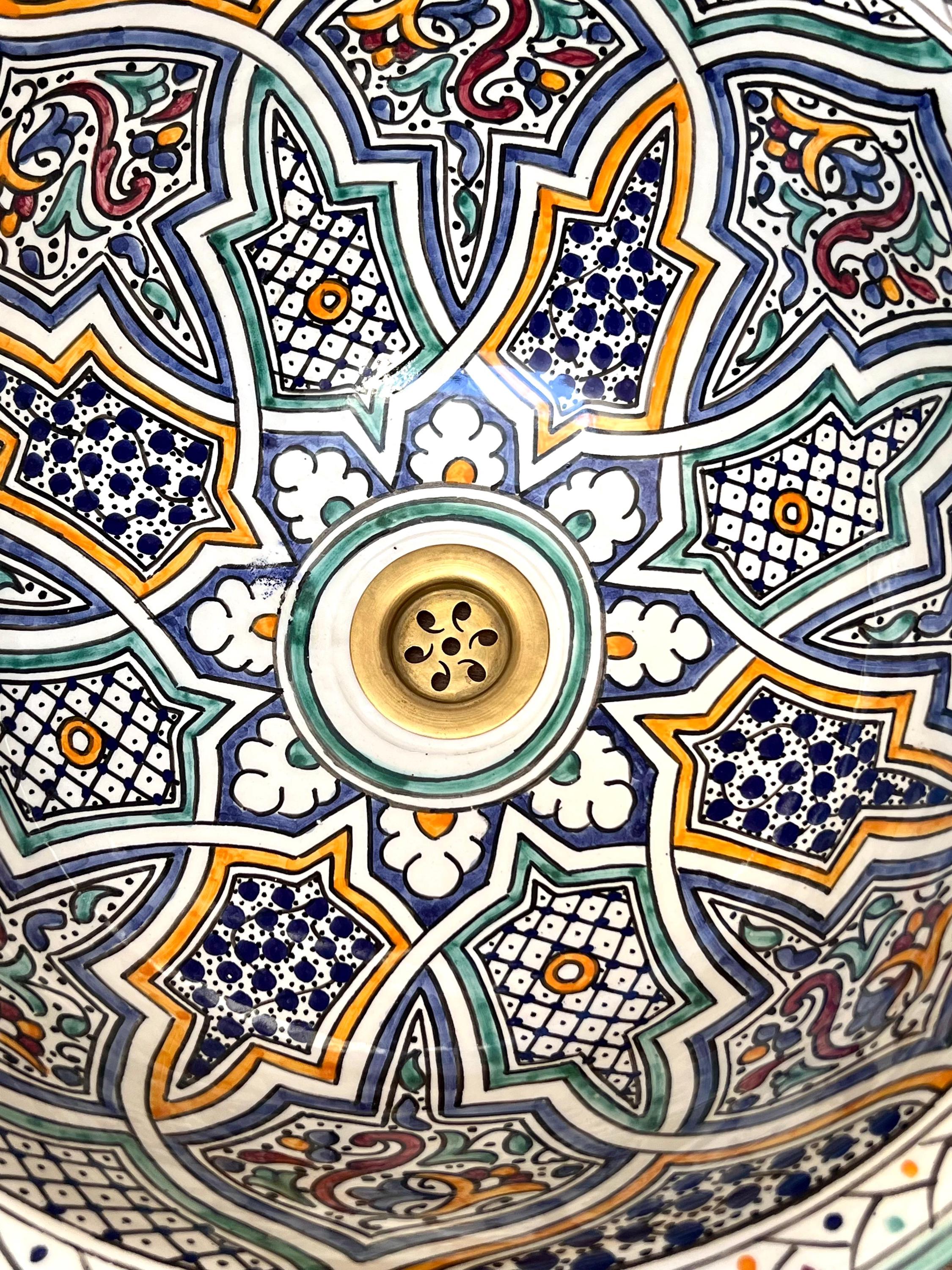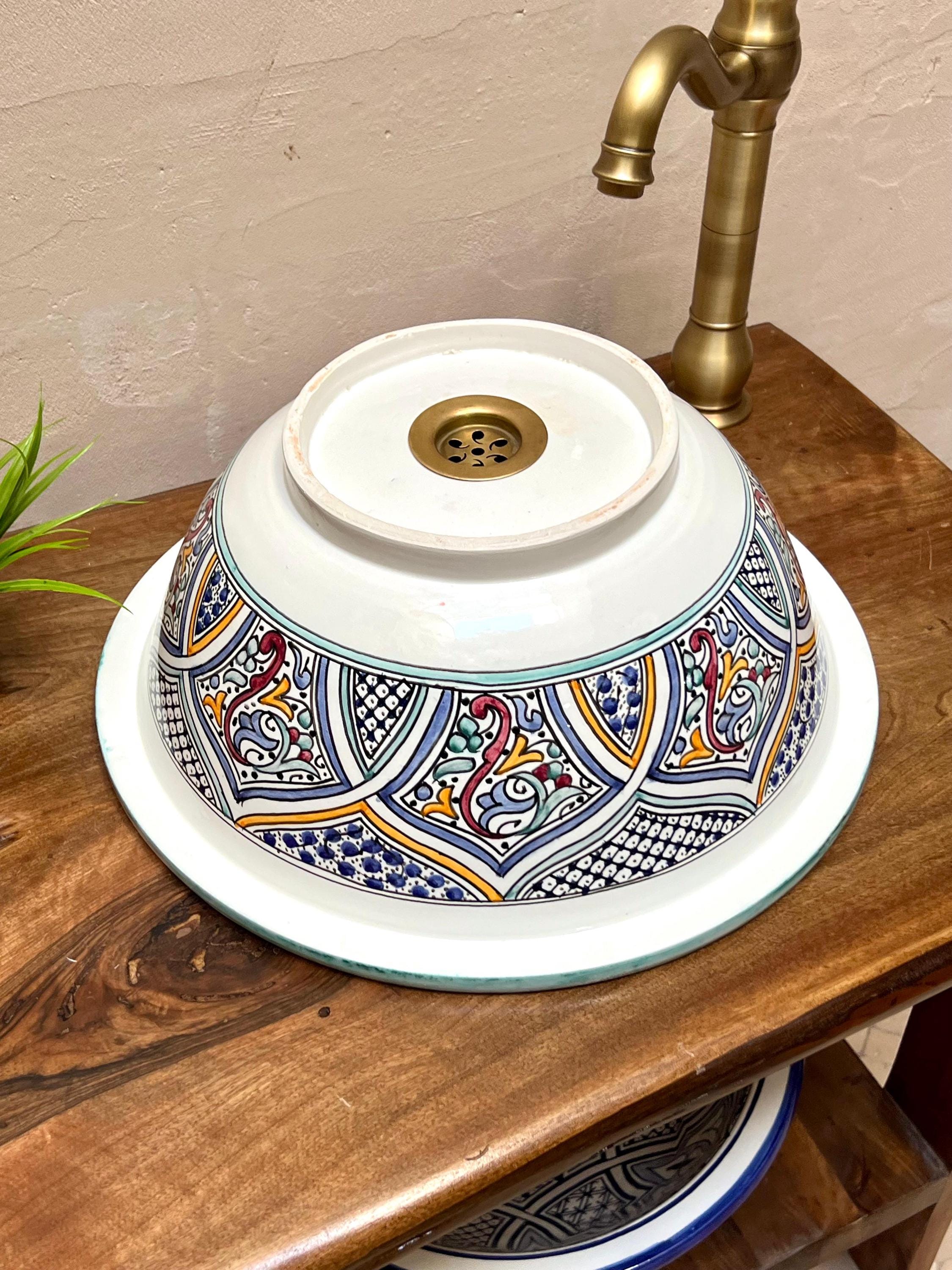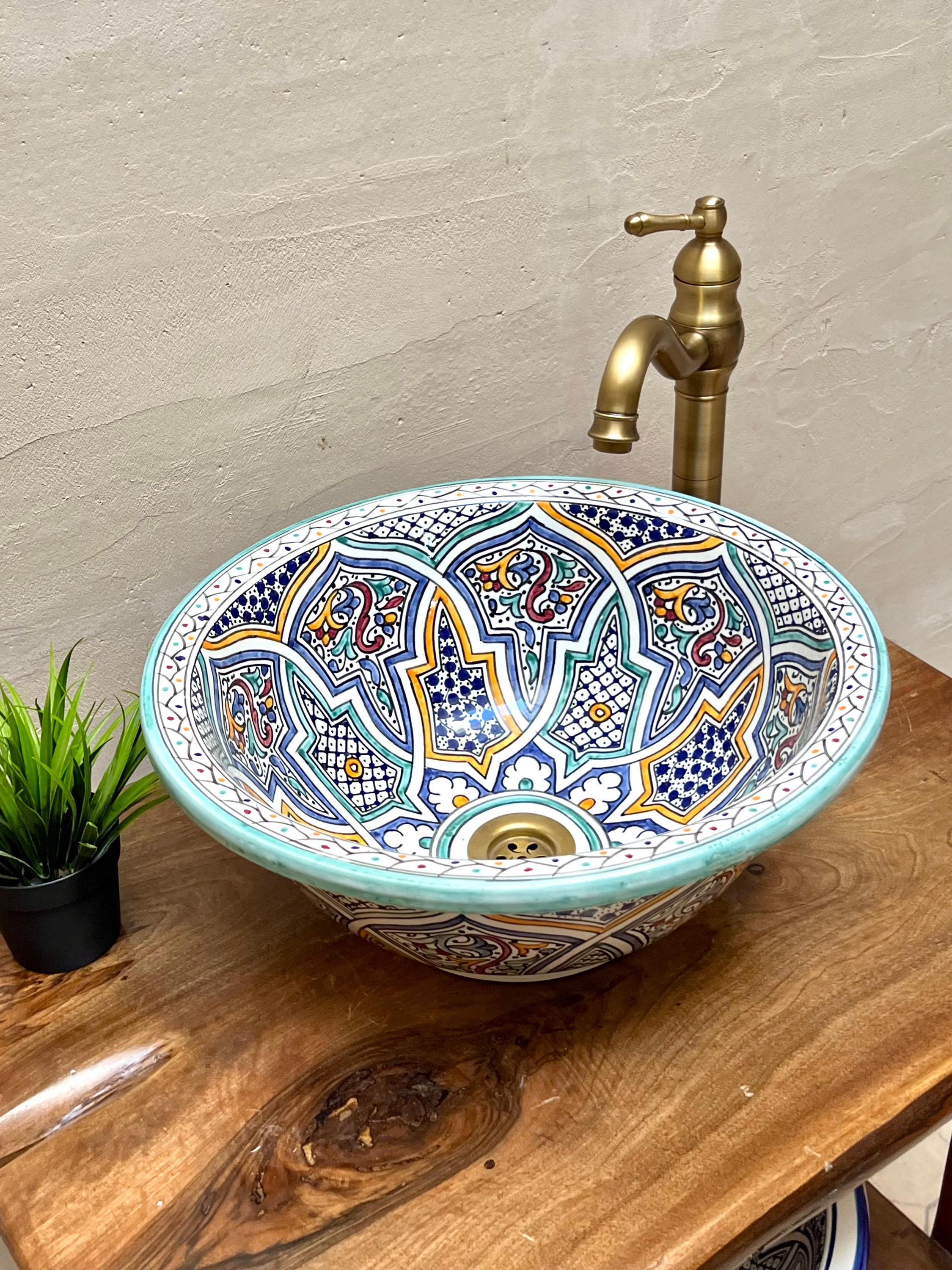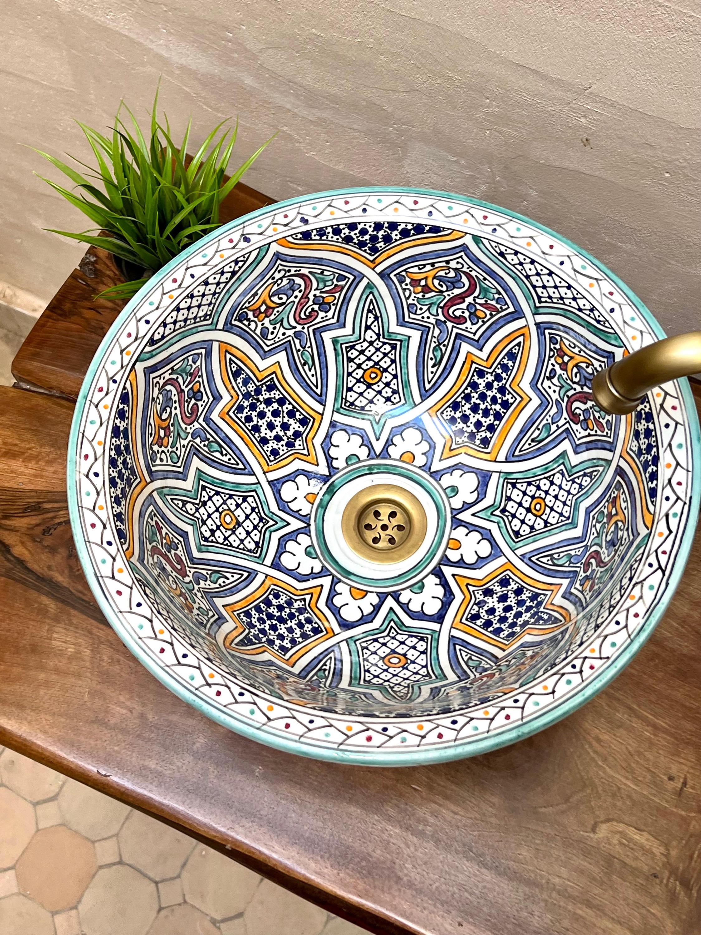 This beautiful Moroccan round ceramic sink is handcrafted by skilled artisans in Fes, made from high-quality clay, and features intricate hand-painted designs with a smooth glazed finish. Made from high-quality ceramic, it is durable, easy to clean, and perfect for bathrooms, kitchens, or powder rooms. Its timeless design adds a touch of Moroccan elegance to any space. The sink comes with both silver and copper drains included for free. Each piece is truly unique, and as a result, minor imperfections are to be expected. If you need a different size, feel free to contact us.