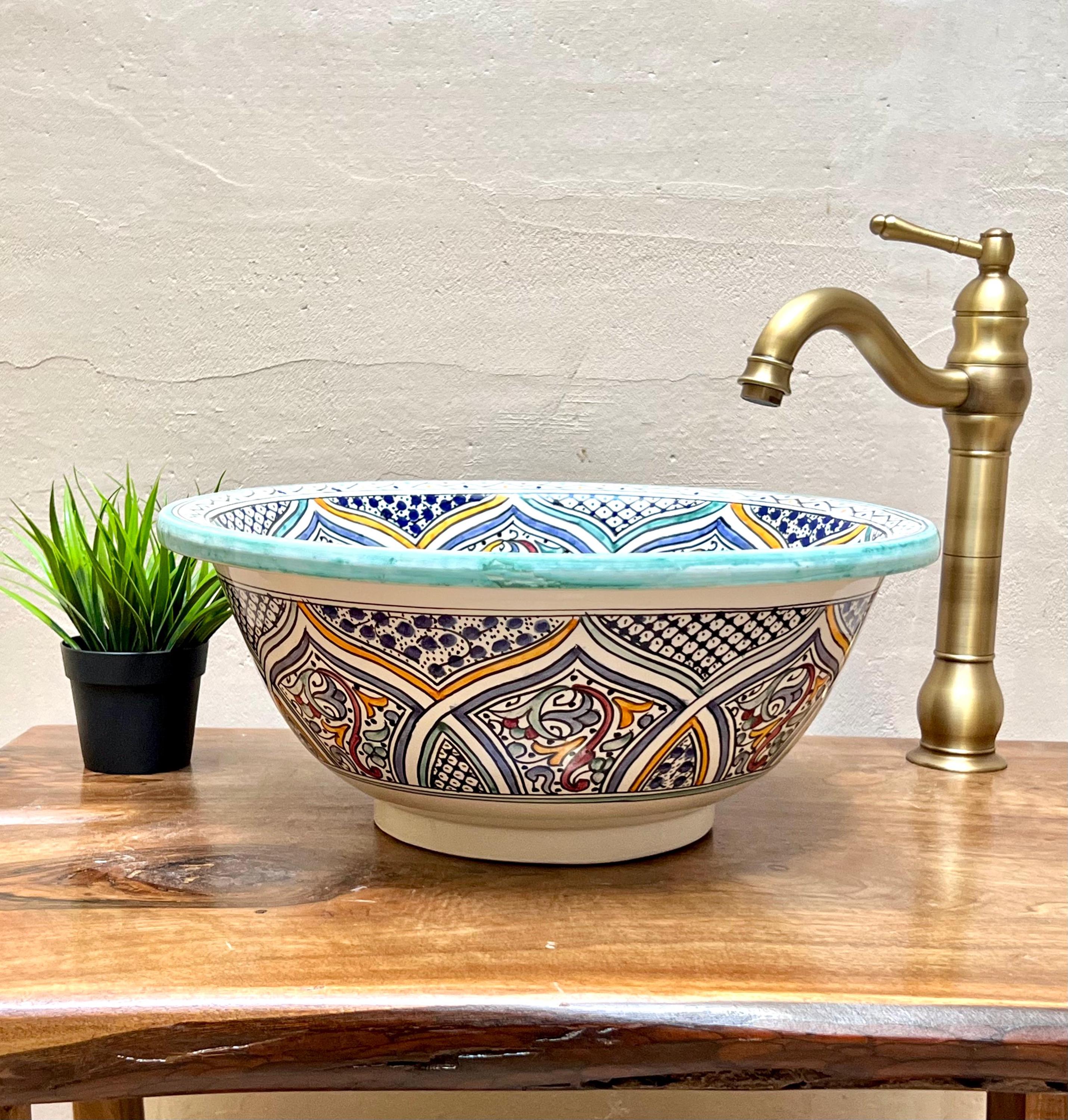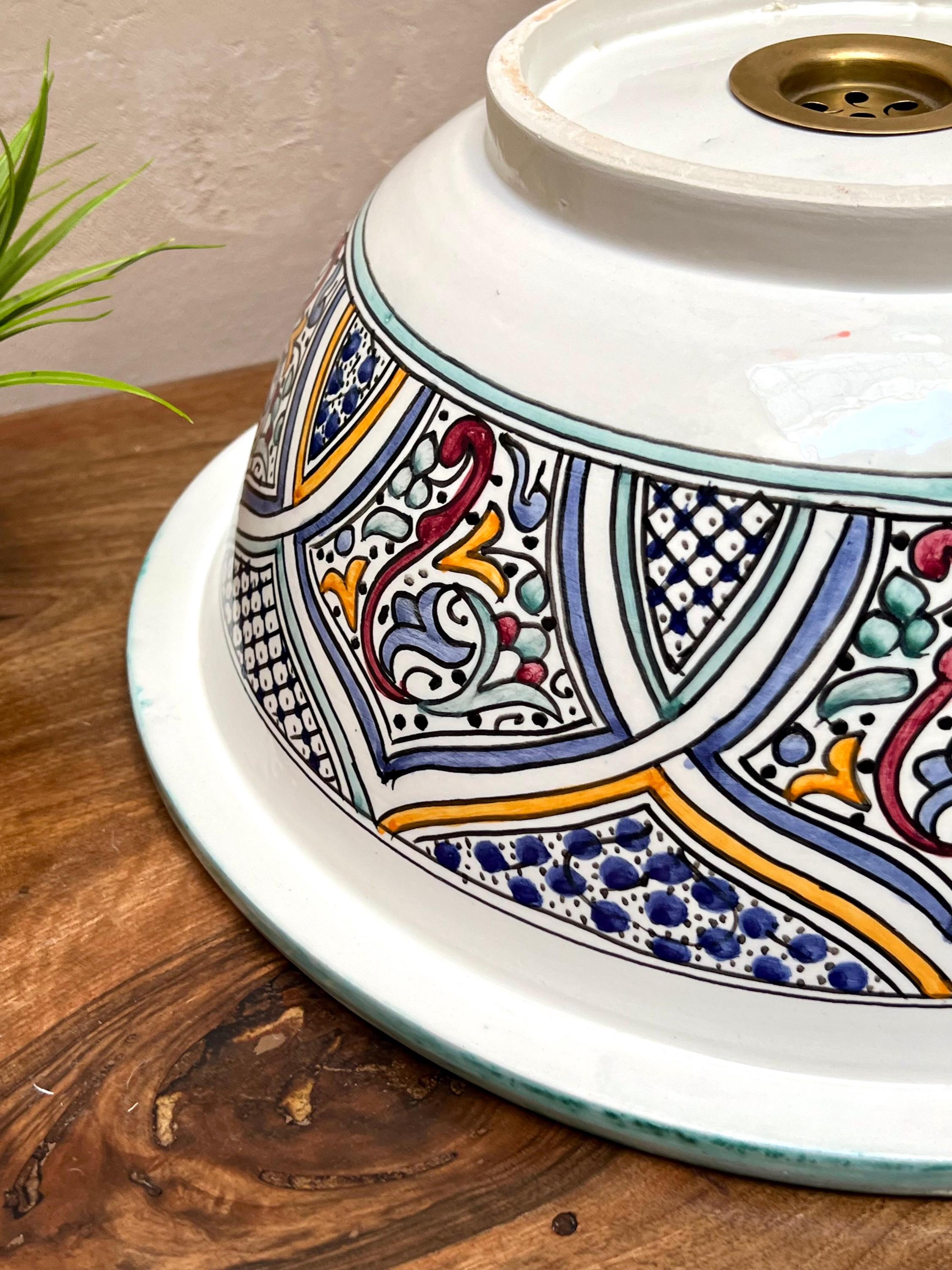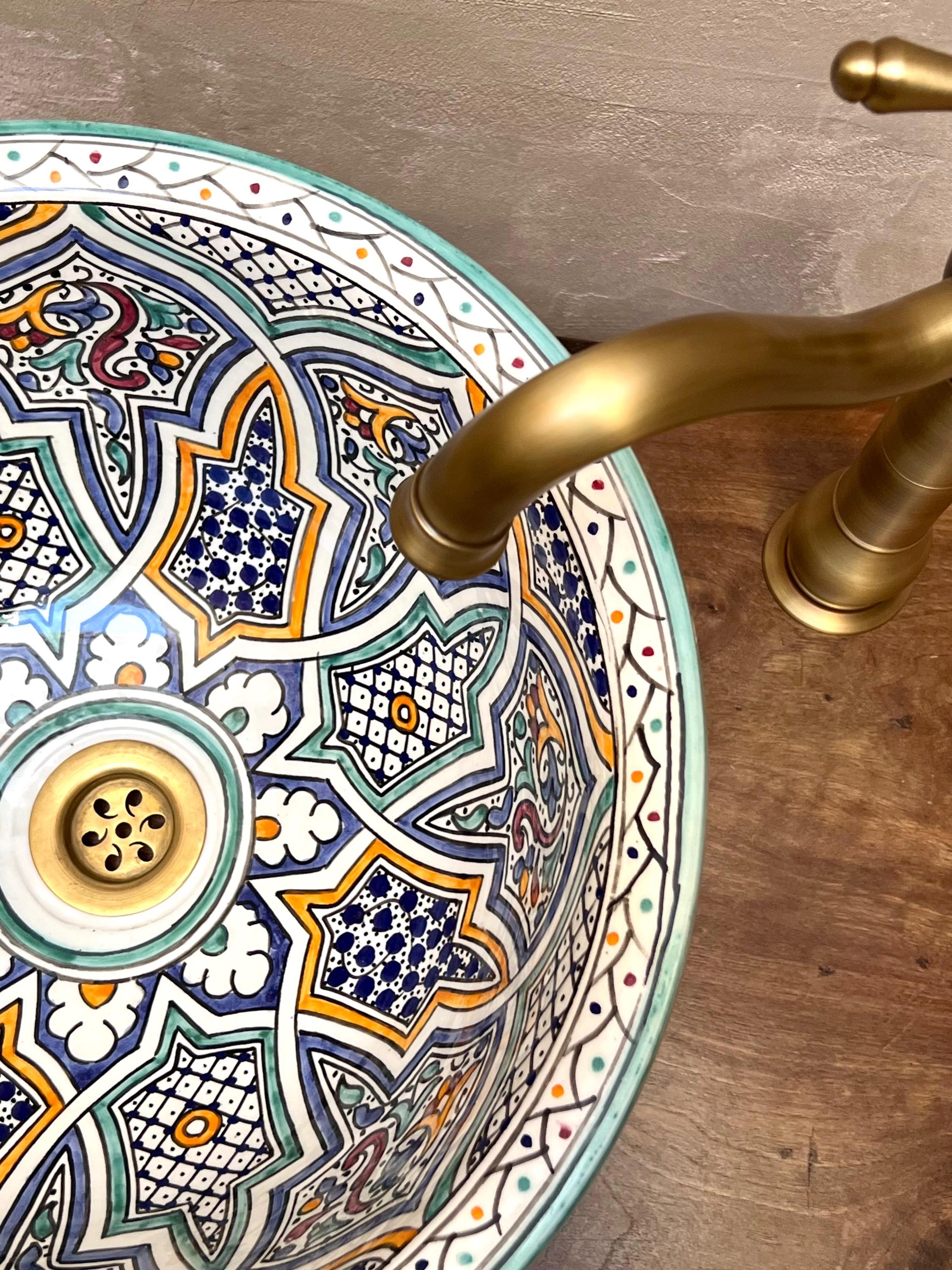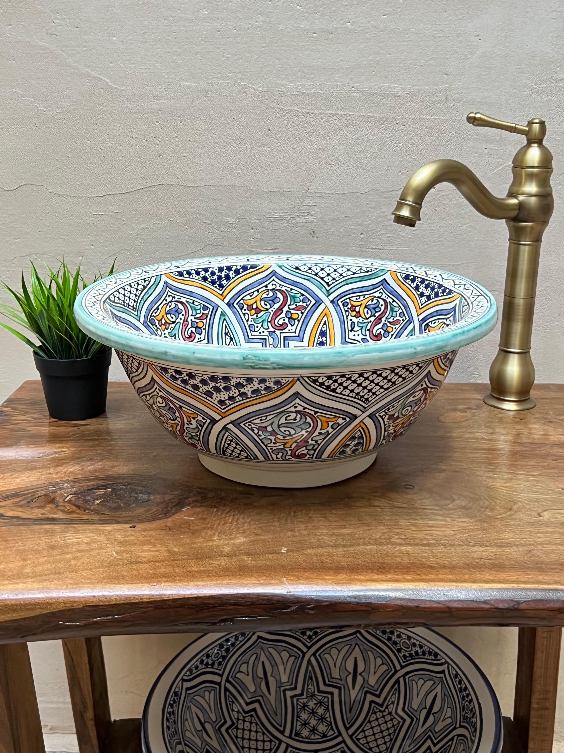 This beautiful Moroccan round ceramic sink is handcrafted by skilled artisans in Fes, made from high-quality clay, and features intricate hand-painted designs with a smooth glazed finish. Made from high-quality ceramic, it is durable, easy to clean, and perfect for bathrooms, kitchens, or powder rooms. Its timeless design adds a touch of Moroccan elegance to any space. The sink comes with both silver and copper drains included for free. Each piece is truly unique, and as a result, minor imperfections are to be expected. If you need a different size, feel free to contact us.