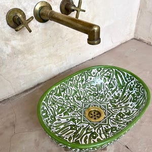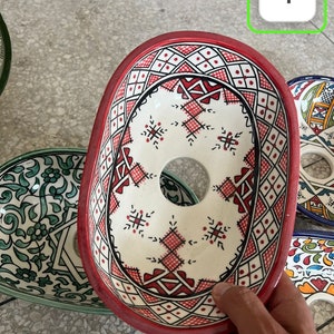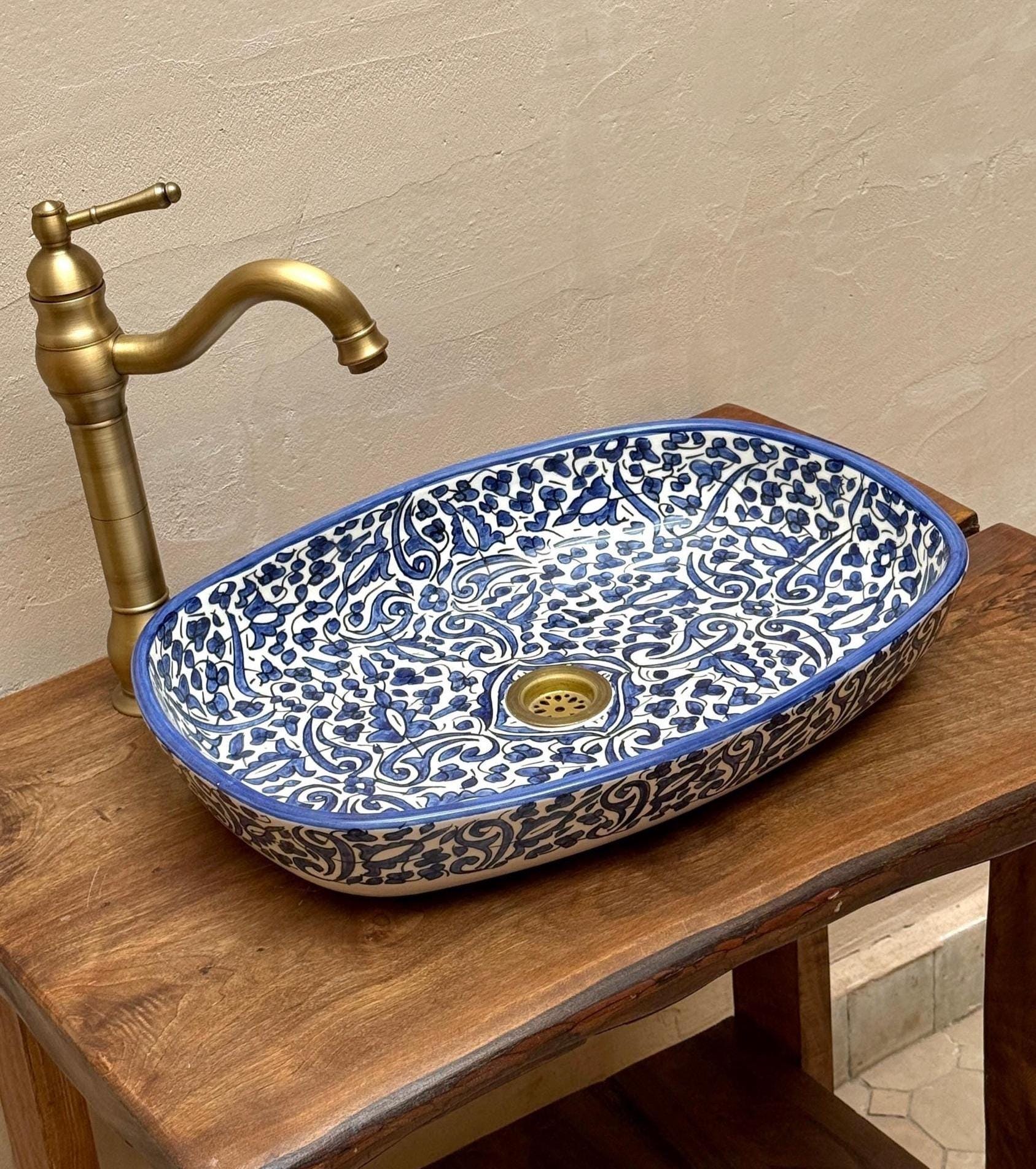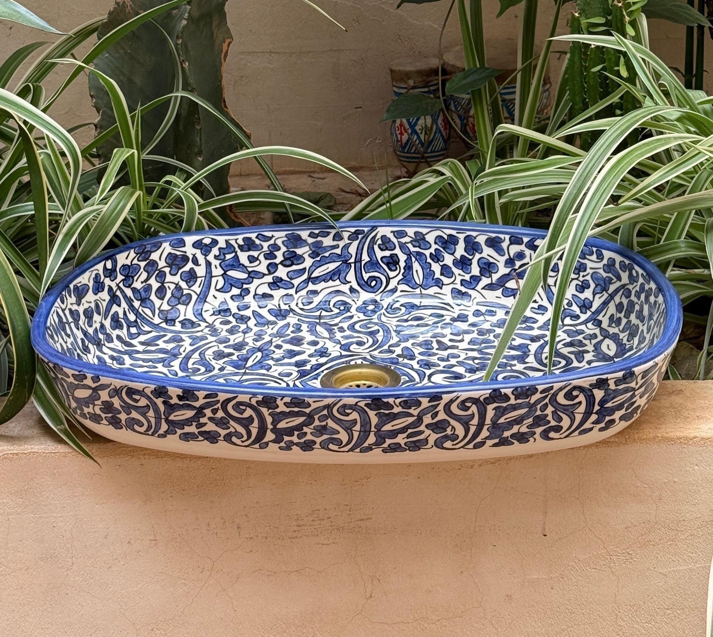 This beautiful Moroccan Oval ceramic sink is handcrafted by skilled artisans in Fes, made from high-quality clay, and features intricate hand-painted designs with a smooth glazed finish. Made from high-quality ceramic, it is durable, easy to clean, and perfect for bathrooms, kitchens, or powder rooms. Its timeless design adds a touch of Moroccan elegance to any space. The sink comes with both silver and copper drains included for free. Each piece is truly unique, and as a result, minor imperfections are to be expected. If you need a different size, feel free to contact us.