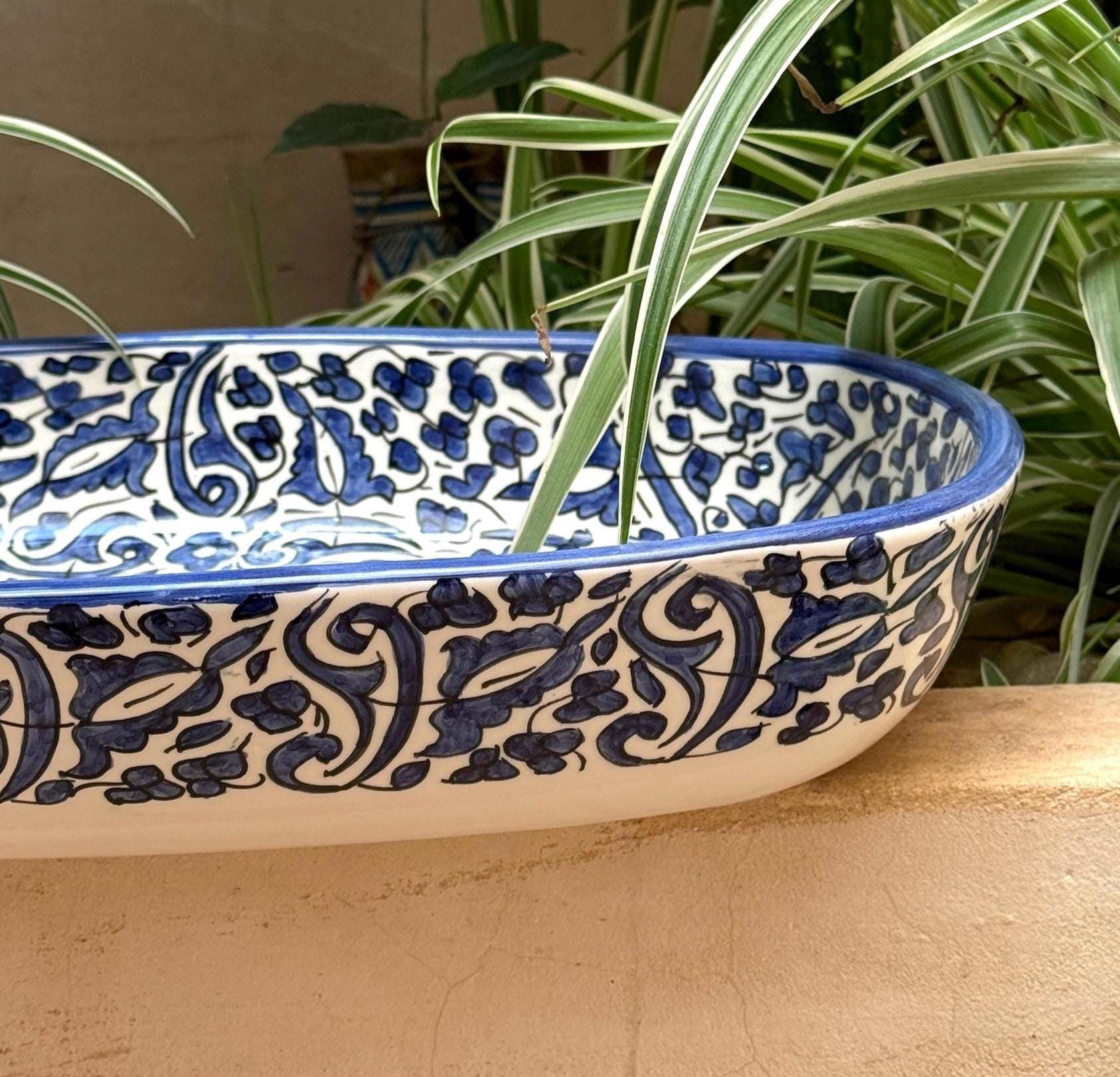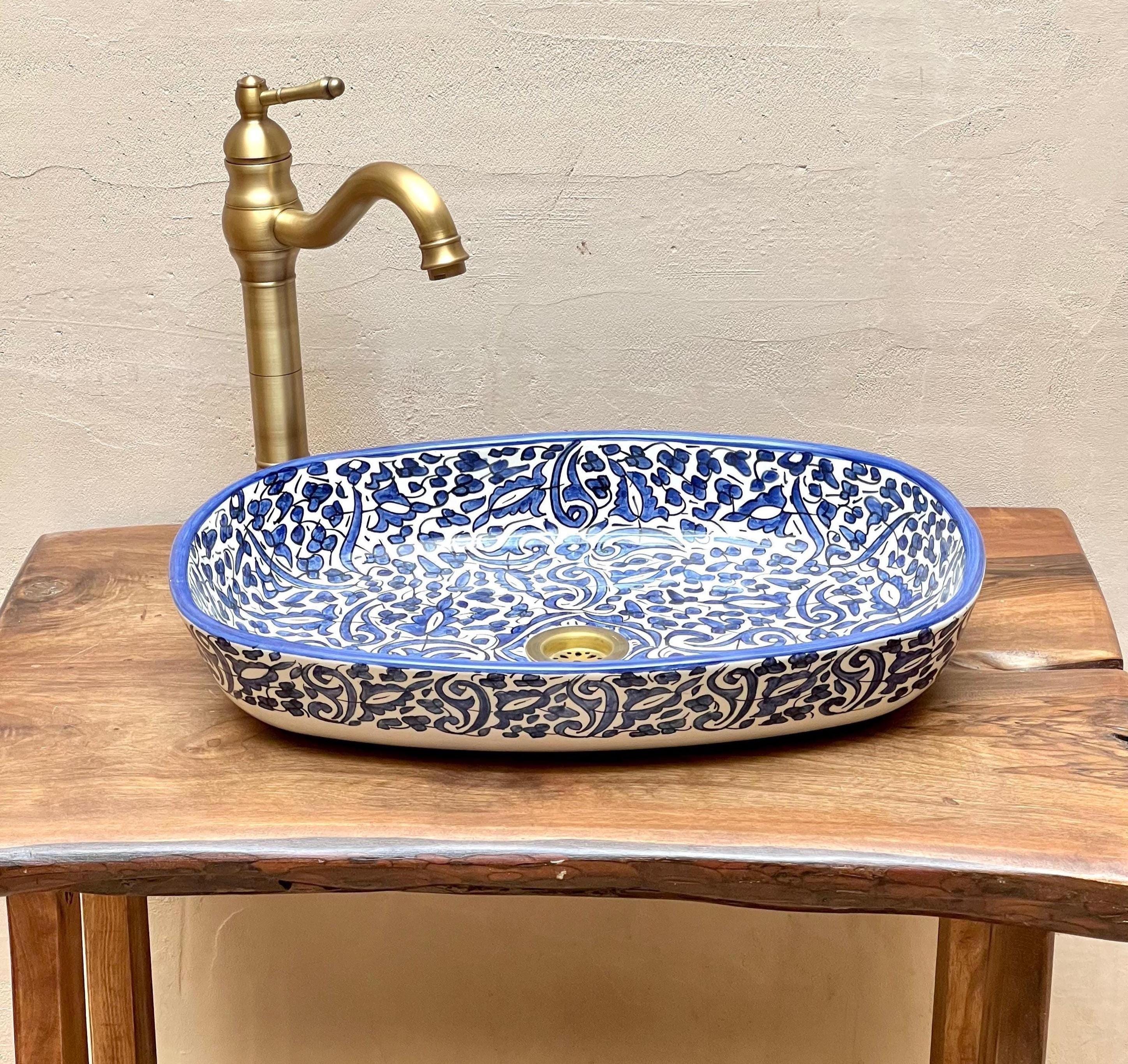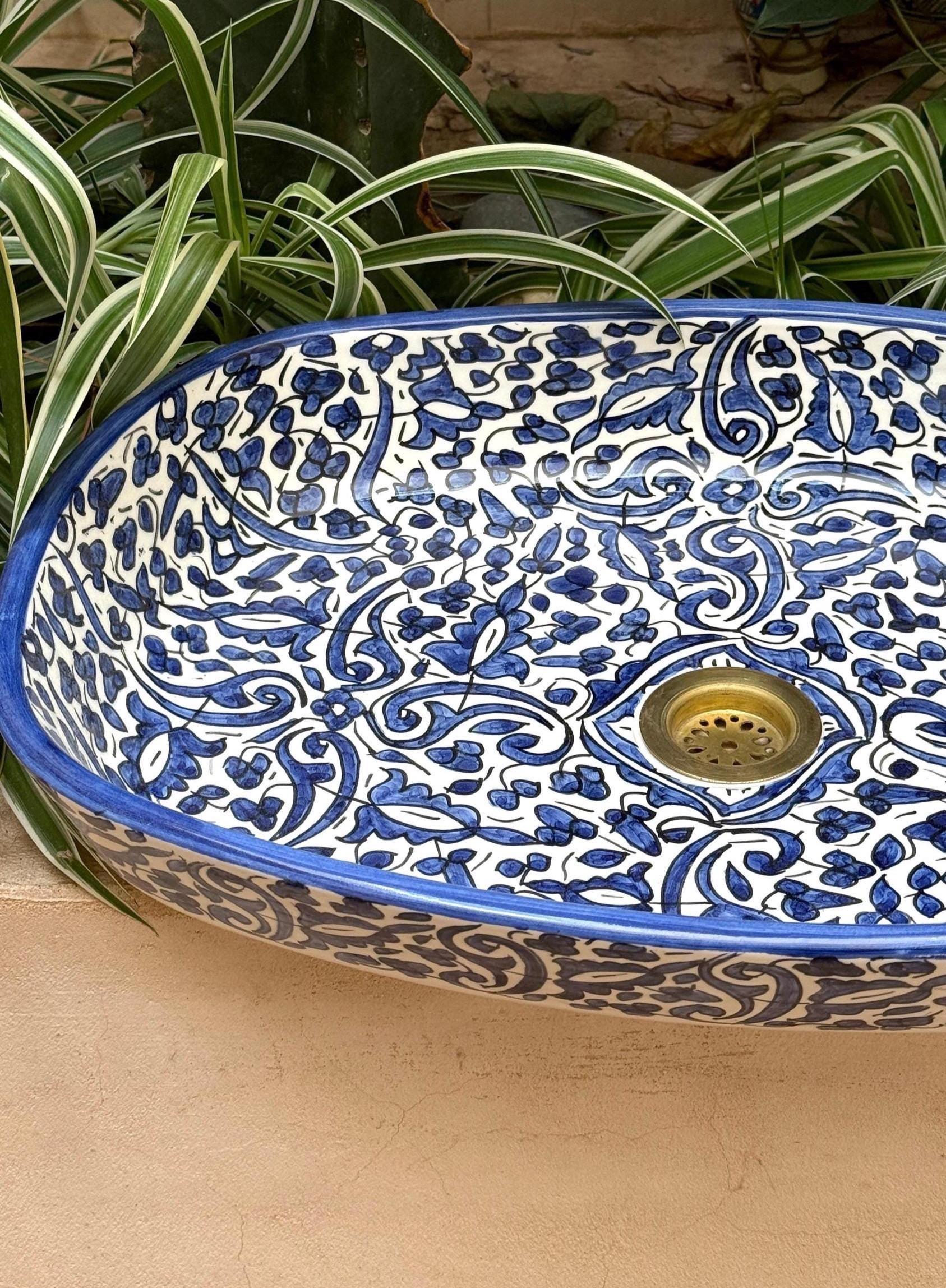Handmade Moroccan Ceramic Sink: Arabesque Design, Blue Oval Washbasin