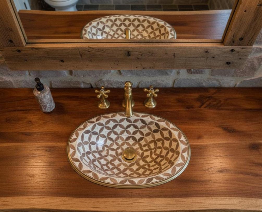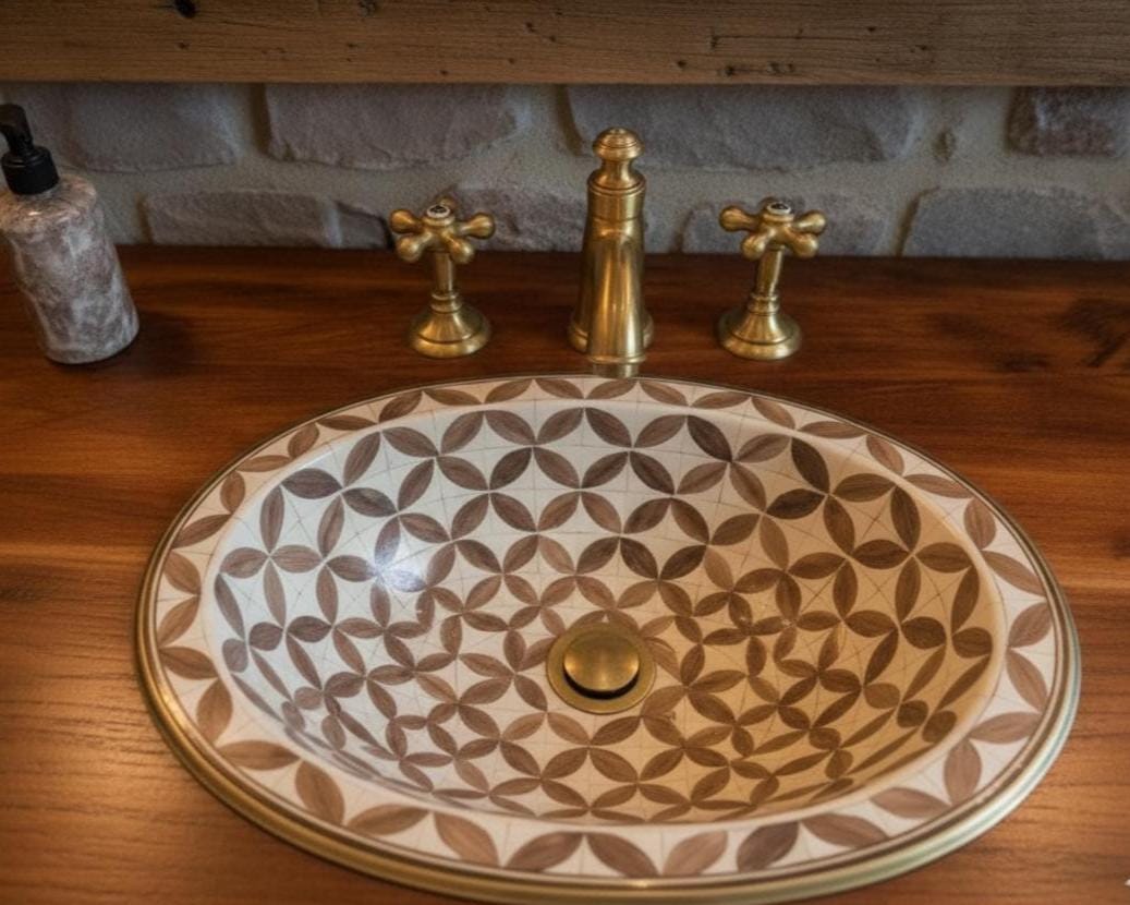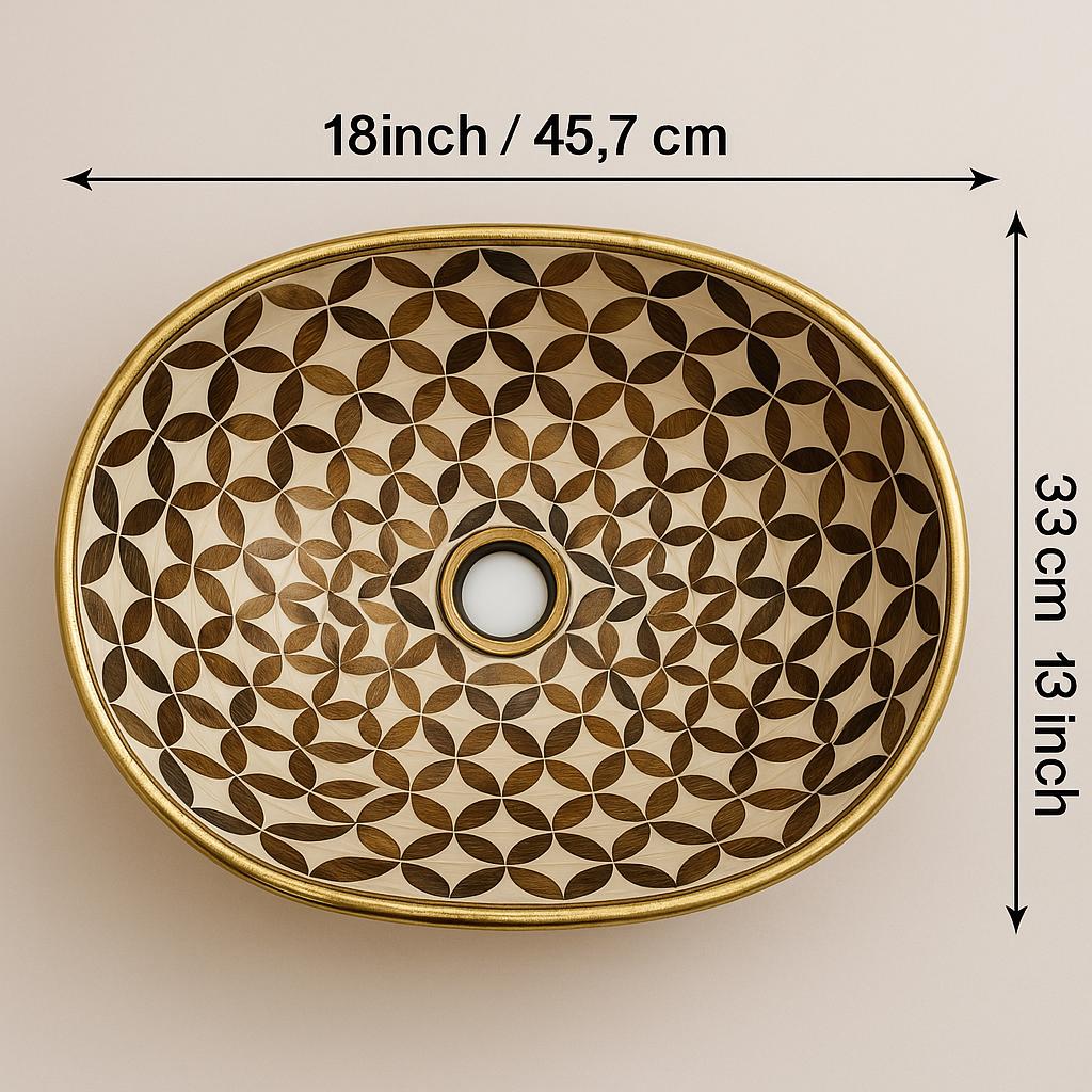 This sink is handcrafted from solid, unpolished brass, wood and premium carmen resin — durable materials chosen for their longevity and timeless appeal. Built to withstand years of daily use, this piece not only maintains its quality but also gains character and beauty over time. With its elegant oval shape and warm, antique finish, this sink is a striking addition to any modern or classic bathroom decor., kitchens, or powder rooms. Its timeless design adds a touch of Moroccan elegance to any space. The sink comes with Drain included for free. Each piece is truly unique, and as a result, minor imperfections are to be expected. If you need a different size, feel free to contact us.