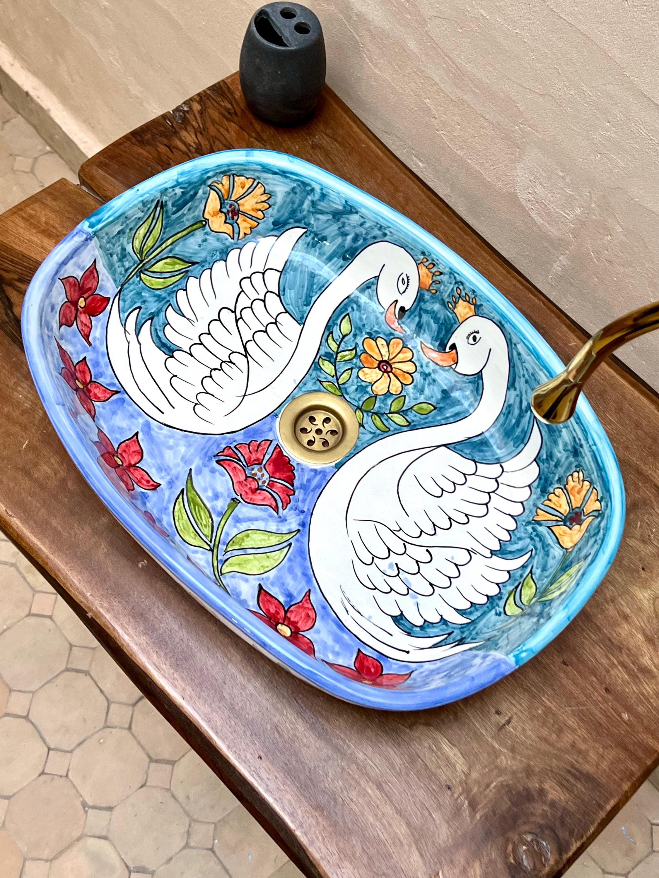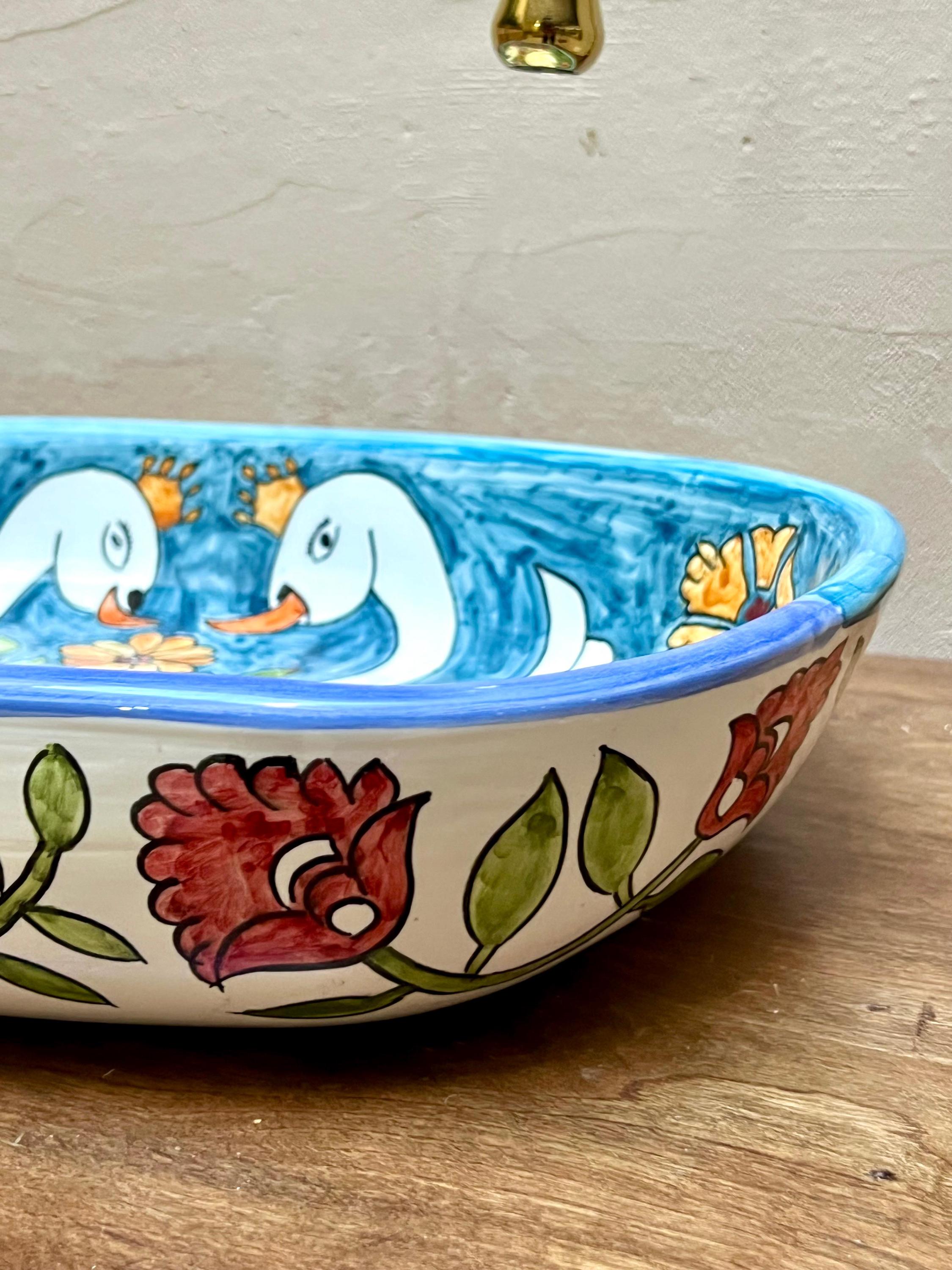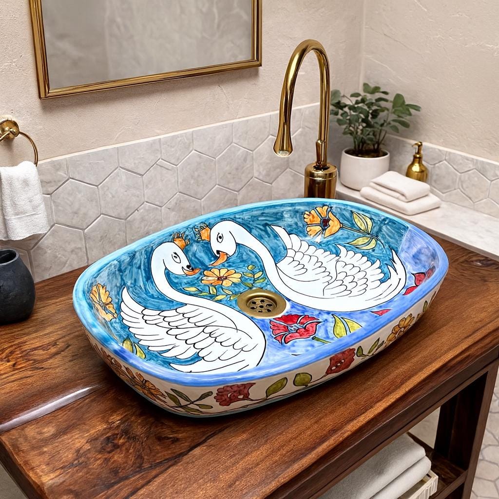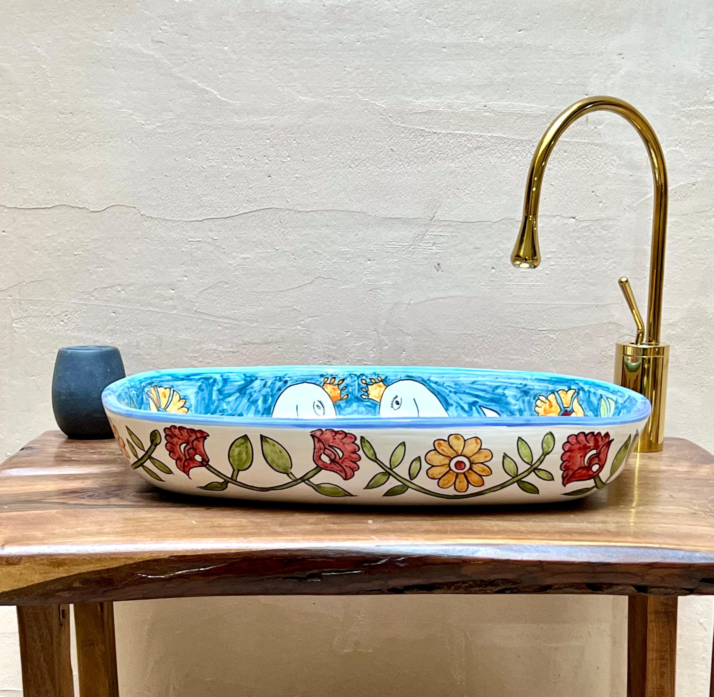 Handmade Moroccan Ceramic Sink: Queen Duck Floral Design, Oval Washbasin
