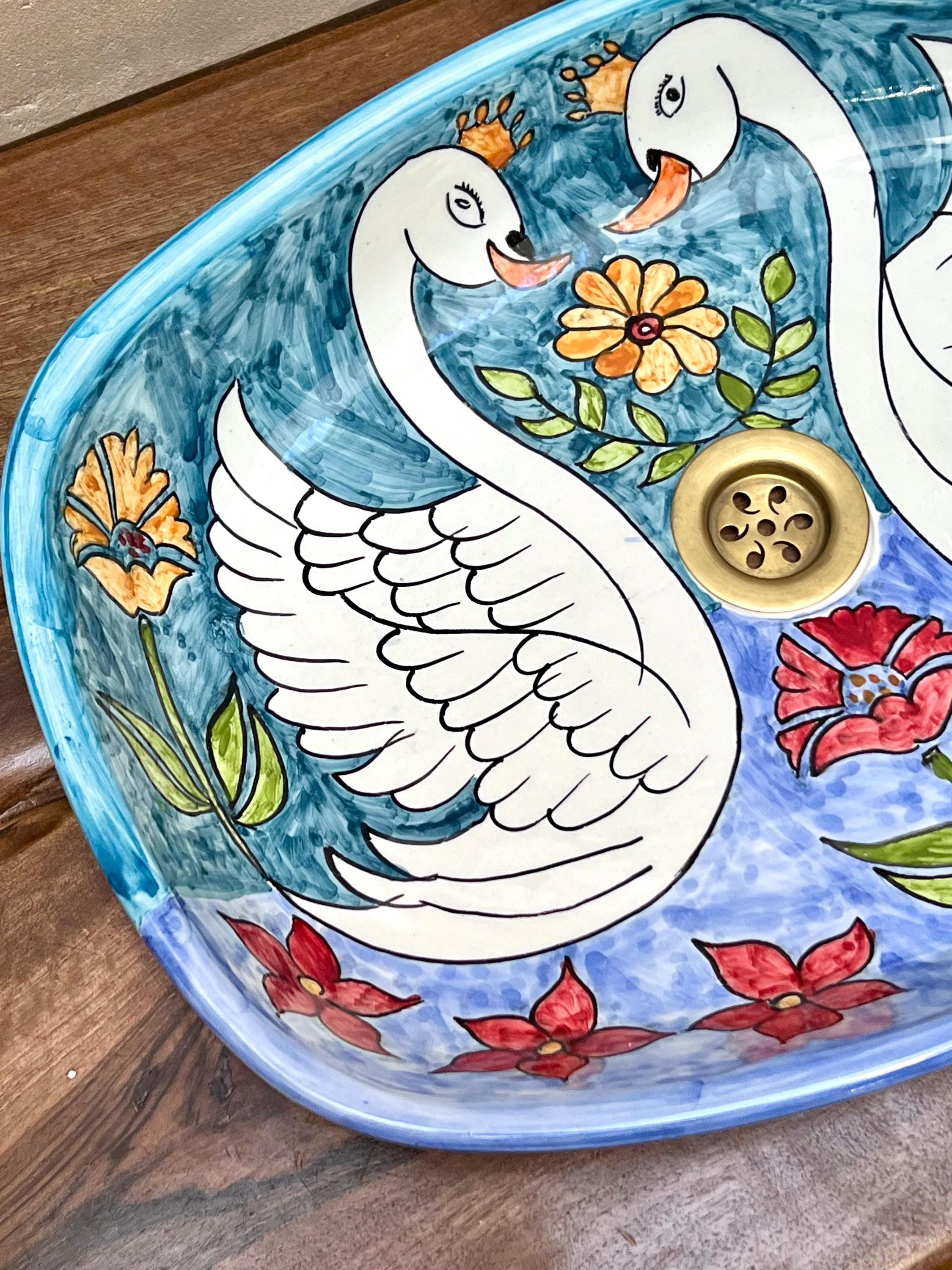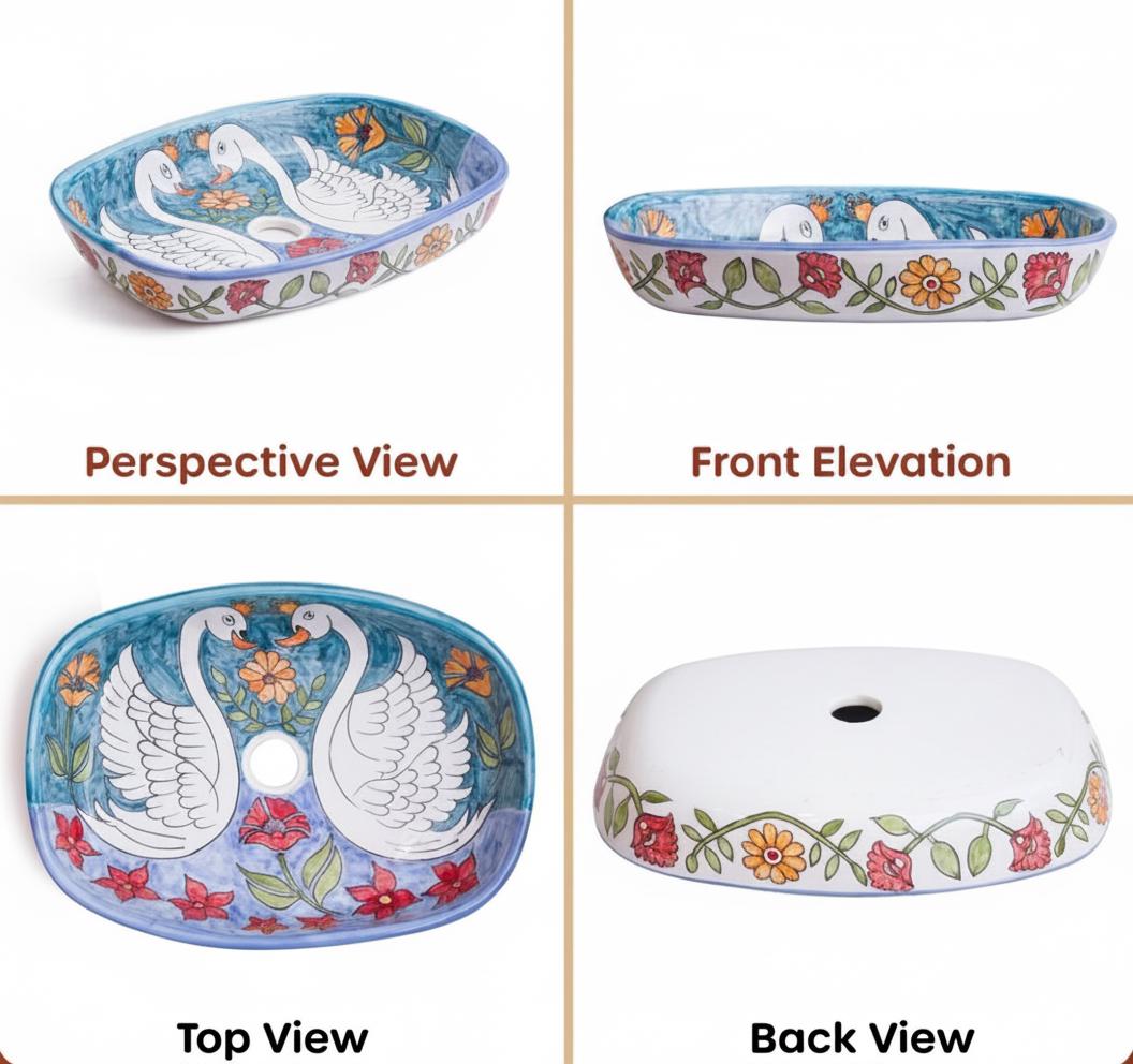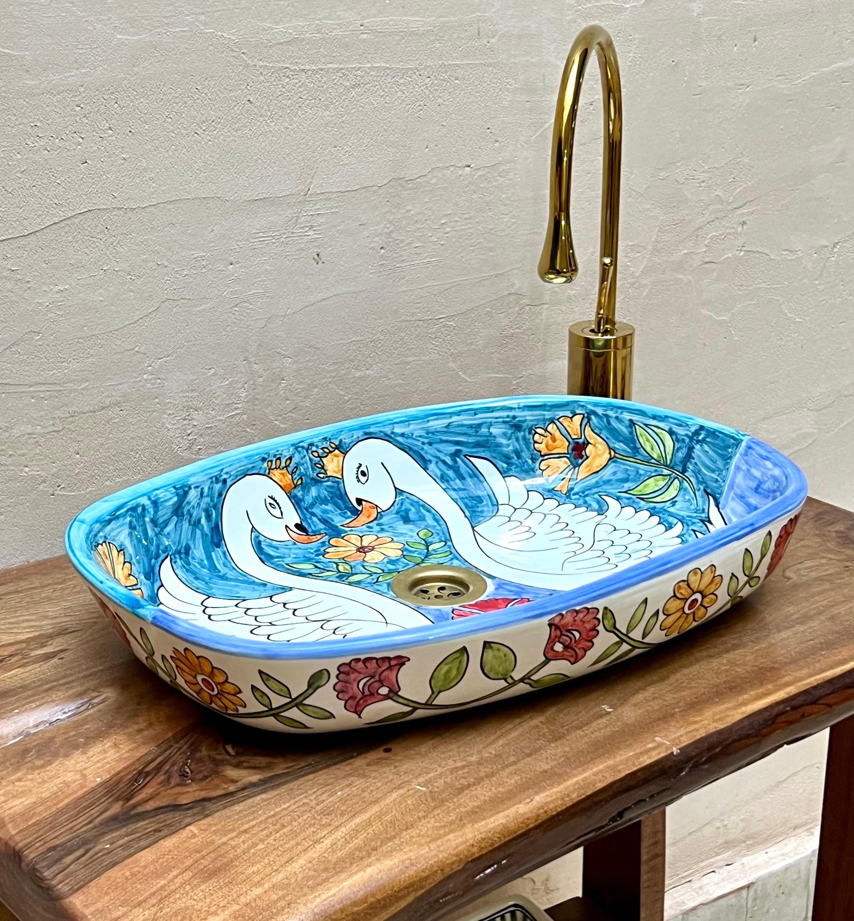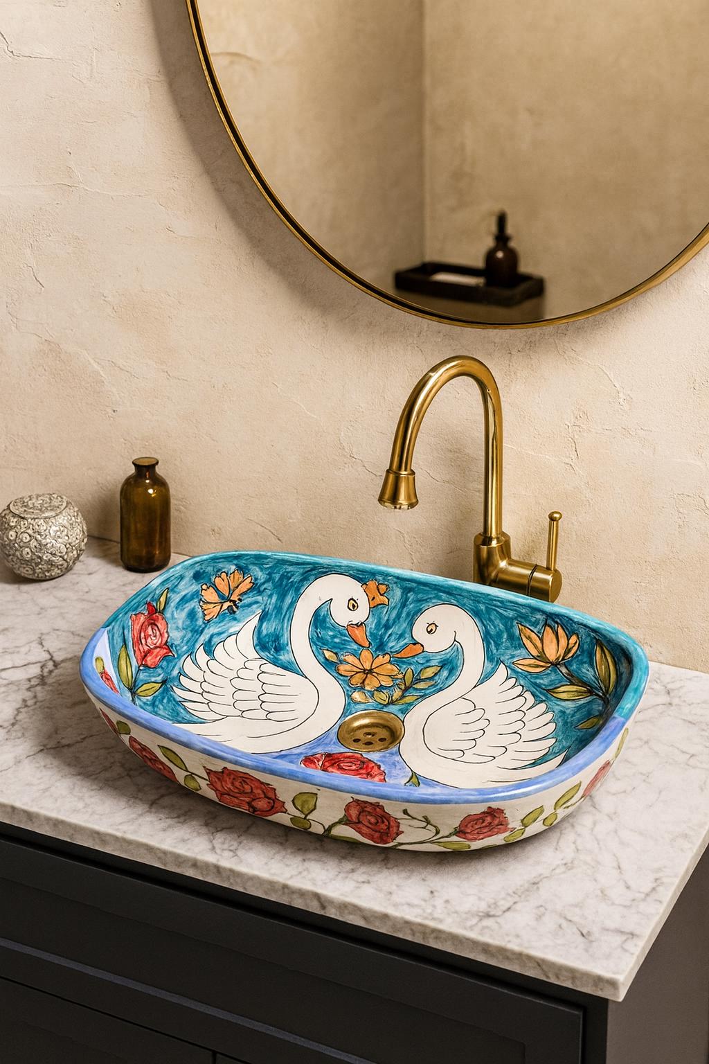 Handmade Moroccan Ceramic Sink: Queen Duck Floral Design, Oval Washbasin