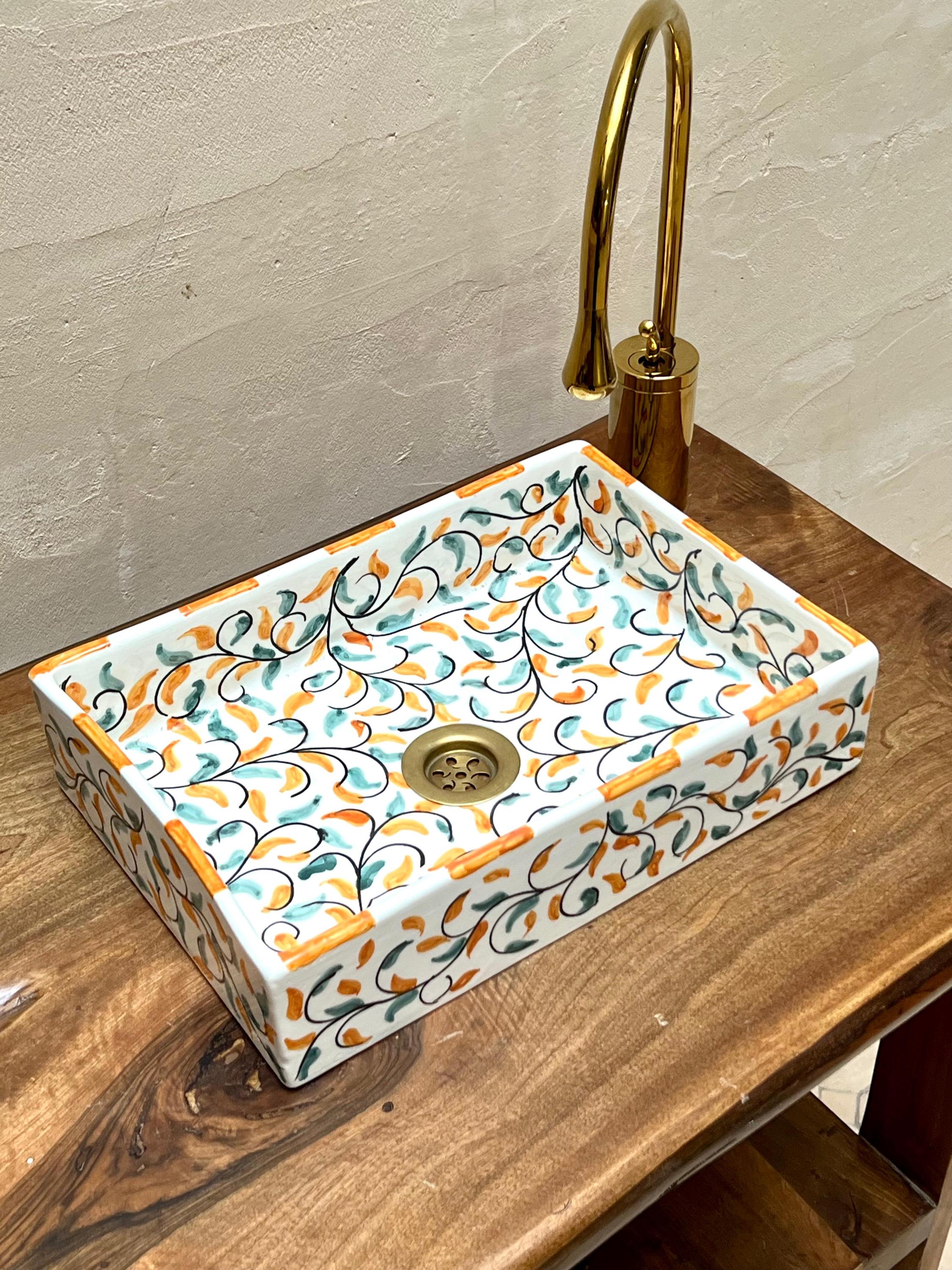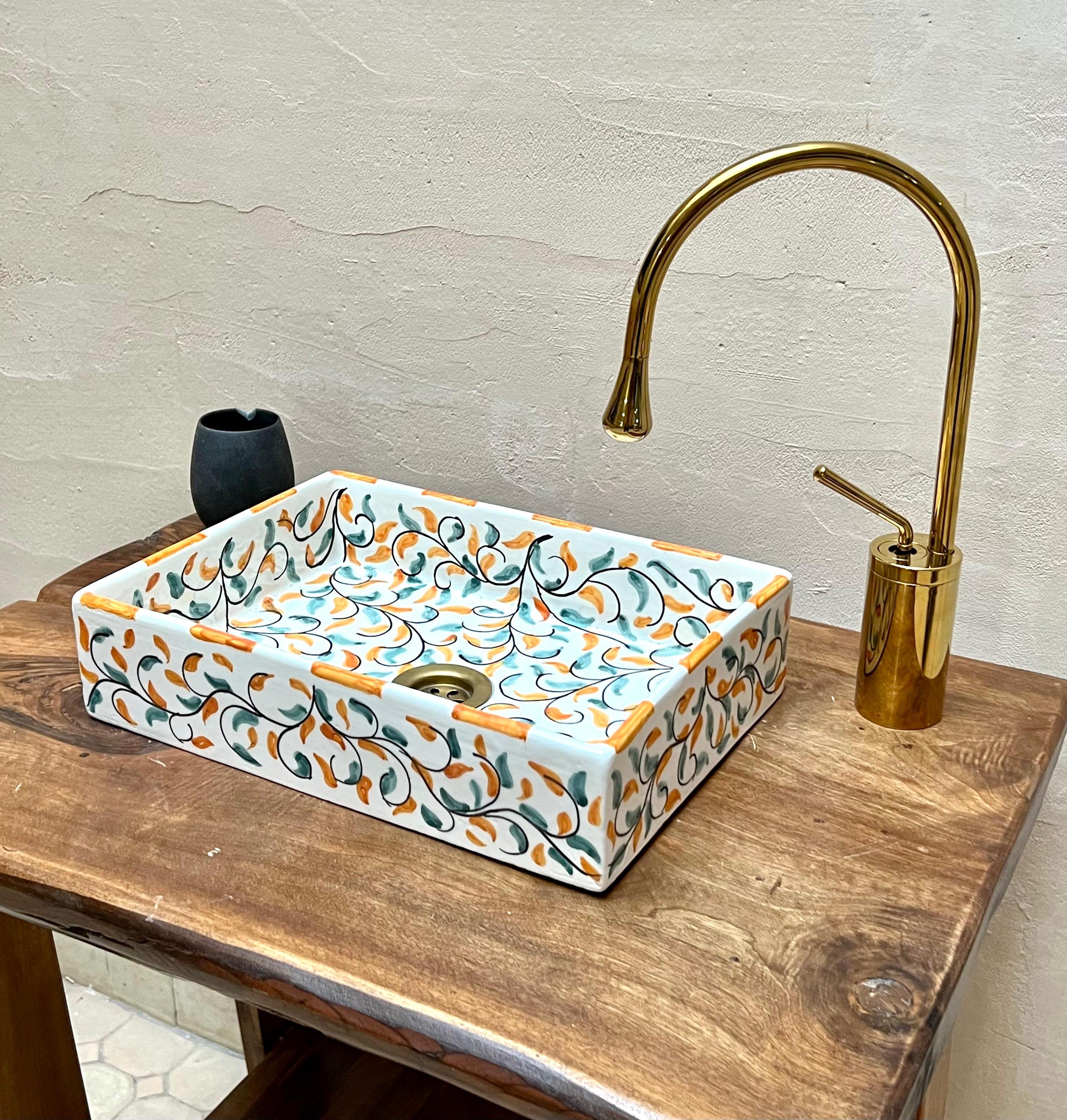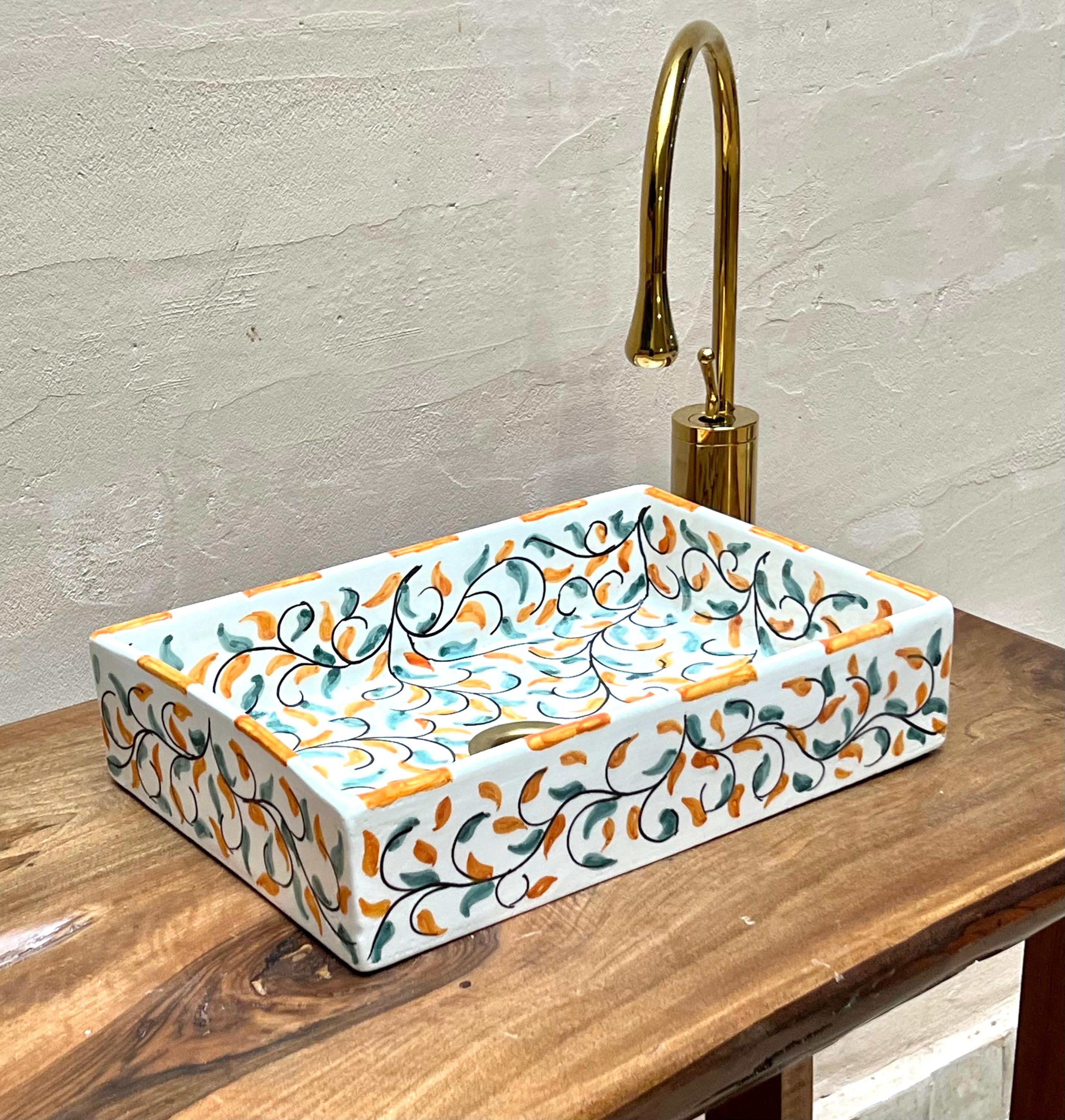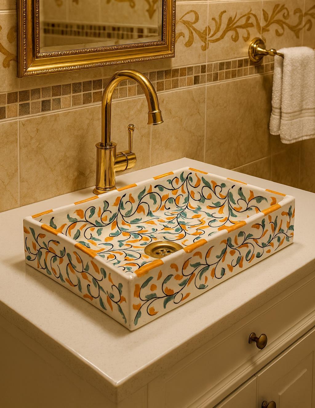 Handmade Moroccan Ceramic Sink: Leaf Design, Rectangular Washbasin