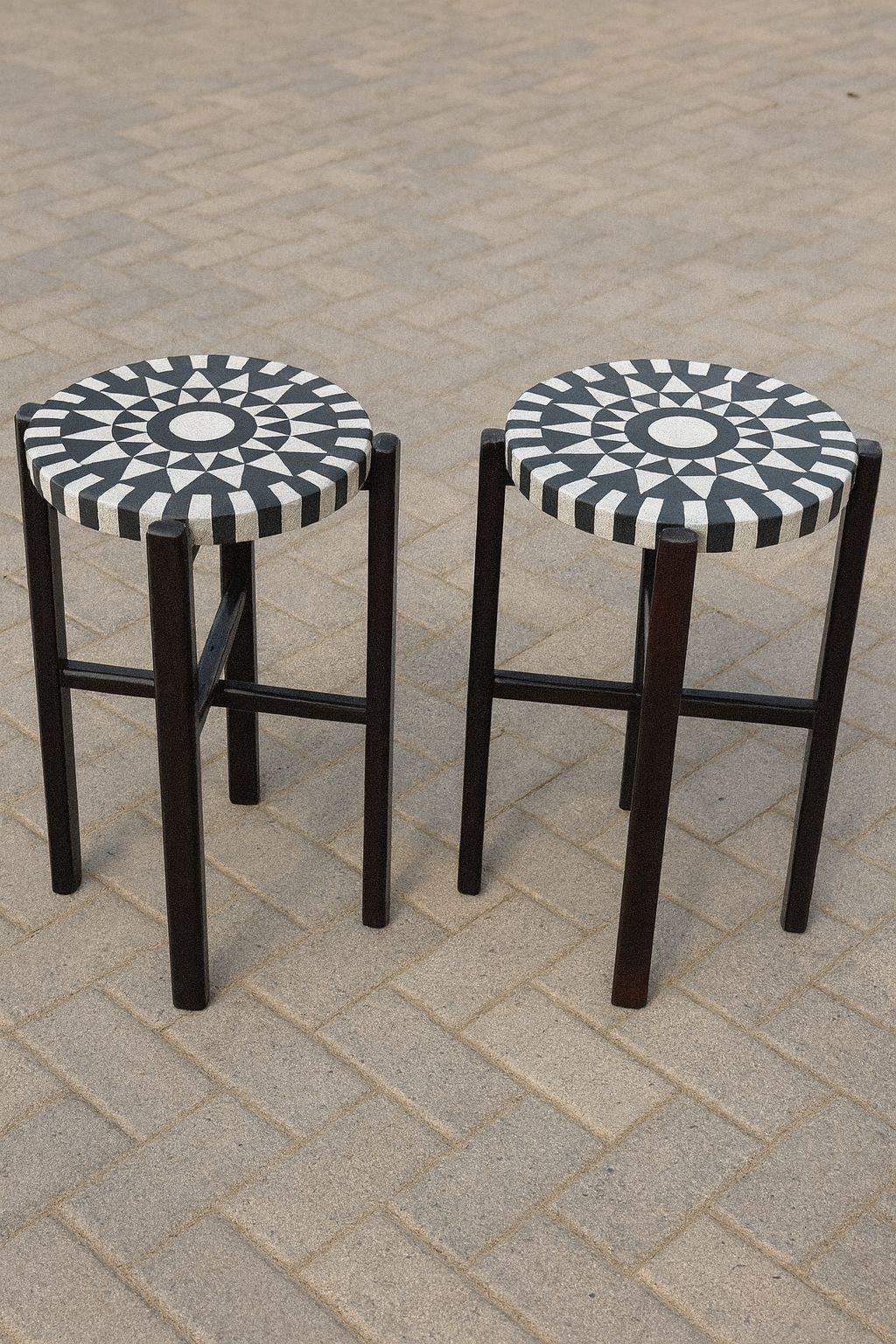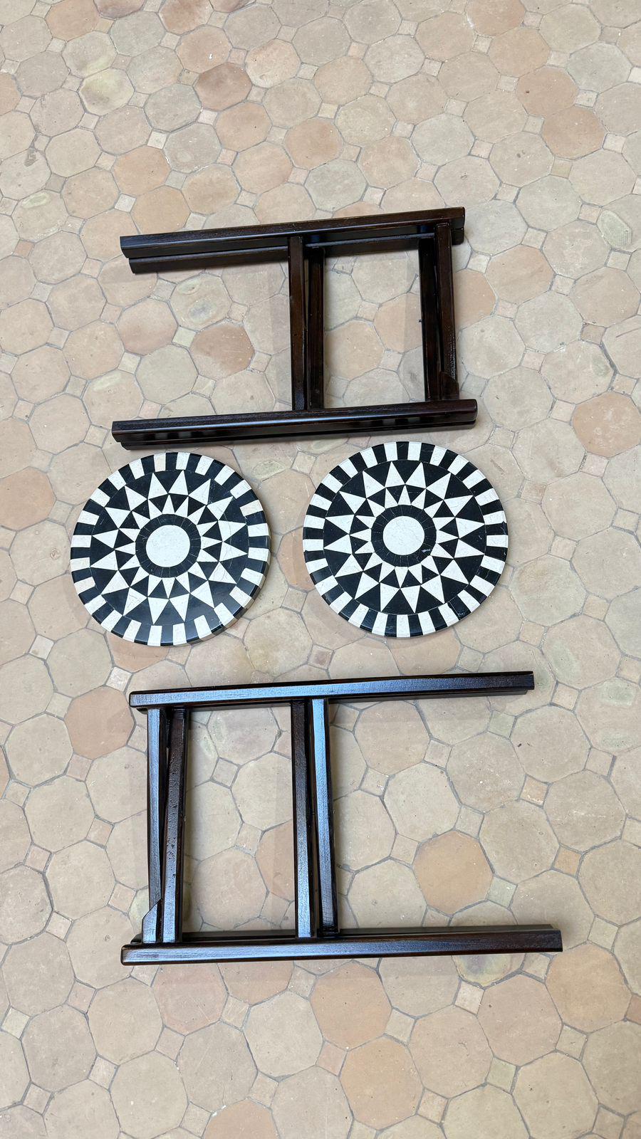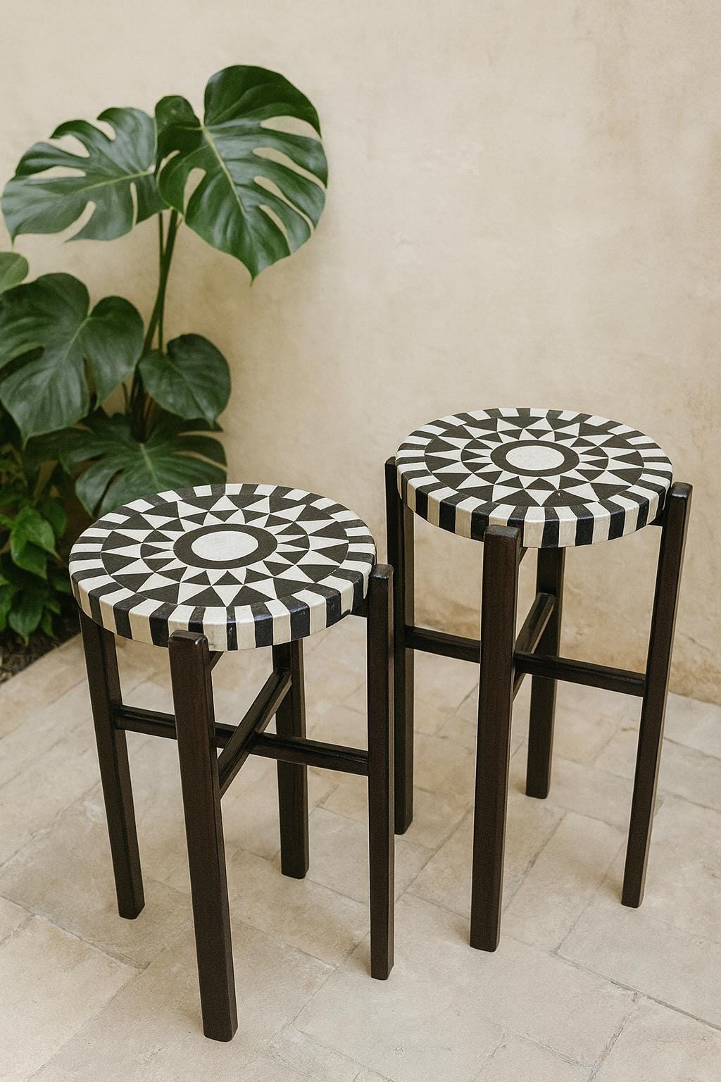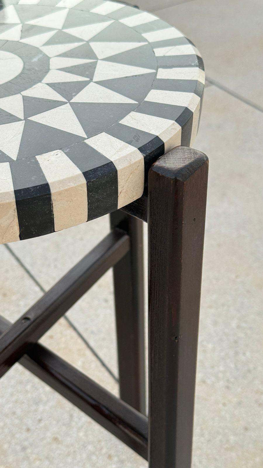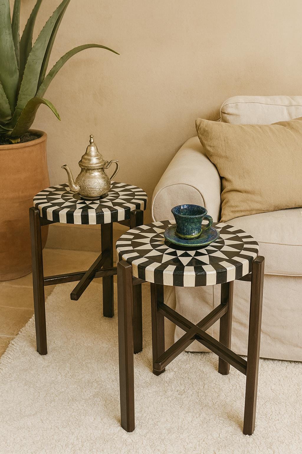 ✔ Diameter: 30cm ✔ Height: 57cm ✔ Marble Thickness: 3 cm (1.1 inches) ✔ Origin: Handcrafted in Fez, Morocco ✔ Materials: Natural marble top with wooden legs ✔ Color: Black & white marble tray with foldable wooden legs in black ✔ Leg Options: Prefer fixed metal legs? Contact us for customization. ✔ Shipping with FedEx or DHL In 2-4 Days ⫷DESCRIPTION⫸