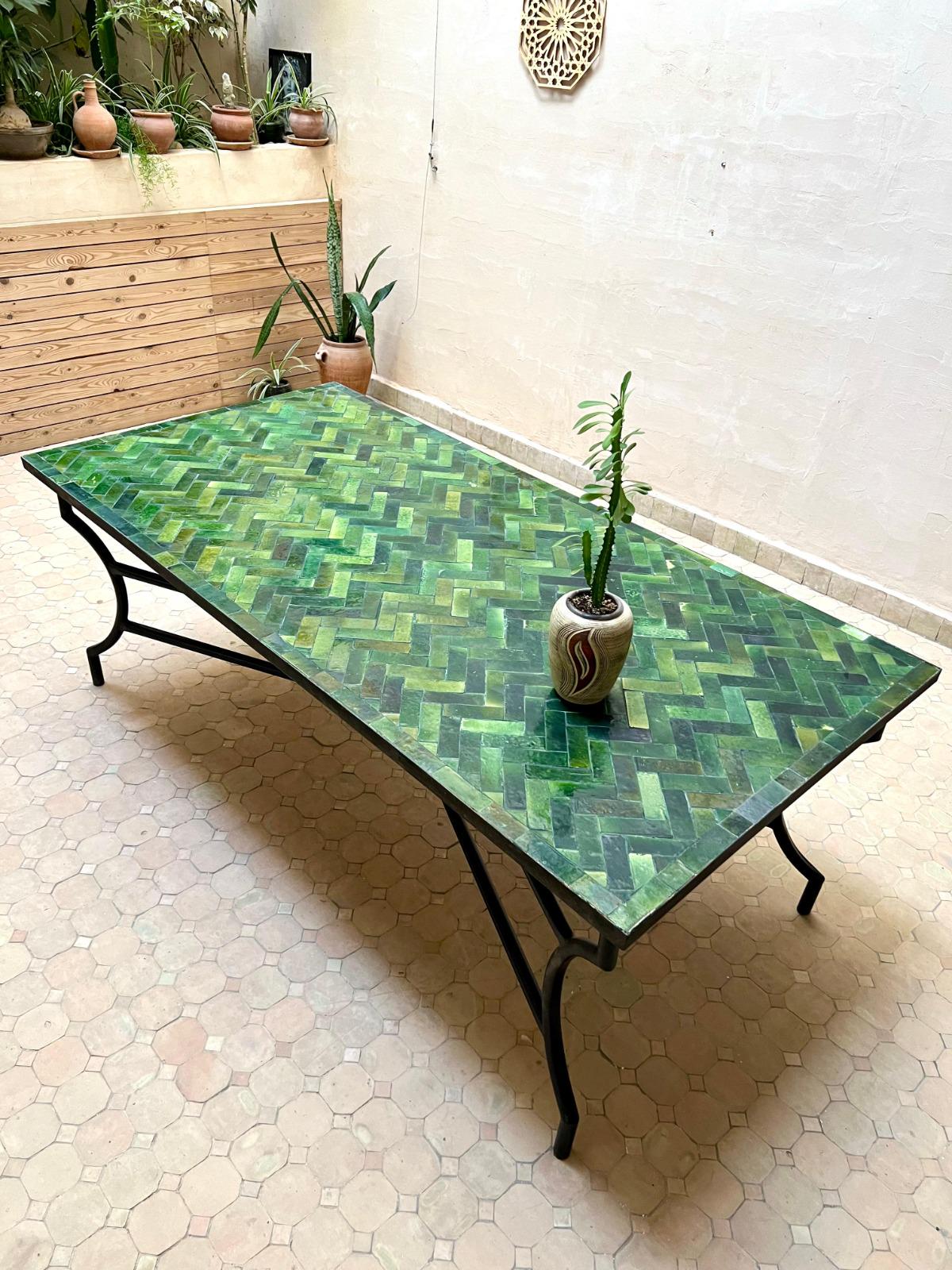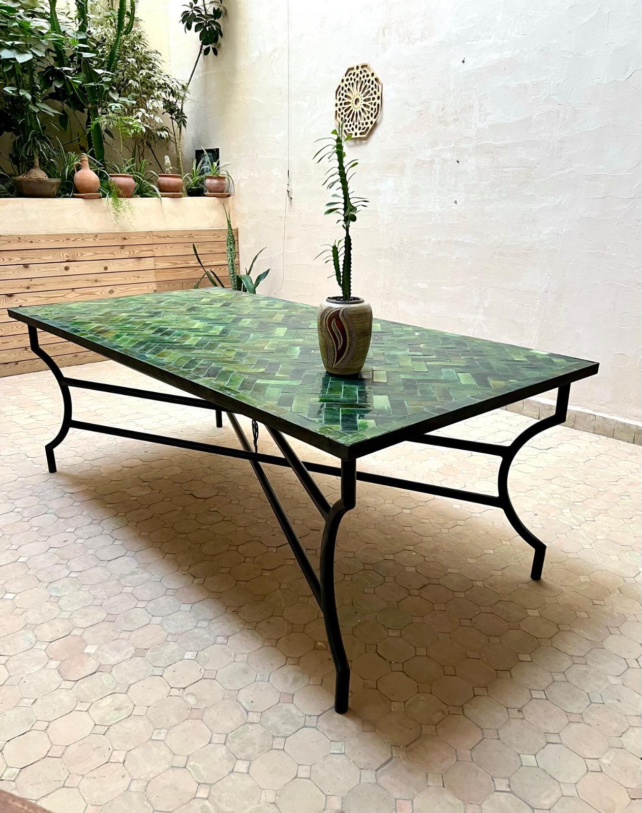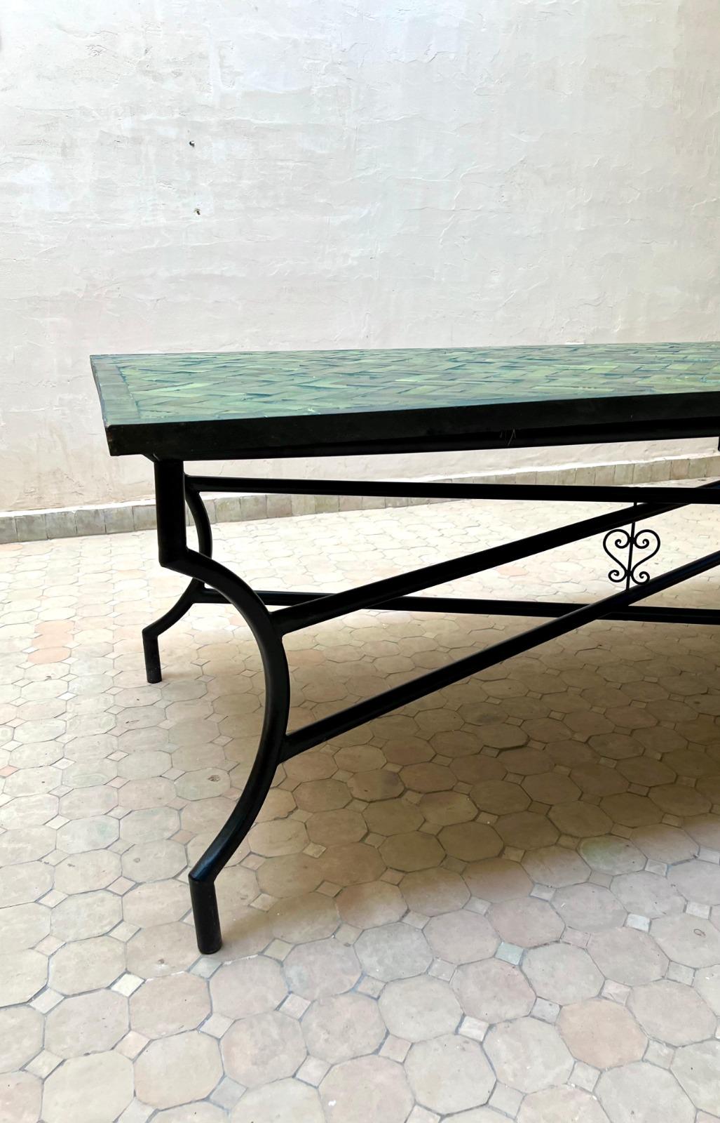 This Moroccan Tamegroute mosaic table features a beautiful rectangular shape handcrafted with deep green tiles, each glazed naturally for a unique texture and shine. Made by skilled artisans in Morocco, it brings authentic charm and rich earthy tones to any space. The solid iron base adds durability, making it perfect for patios, gardens, dining areas, or indoor décor. A timeless piece that blends traditional Moroccan artistry with elegant style.