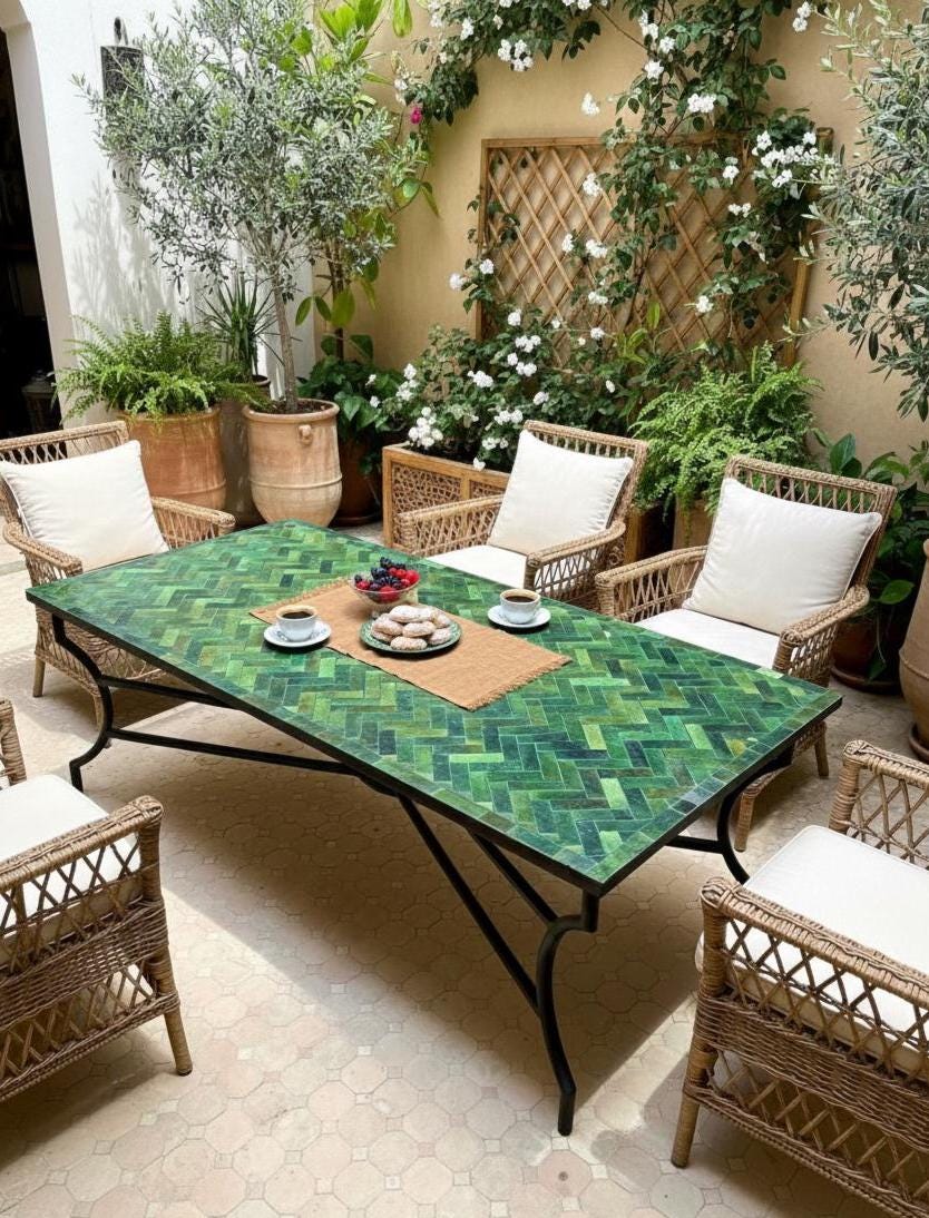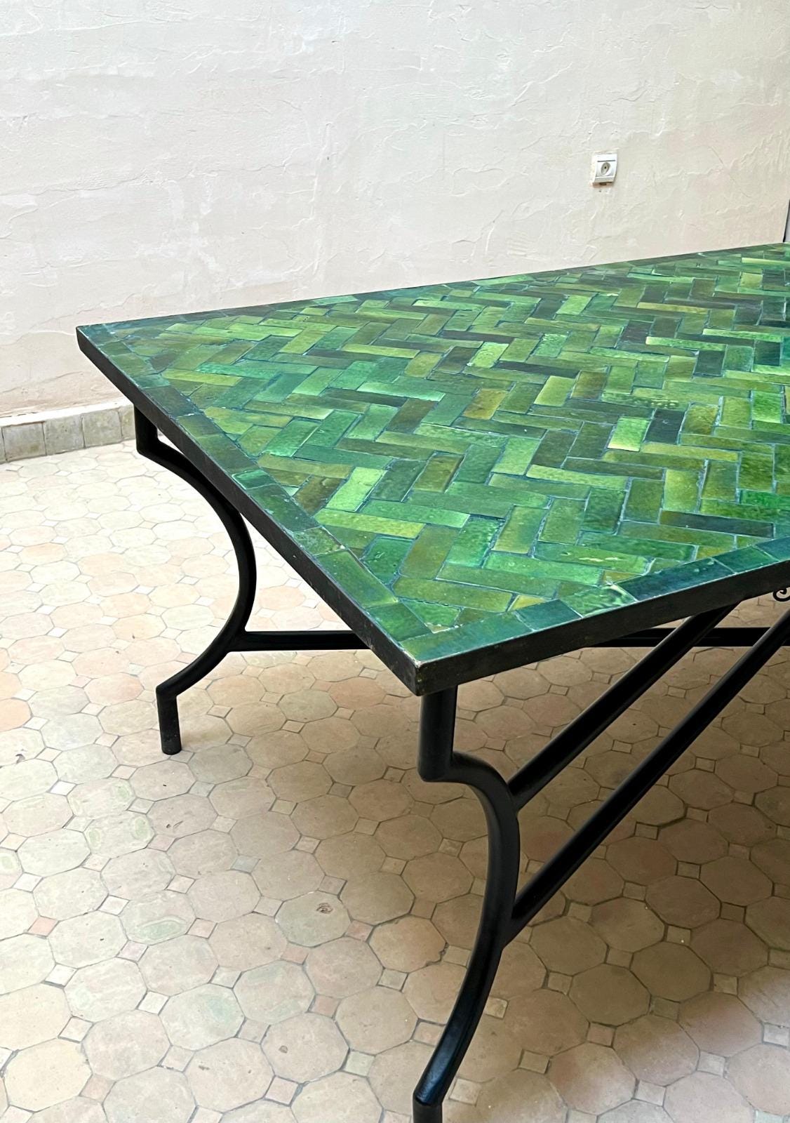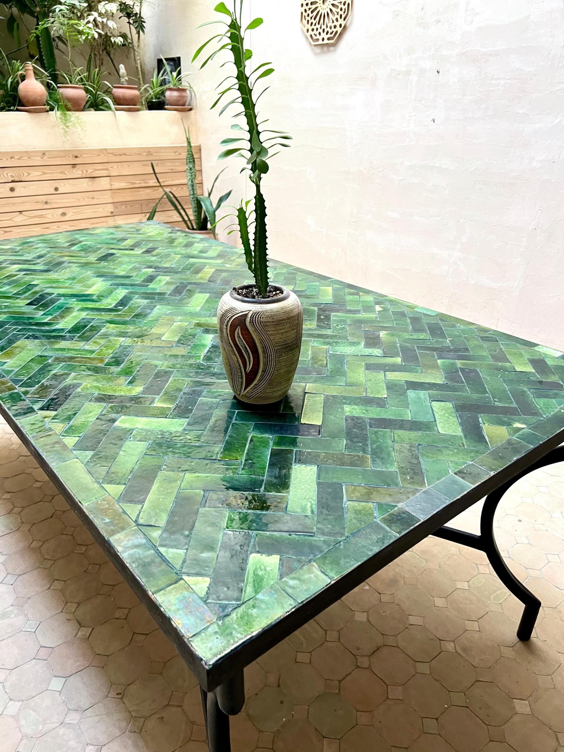 This Moroccan Tamegroute mosaic table features a beautiful rectangular shape handcrafted with deep green tiles, each glazed naturally for a unique texture and shine. Made by skilled artisans in Morocco, it brings authentic charm and rich earthy tones to any space. The solid iron base adds durability, making it perfect for patios, gardens, dining areas, or indoor décor. A timeless piece that blends traditional Moroccan artistry with elegant style.