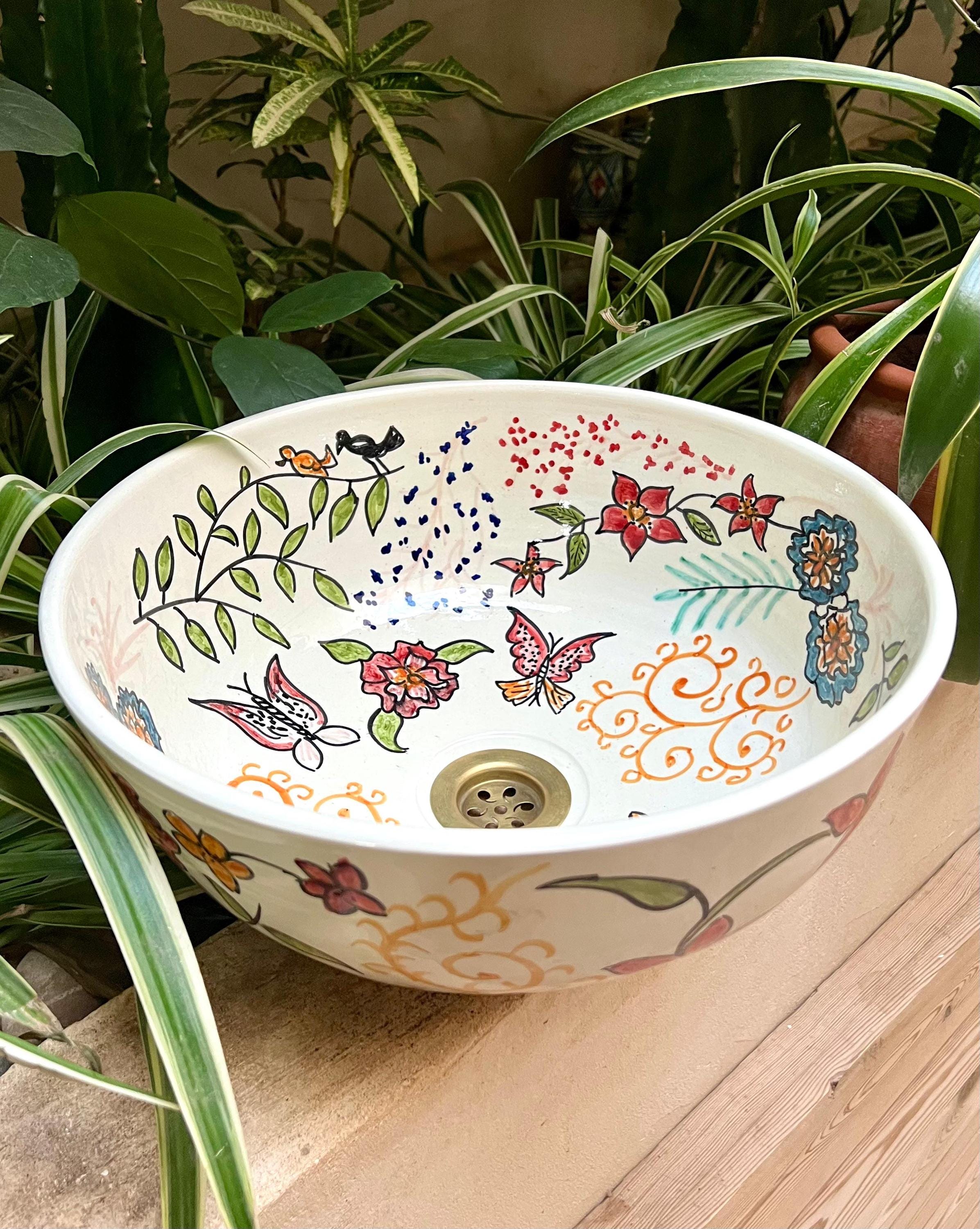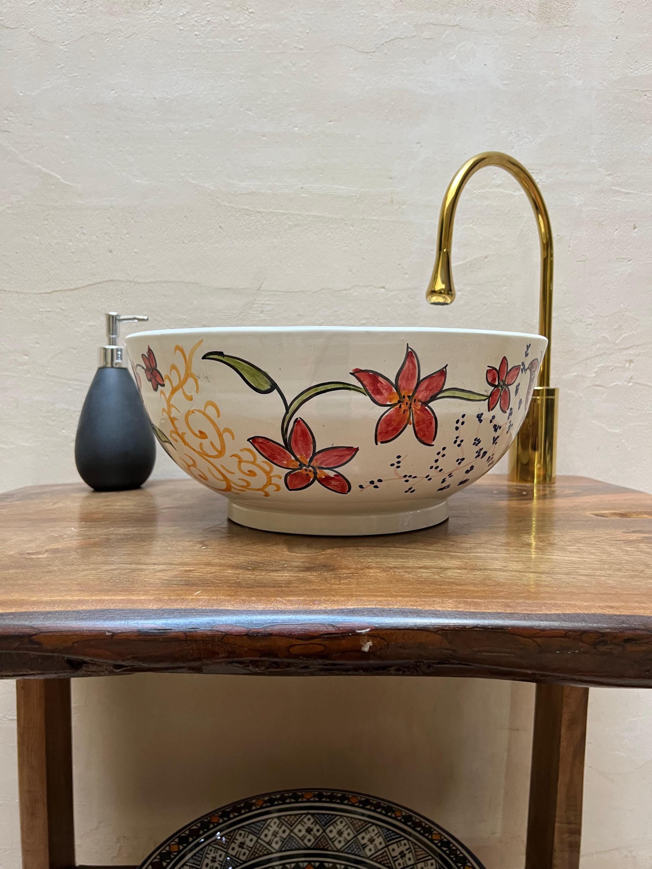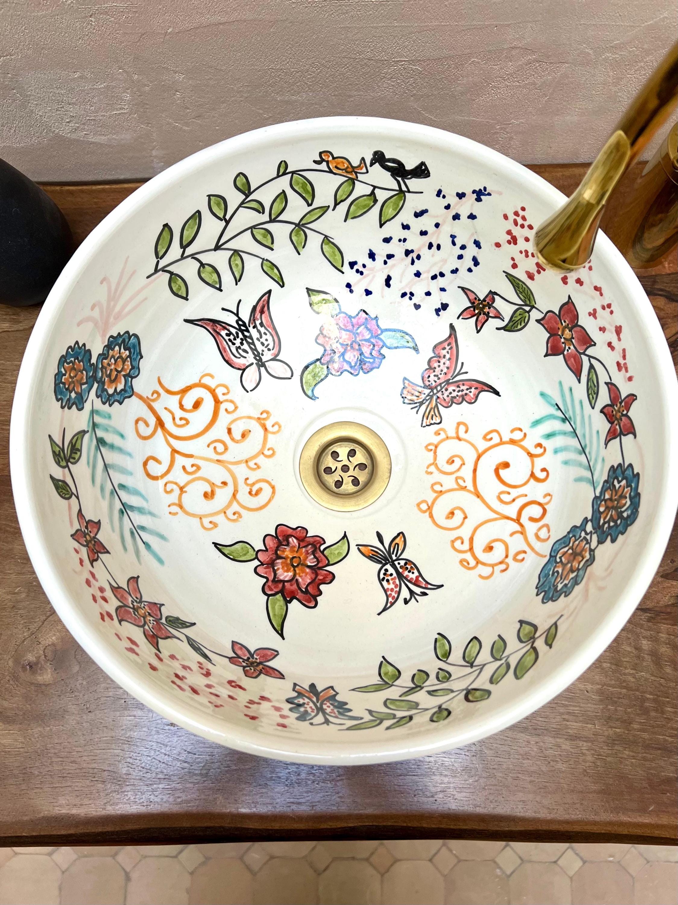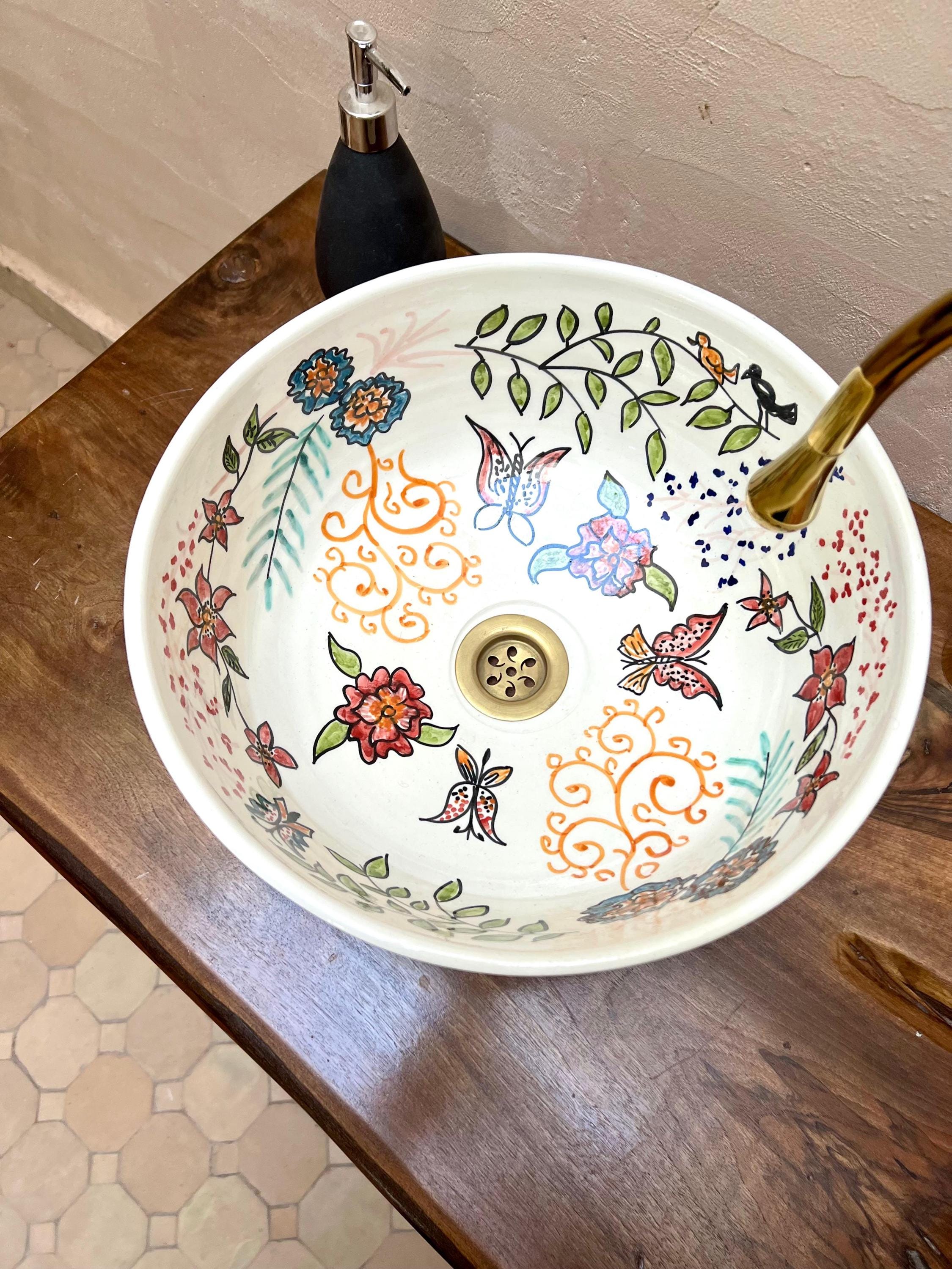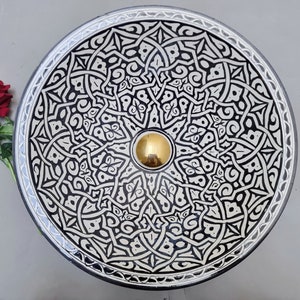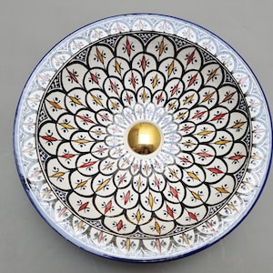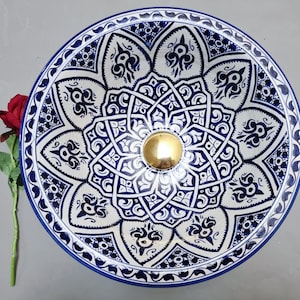 This beautiful Moroccan round ceramic sink is handcrafted by skilled artisans in Fes, made from high-quality clay, and features intricate hand-painted designs with a smooth glazed finish. Made from high-quality ceramic, it is durable, easy to clean, and perfect for bathrooms, kitchens, or powder rooms. Its timeless design adds a touch of Moroccan elegance to any space. The sink comes with both silver and copper drains included for free. Each piece is truly unique, and as a result, minor imperfections are to be expected. If you need a different size, feel free to contact us.