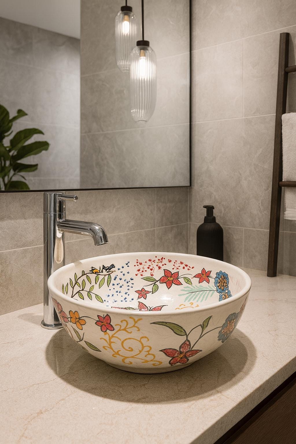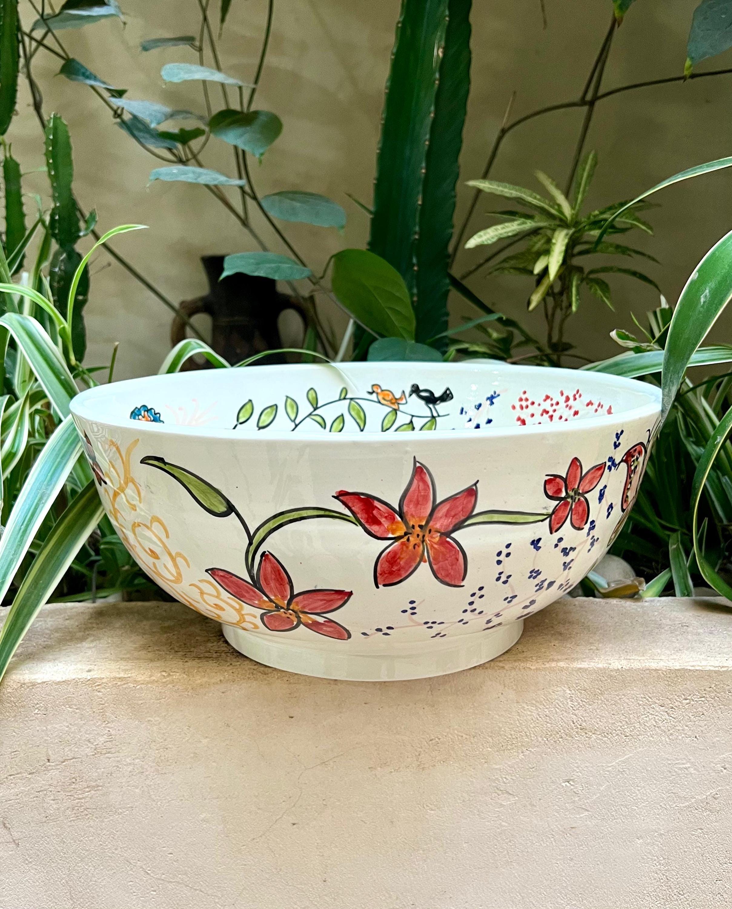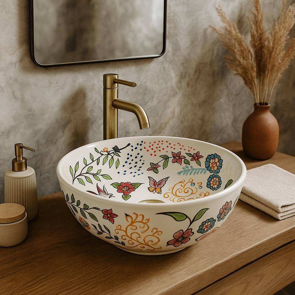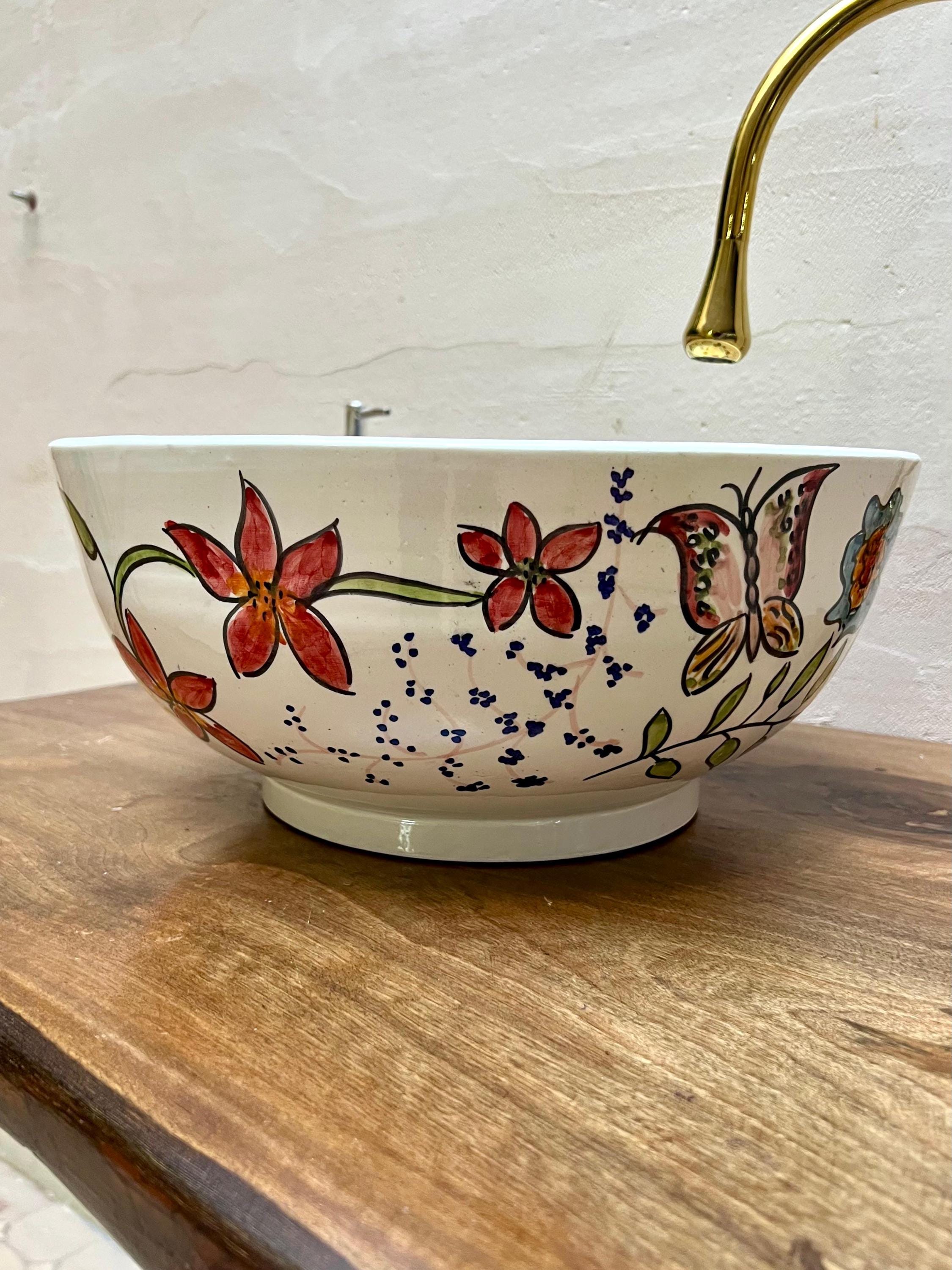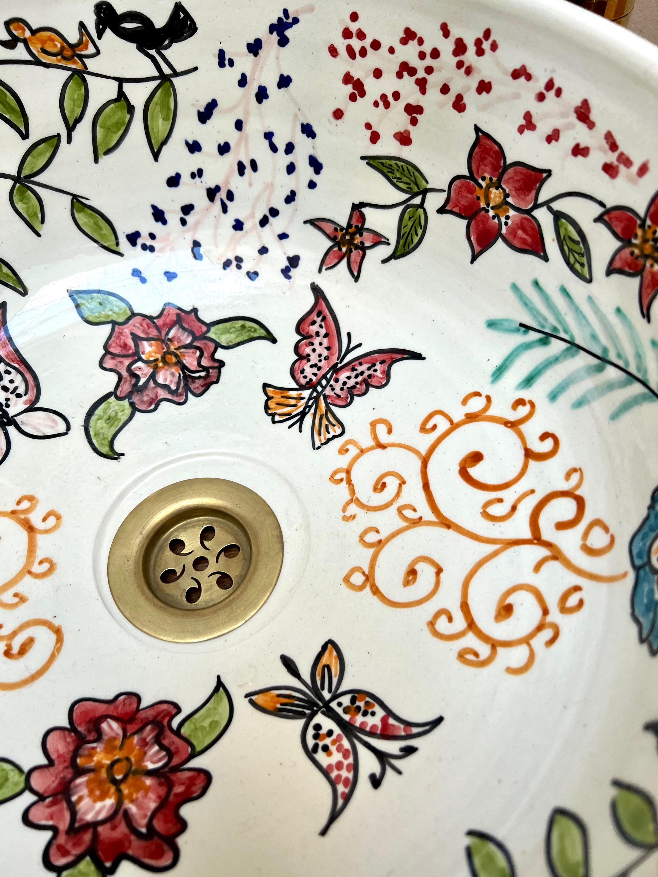 This beautiful Moroccan round ceramic sink is handcrafted by skilled artisans in Fes, made from high-quality clay, and features intricate hand-painted designs with a smooth glazed finish. Made from high-quality ceramic, it is durable, easy to clean, and perfect for bathrooms, kitchens, or powder rooms. Its timeless design adds a touch of Moroccan elegance to any space. The sink comes with both silver and copper drains included for free. Each piece is truly unique, and as a result, minor imperfections are to be expected. If you need a different size, feel free to contact us.