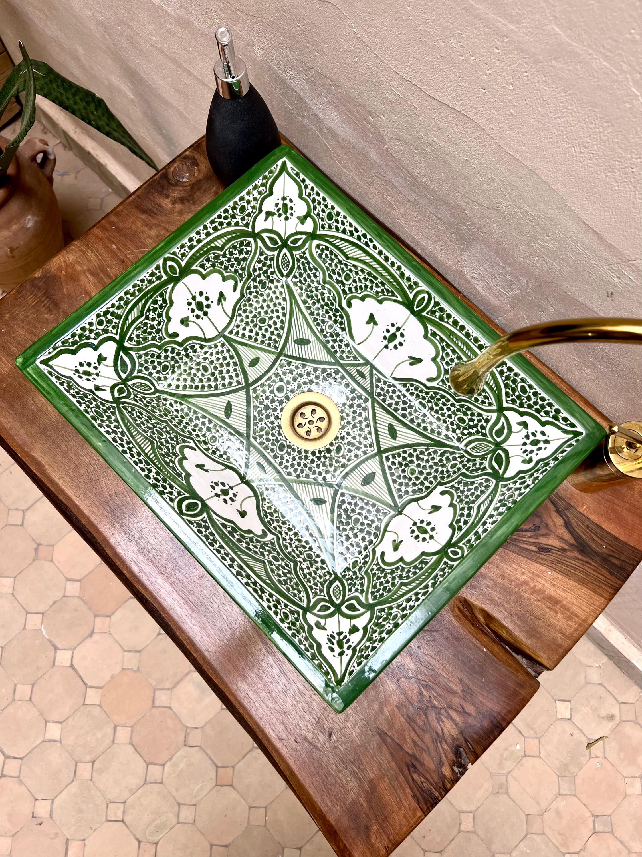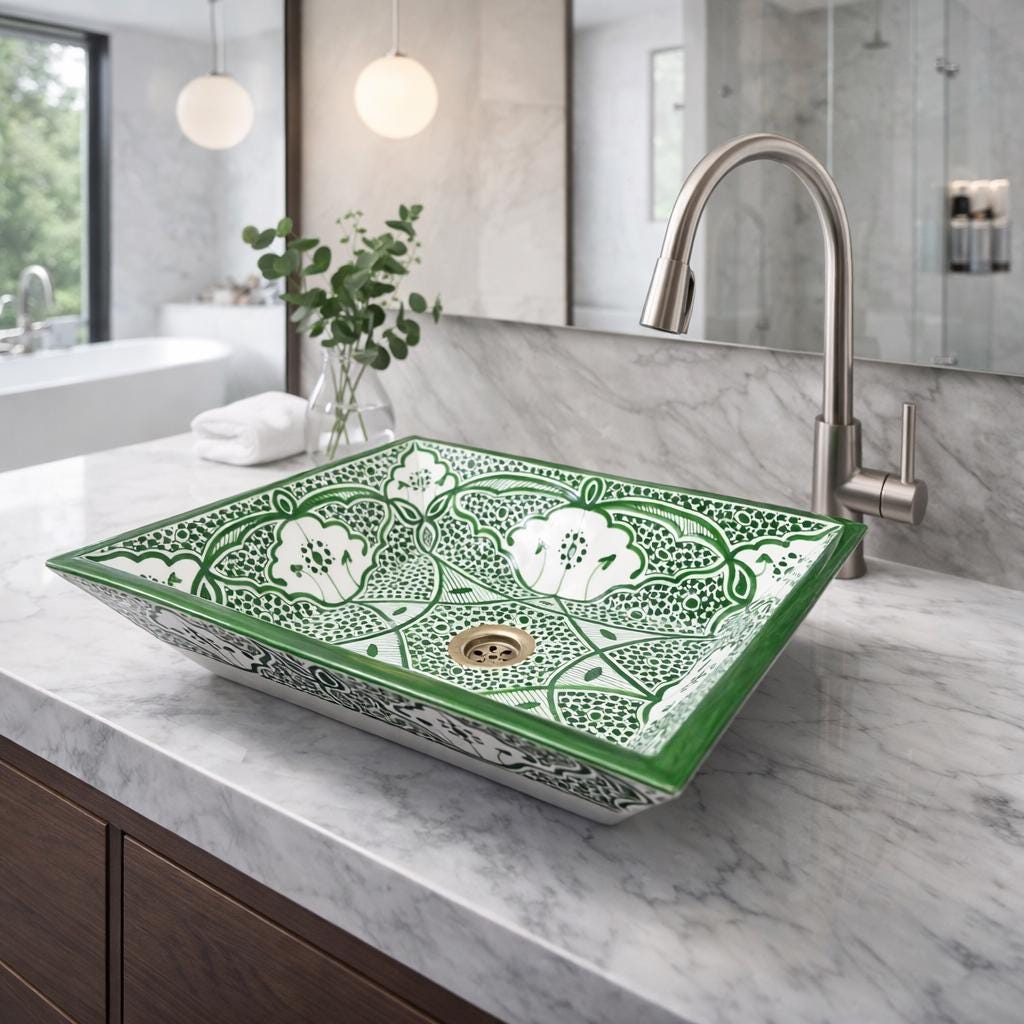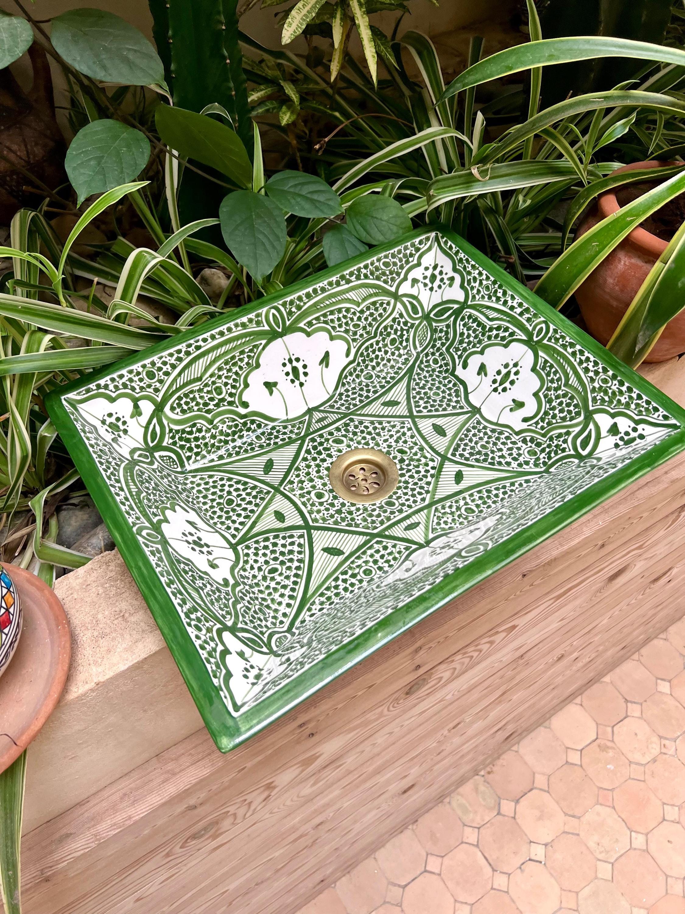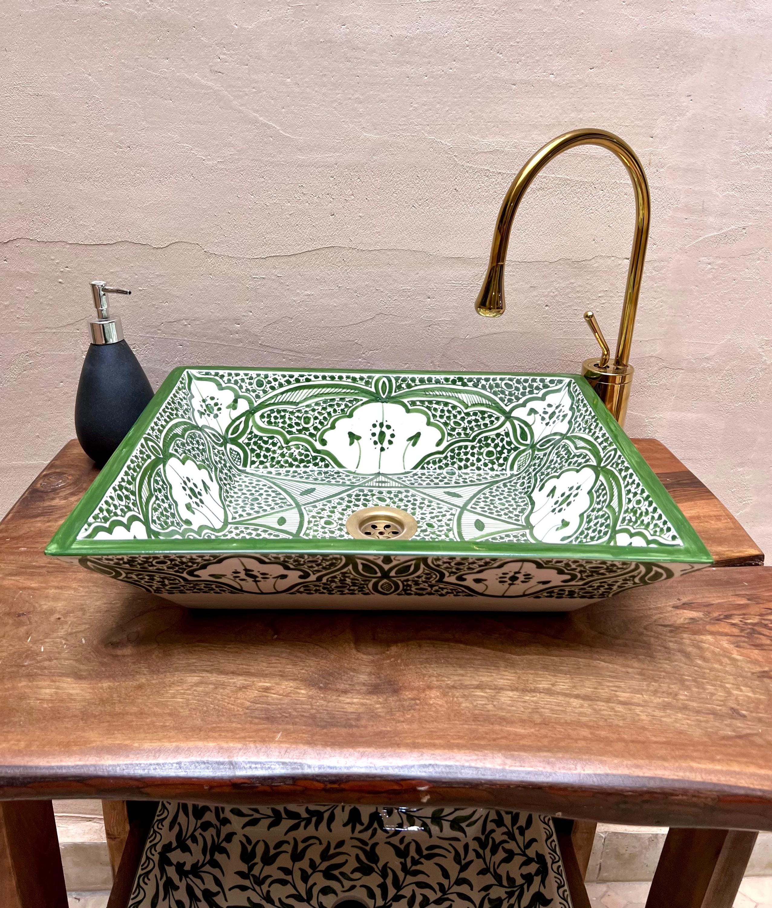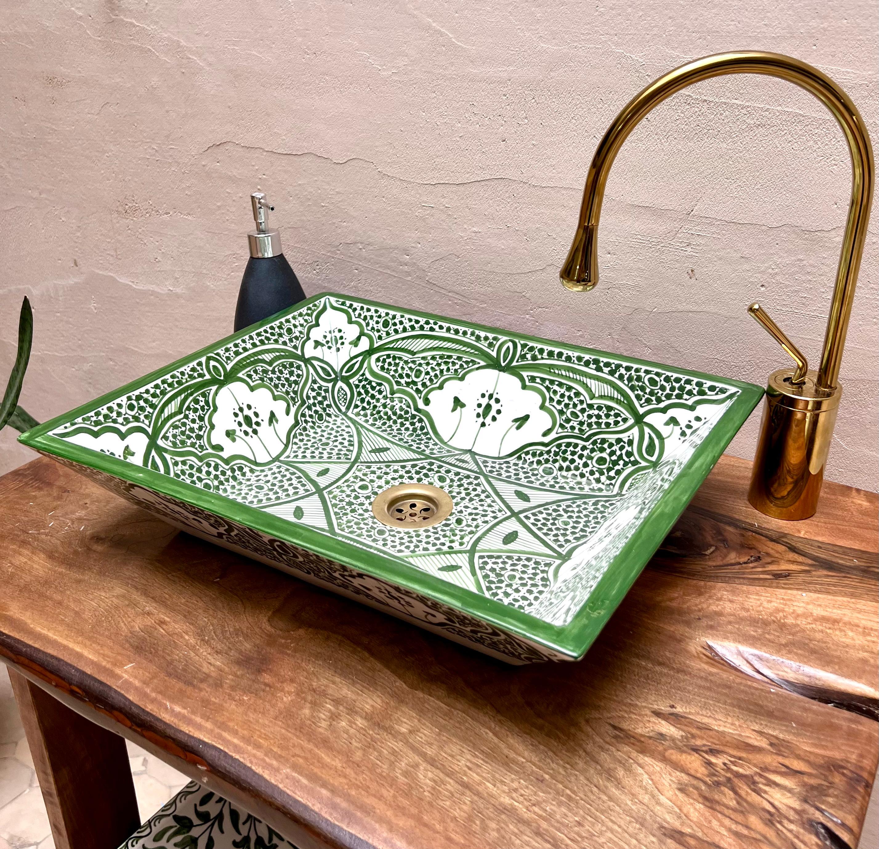 This beautiful Moroccan rectangular sink is handmade by skilled artisans using high-quality ceramic. Featuring traditional hand-painted designs and a smooth glazed finish, it is both durable and easy to clean. Perfect for kitchens, bathrooms, or powder rooms, it adds a unique touch of Moroccan charm to any space. The sink comes with both silver and copper drains included for free. If you need a different size, feel free to contact us.