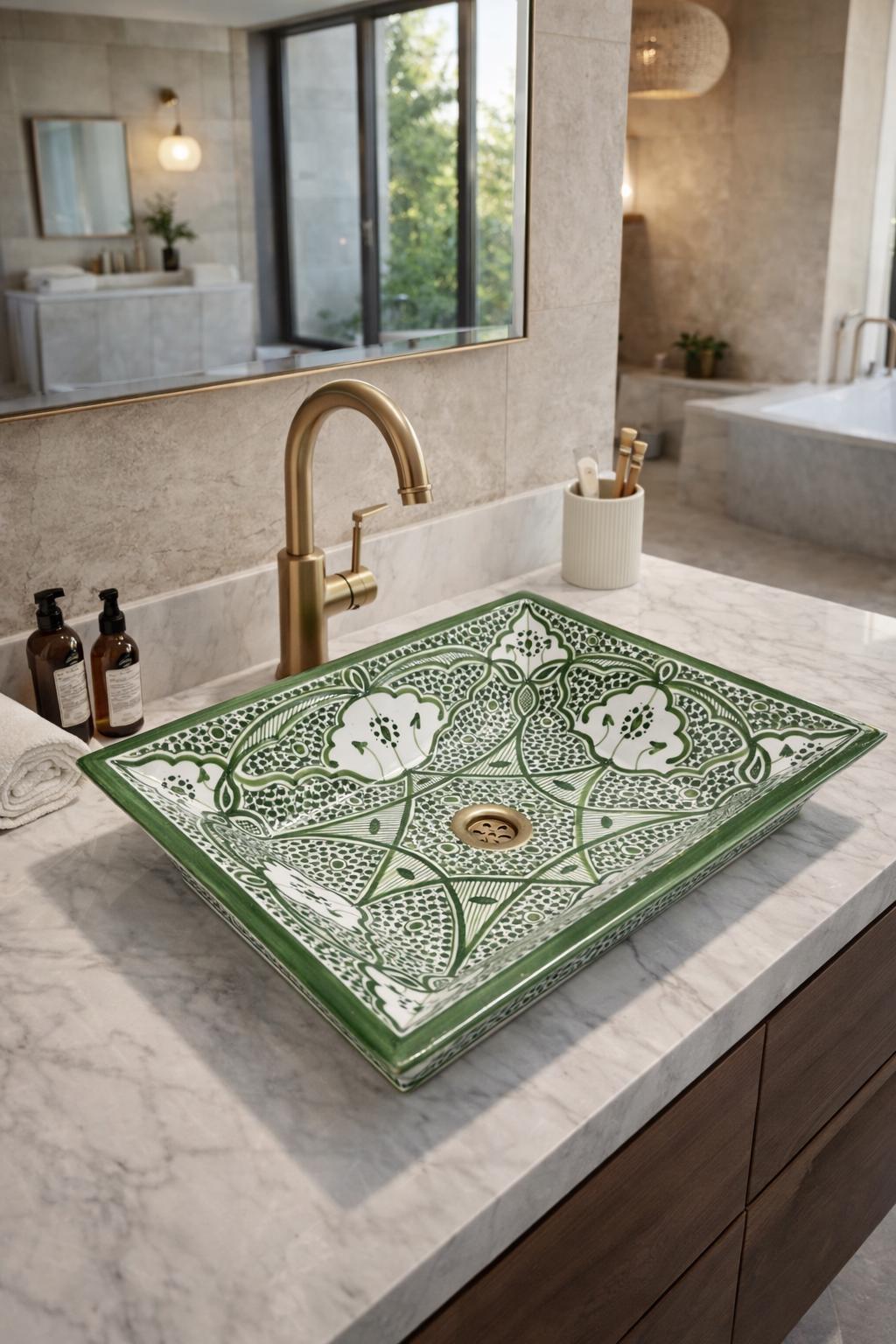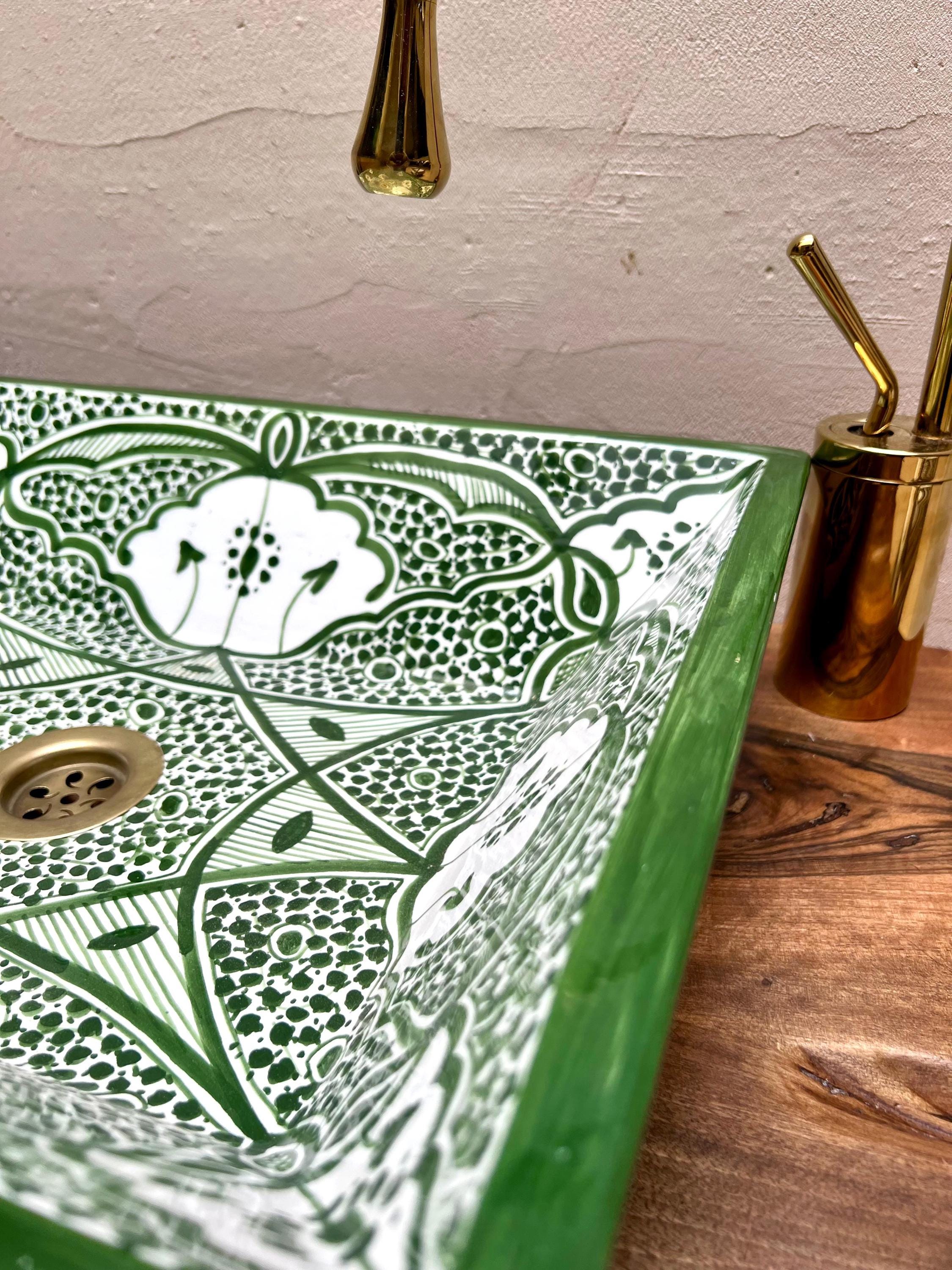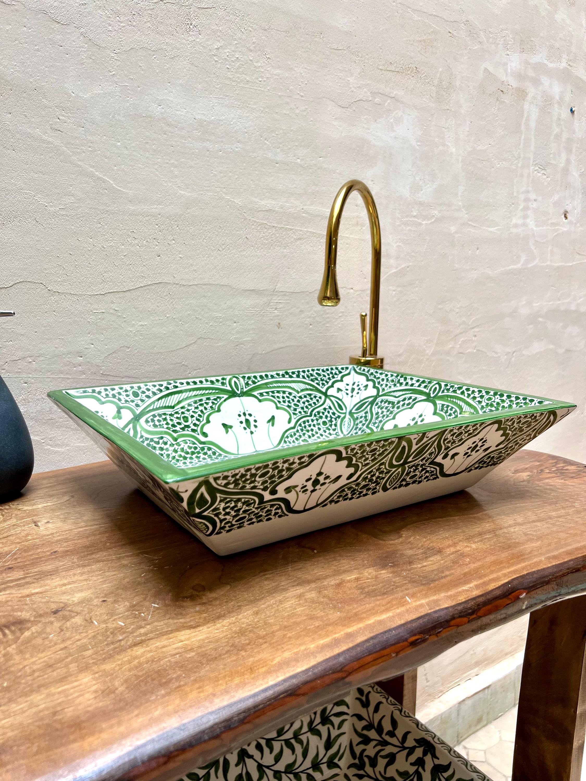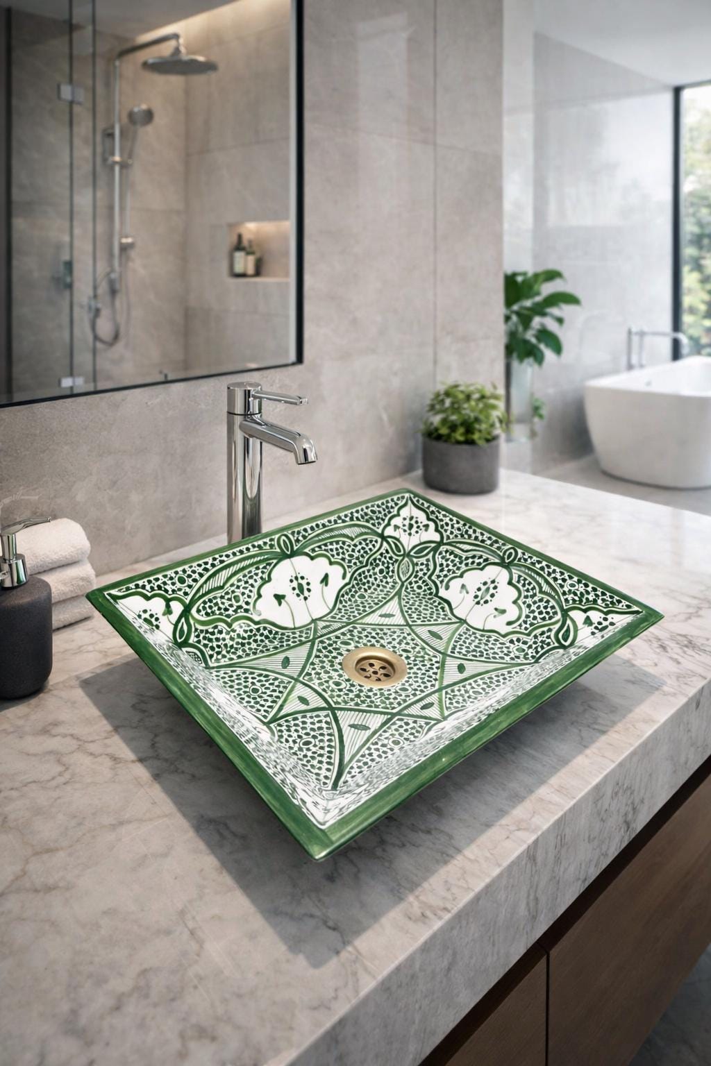 This beautiful Moroccan rectangular sink is handmade by skilled artisans using high-quality ceramic. Featuring traditional hand-painted designs and a smooth glazed finish, it is both durable and easy to clean. Perfect for kitchens, bathrooms, or powder rooms, it adds a unique touch of Moroccan charm to any space. The sink comes with both silver and copper drains included for free. If you need a different size, feel free to contact us.
