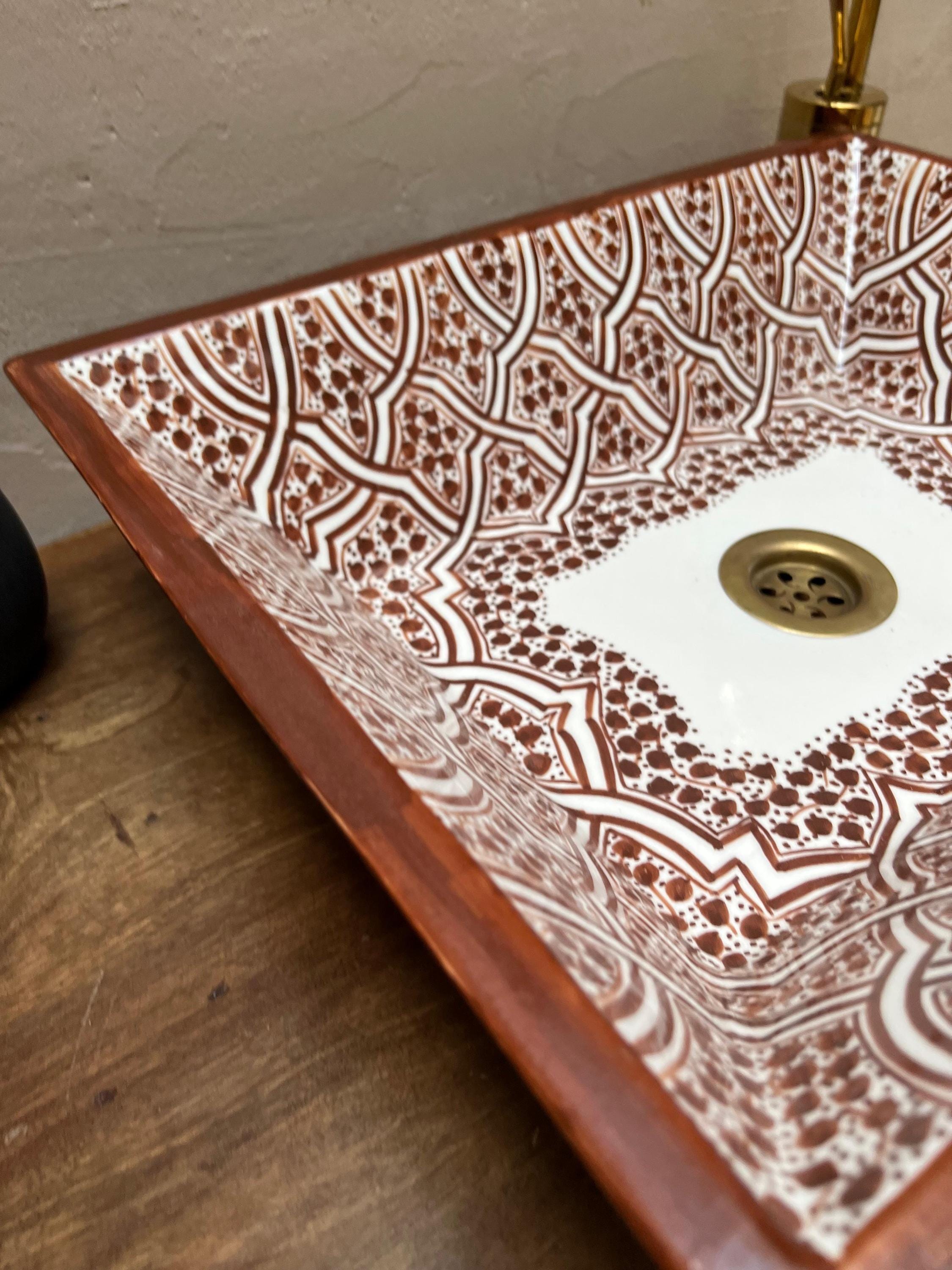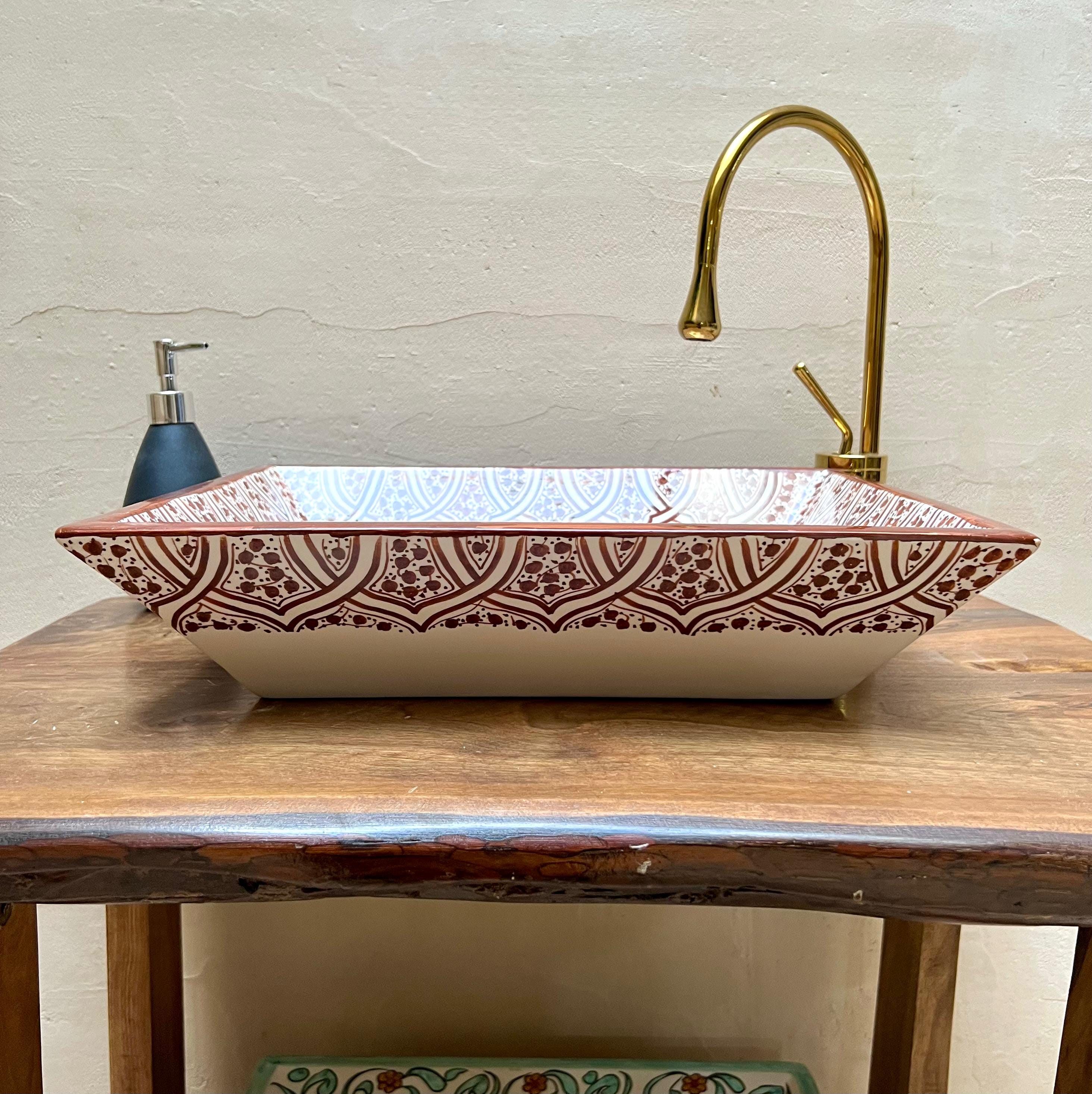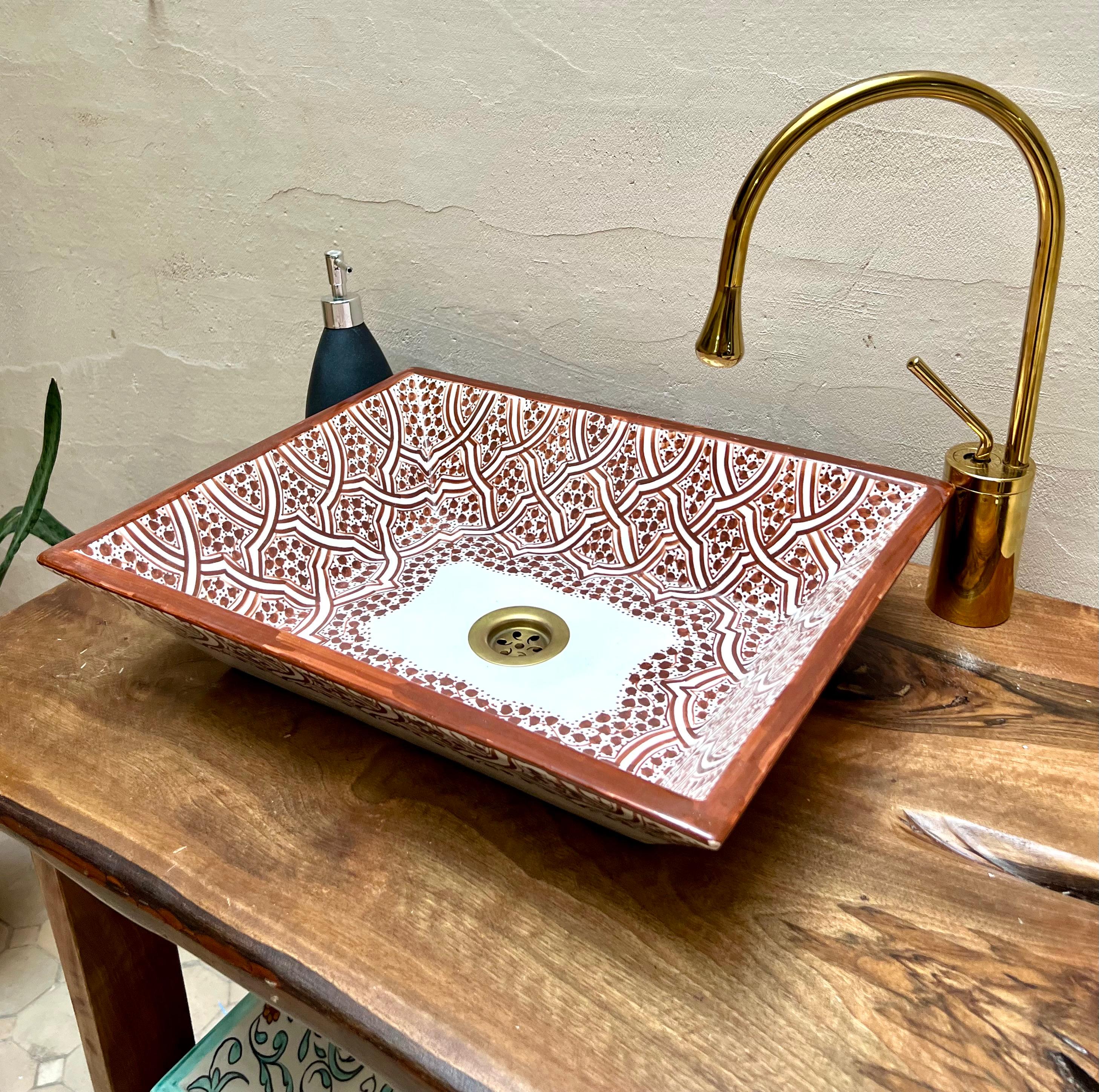 This beautiful Moroccan rectangular sink is handmade by skilled artisans using high-quality ceramic. Featuring traditional hand-painted designs and a smooth glazed finish, it is both durable and easy to clean. Perfect for kitchens, bathrooms, or powder rooms, it adds a unique touch of Moroccan charm to any space. The sink comes with both silver and copper drains included for free. If you need a different size, feel free to contact us.