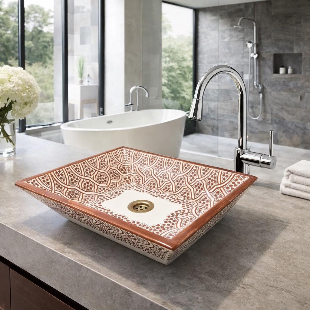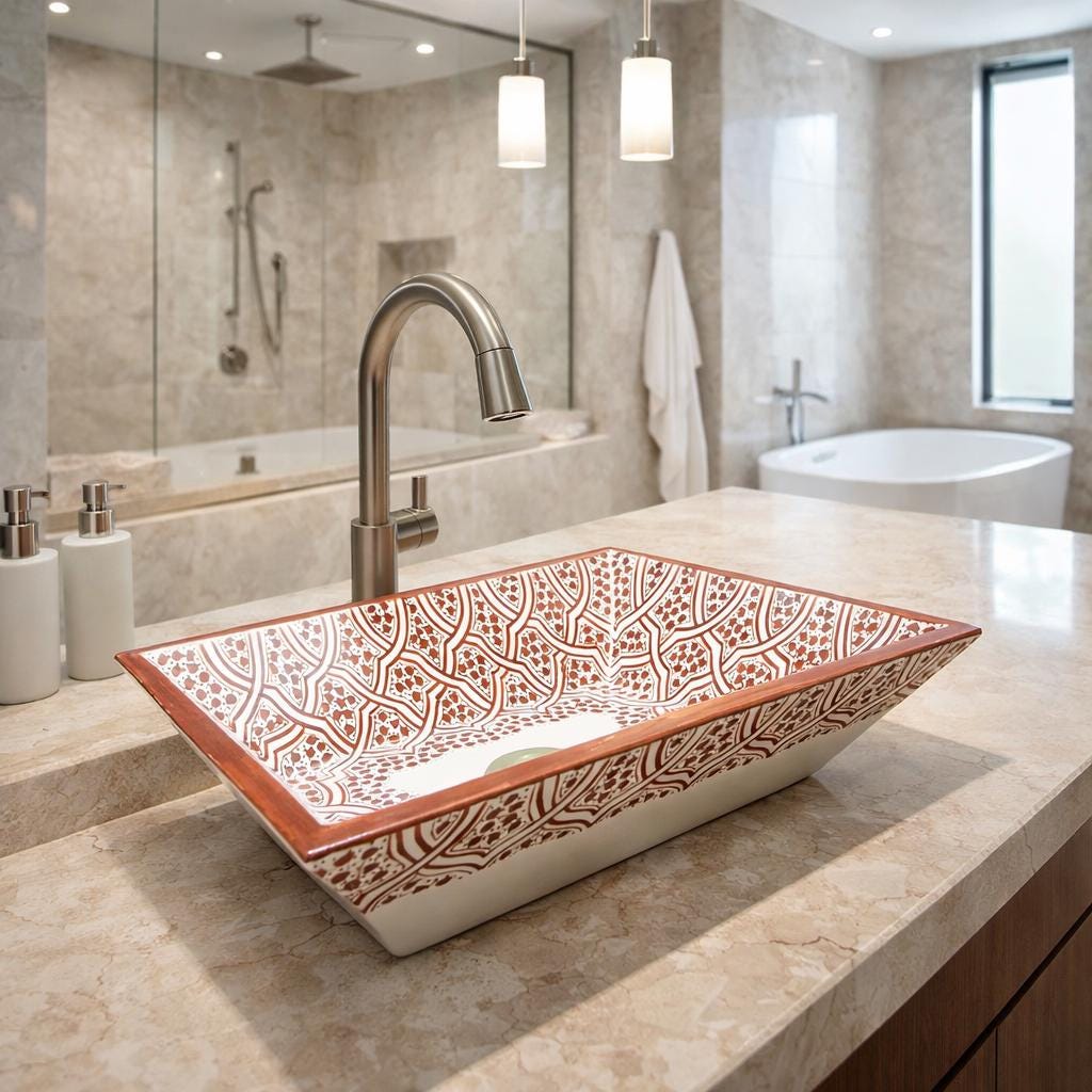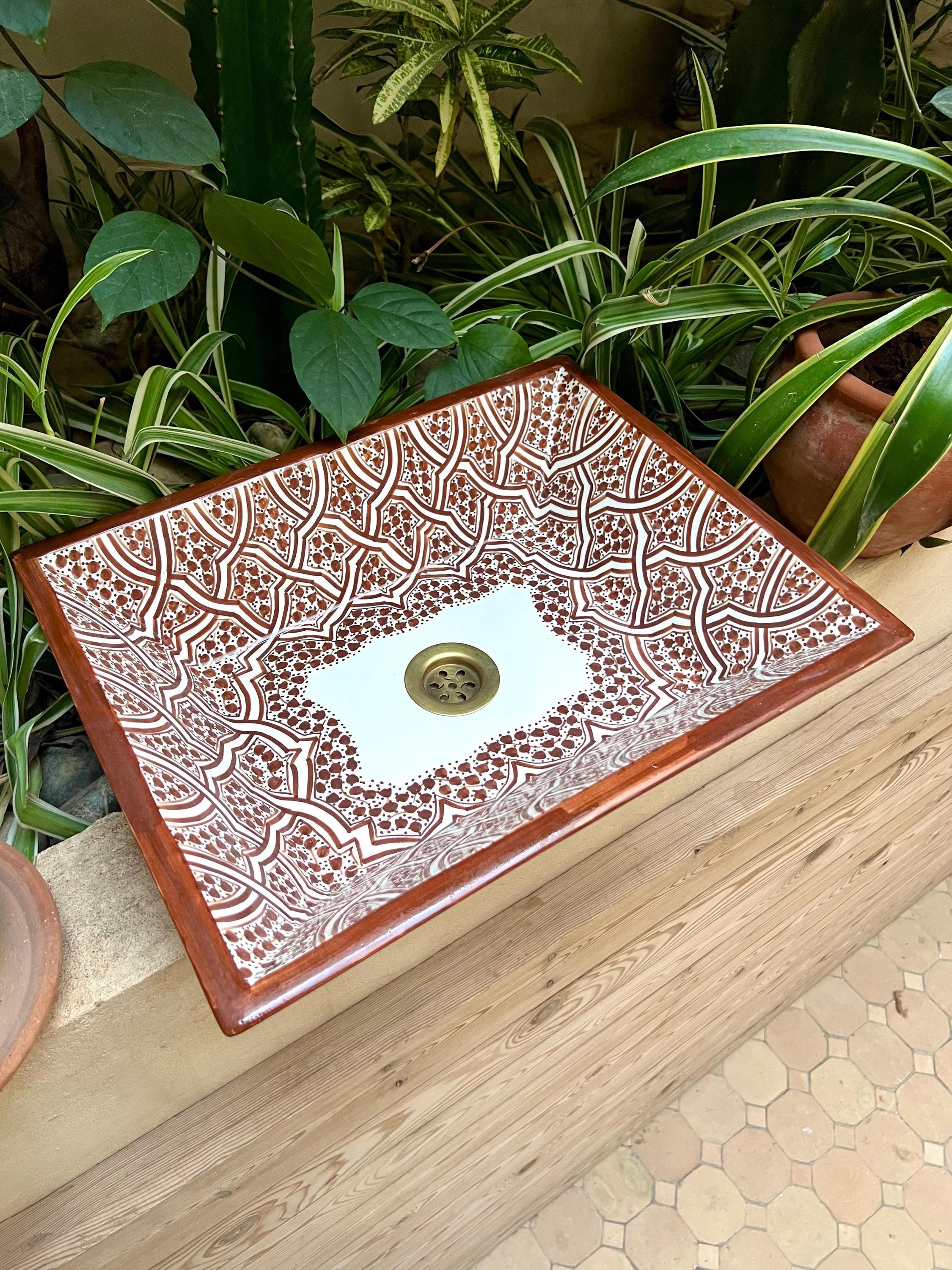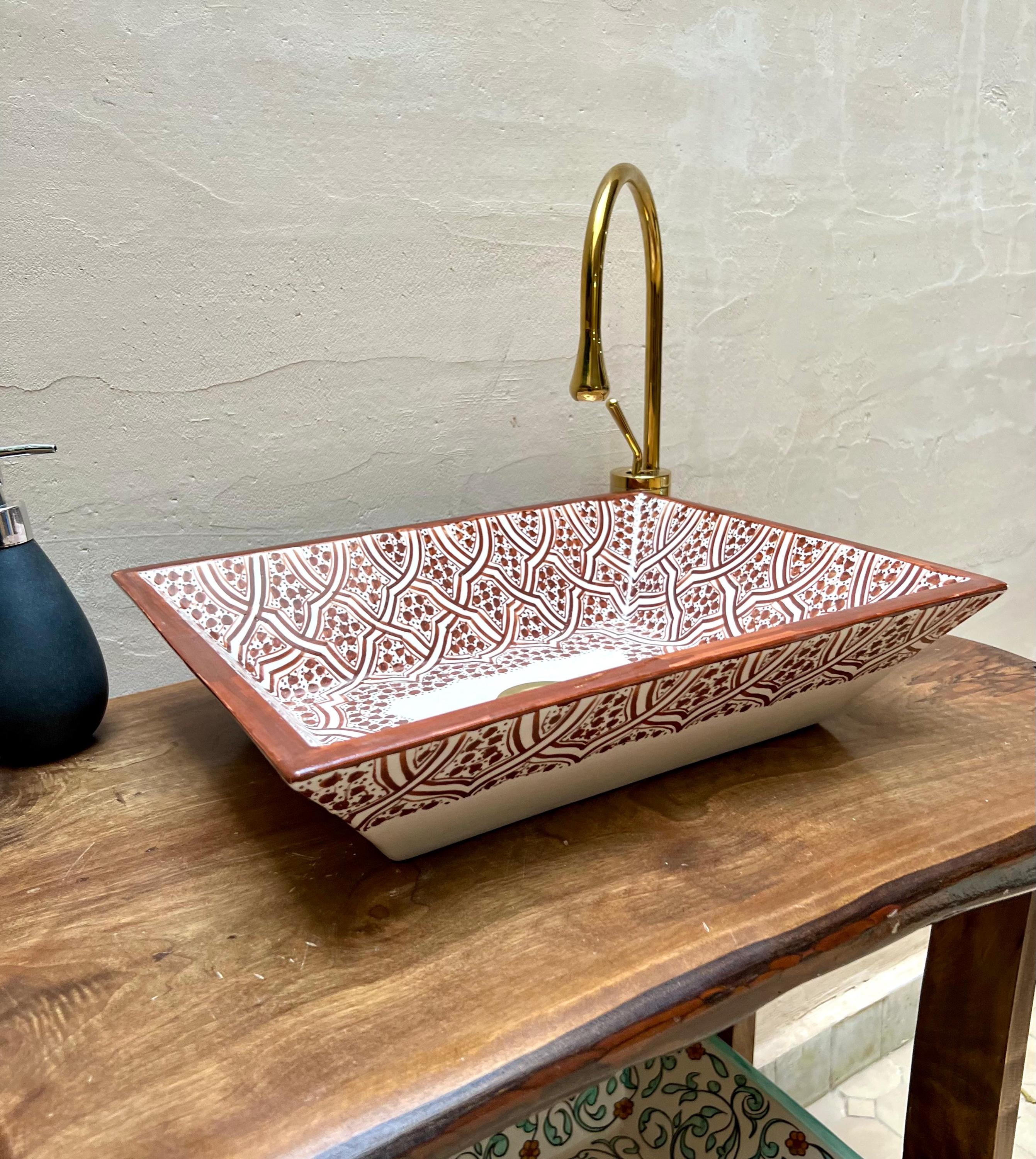 This beautiful Moroccan rectangular sink is handmade by skilled artisans using high-quality ceramic. Featuring traditional hand-painted designs and a smooth glazed finish, it is both durable and easy to clean. Perfect for kitchens, bathrooms, or powder rooms, it adds a unique touch of Moroccan charm to any space. The sink comes with both silver and copper drains included for free. If you need a different size, feel free to contact us.
