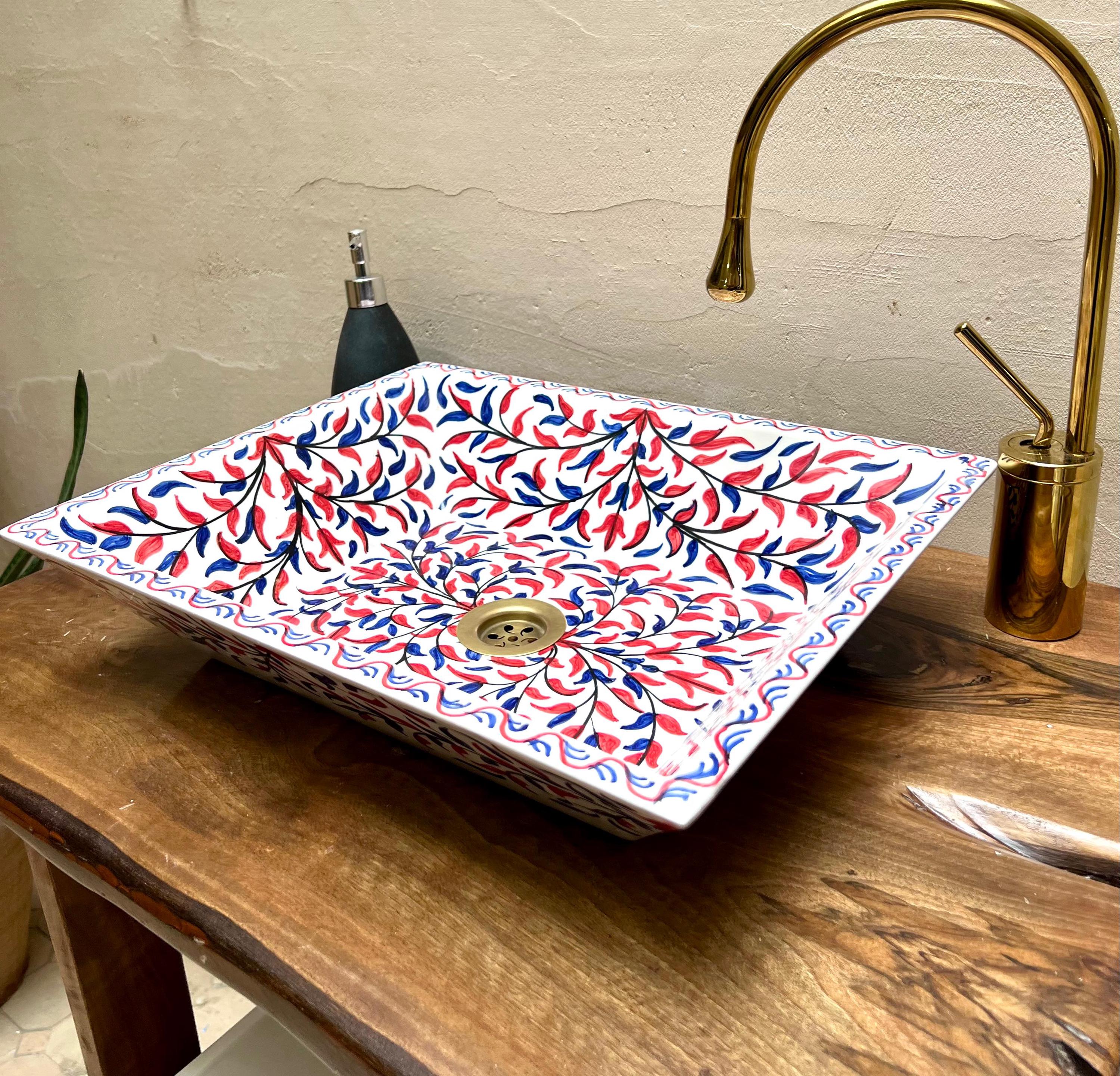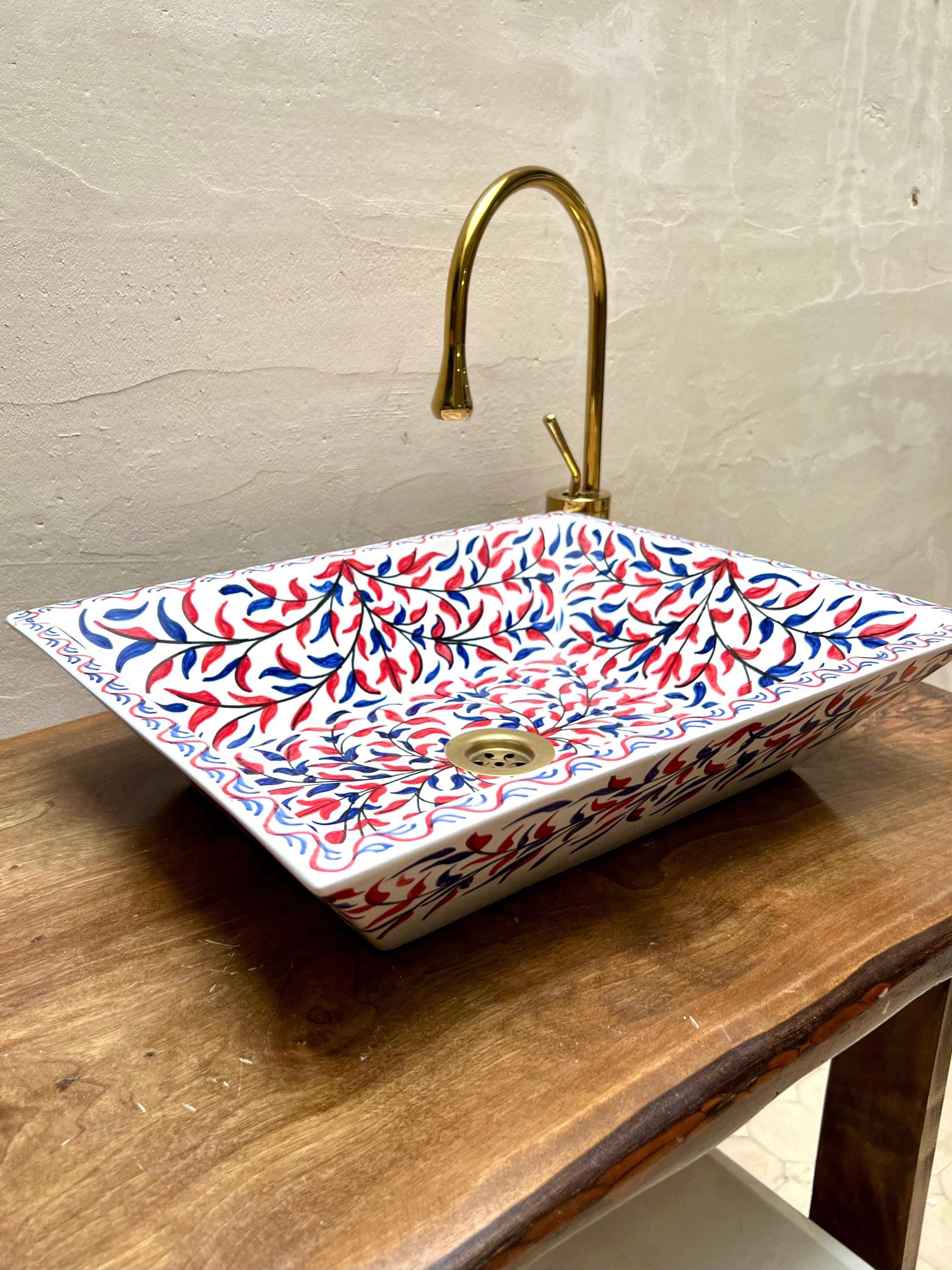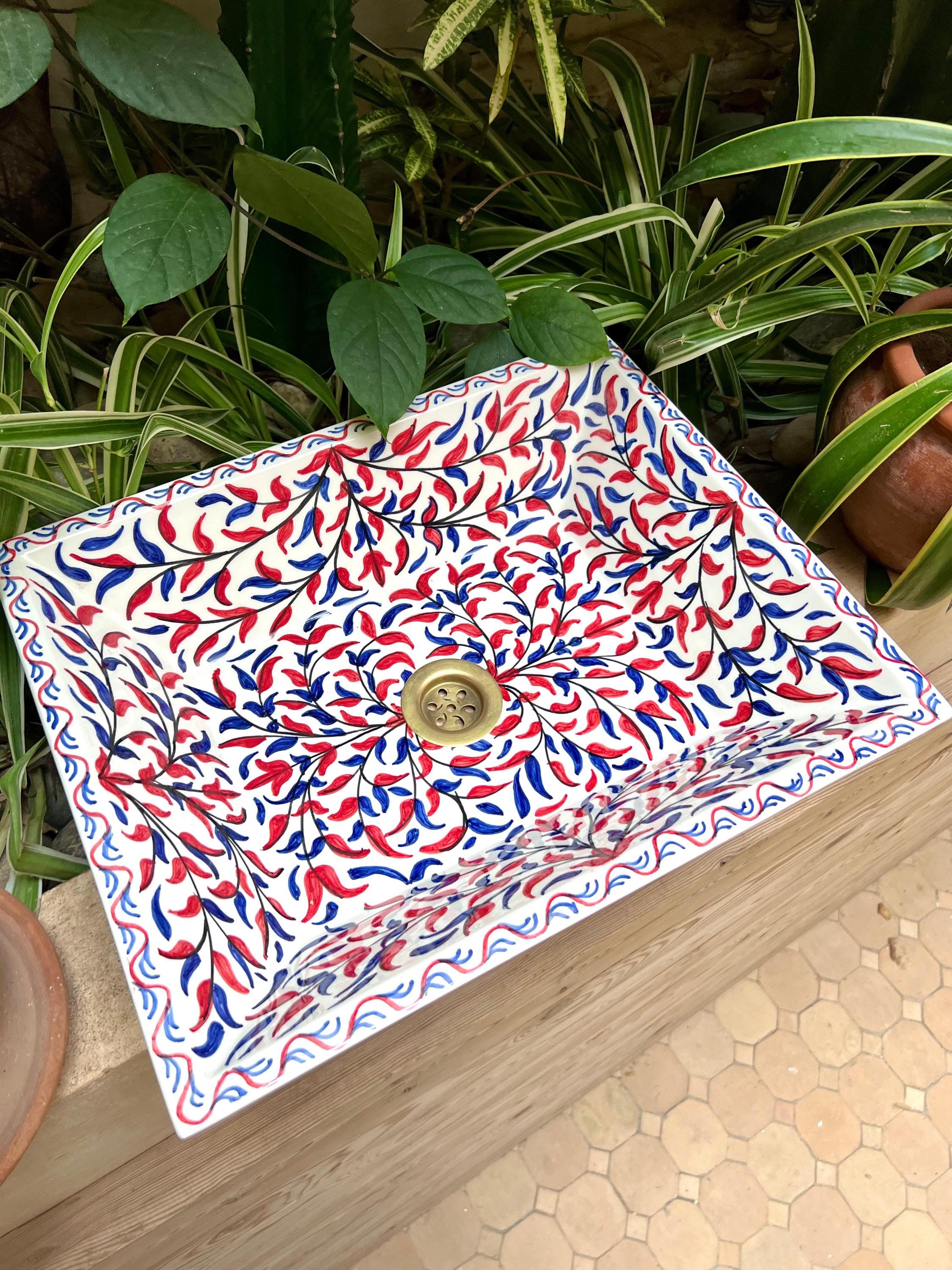 This beautiful Moroccan rectangular sink is handmade by skilled artisans using high-quality ceramic. Featuring traditional hand-painted designs and a smooth glazed finish, it is both durable and easy to clean. Perfect for kitchens, bathrooms, or powder rooms, it adds a unique touch of Moroccan charm to any space. The sink comes with both silver and copper drains included for free. If you need a different size, feel free to contact us.