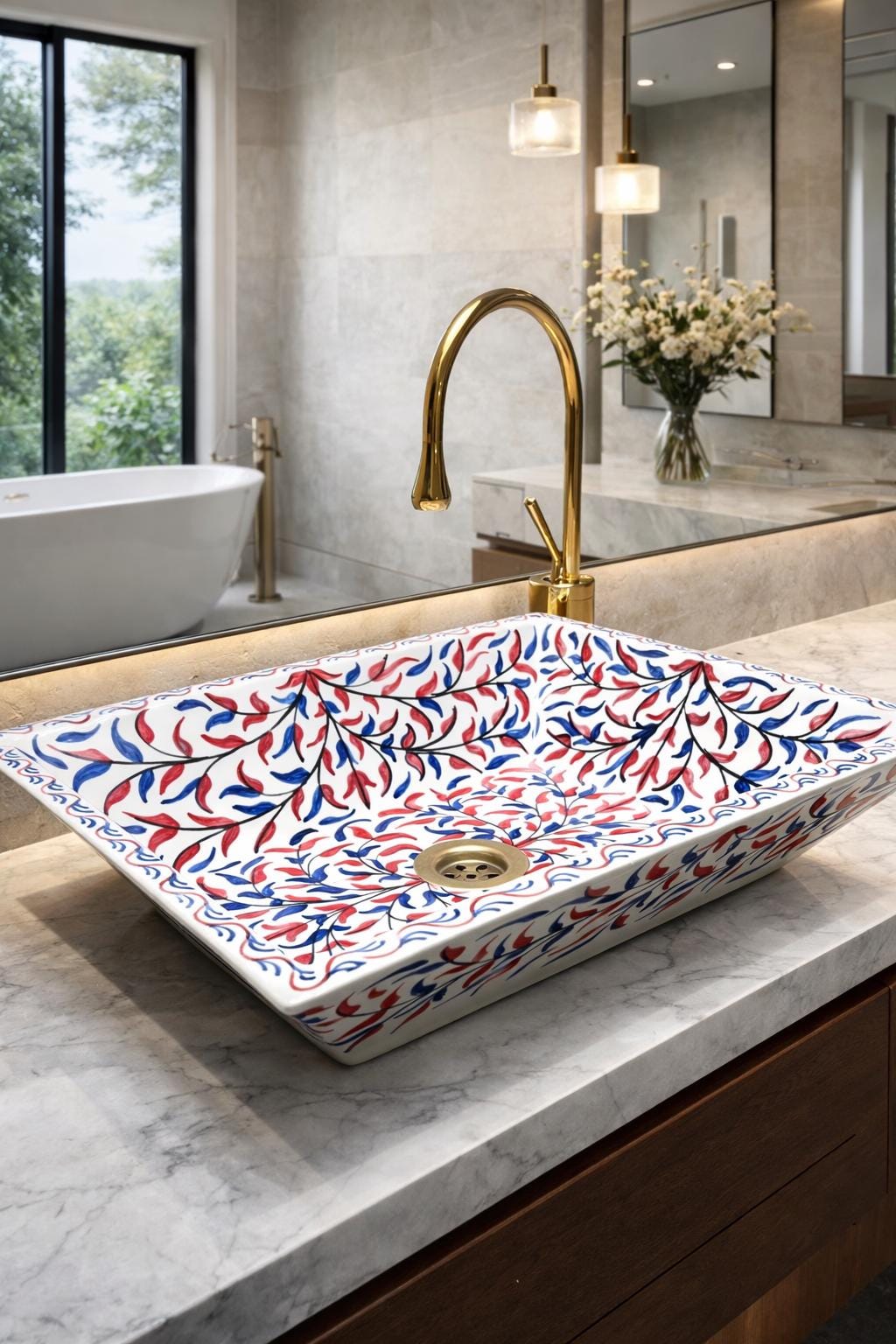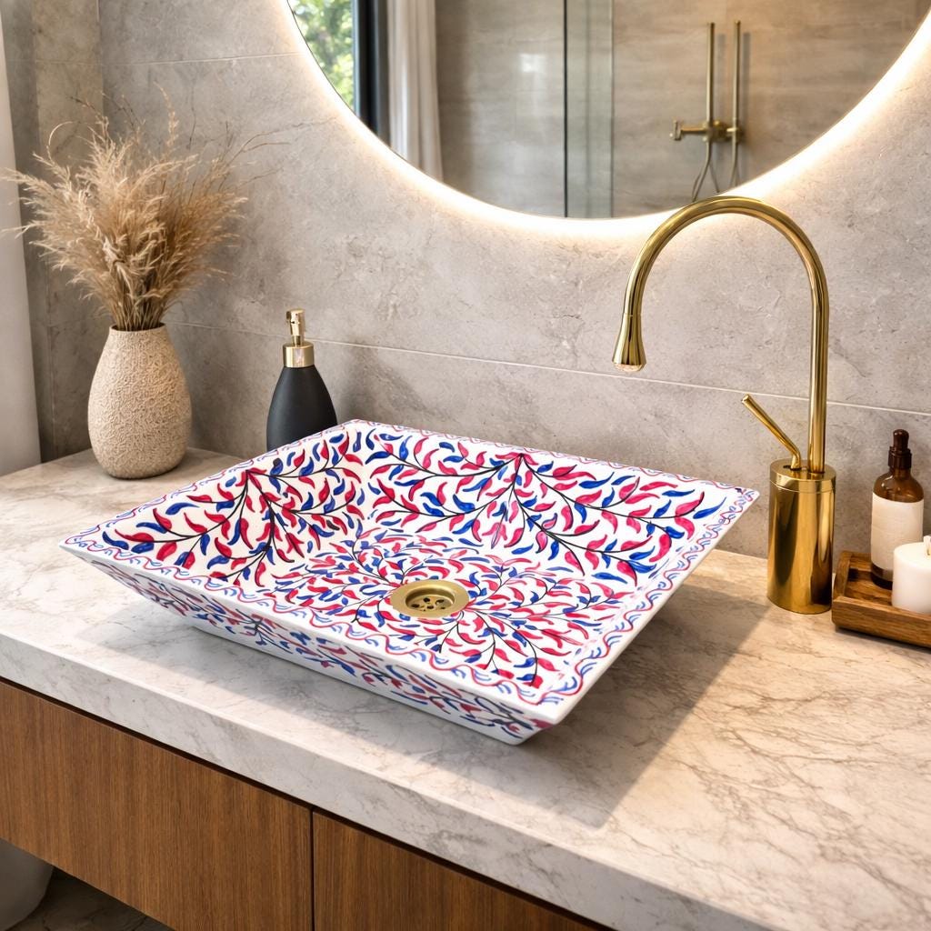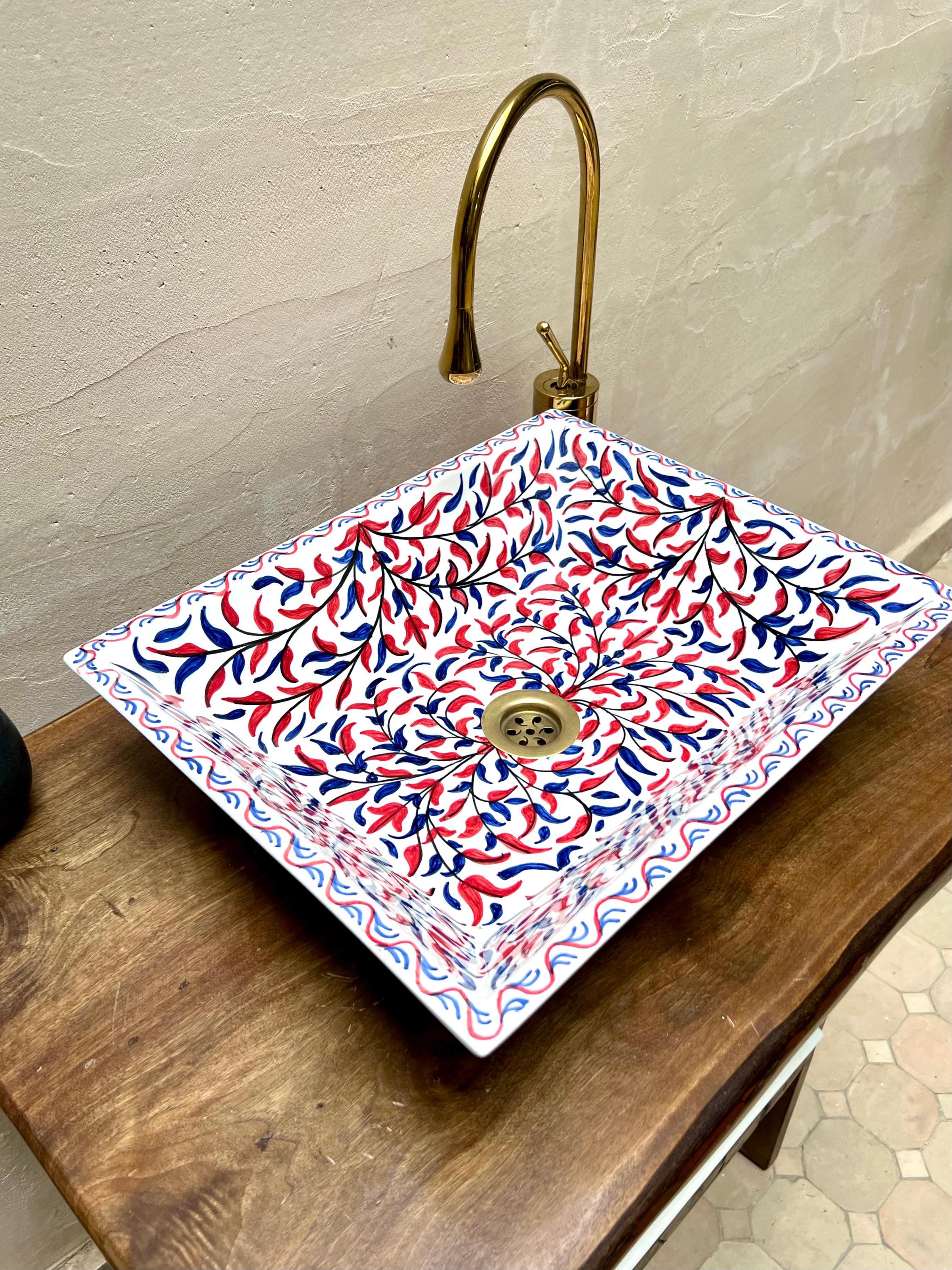 This beautiful Moroccan rectangular sink is handmade by skilled artisans using high-quality ceramic. Featuring traditional hand-painted designs and a smooth glazed finish, it is both durable and easy to clean. Perfect for kitchens, bathrooms, or powder rooms, it adds a unique touch of Moroccan charm to any space. The sink comes with both silver and copper drains included for free. If you need a different size, feel free to contact us.