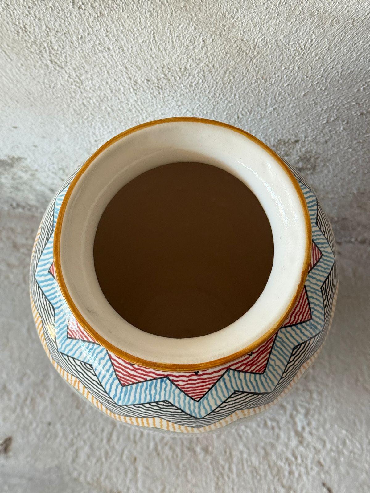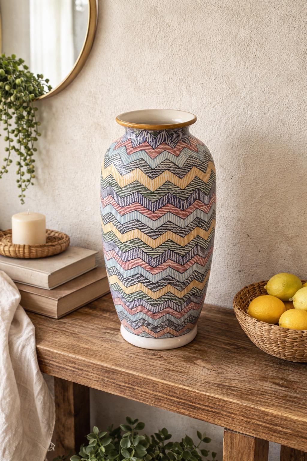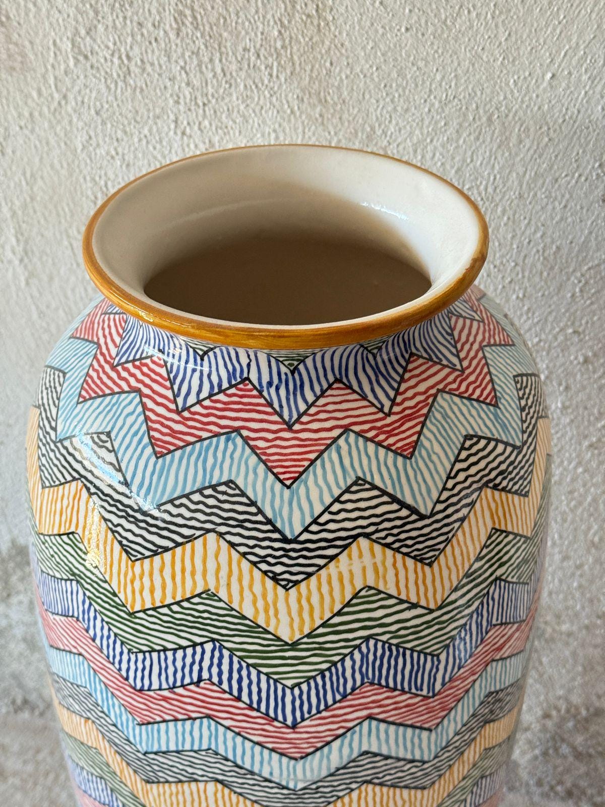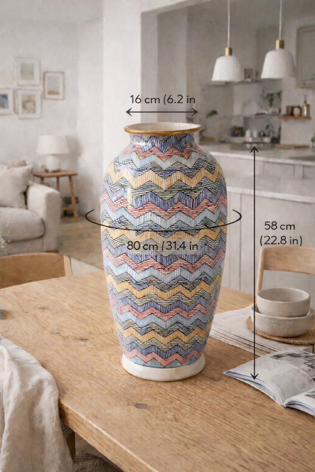 Bring character and artistry into your space with this large handcrafted ceramic vase, a true contemporary décor statement piece. Carefully hand-painted by skilled artisans, this jar features a refined pastel chevron pattern that blends soft tones with graphic elegance, creating a timeless yet modern look.