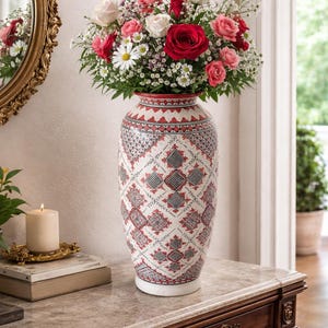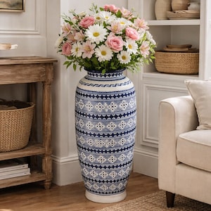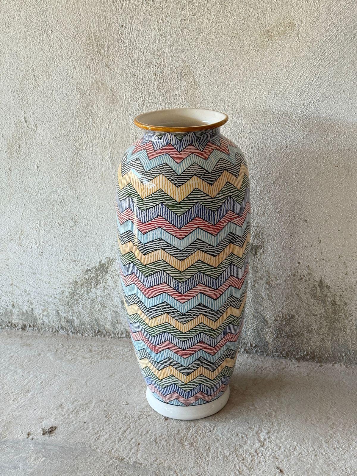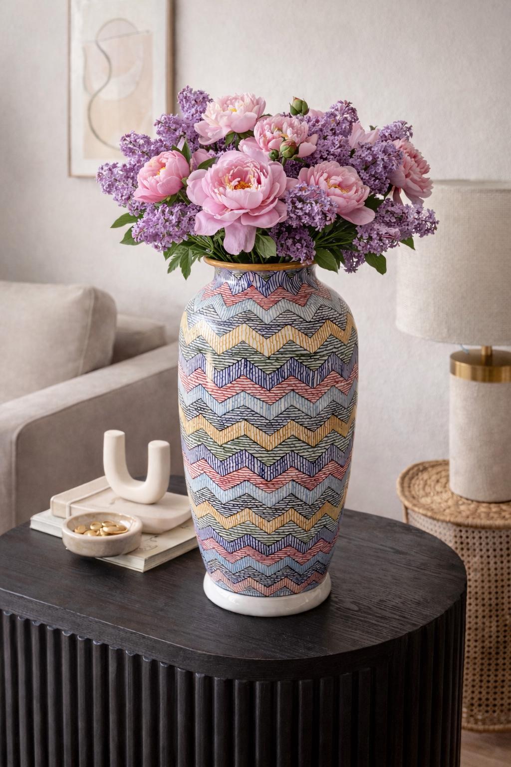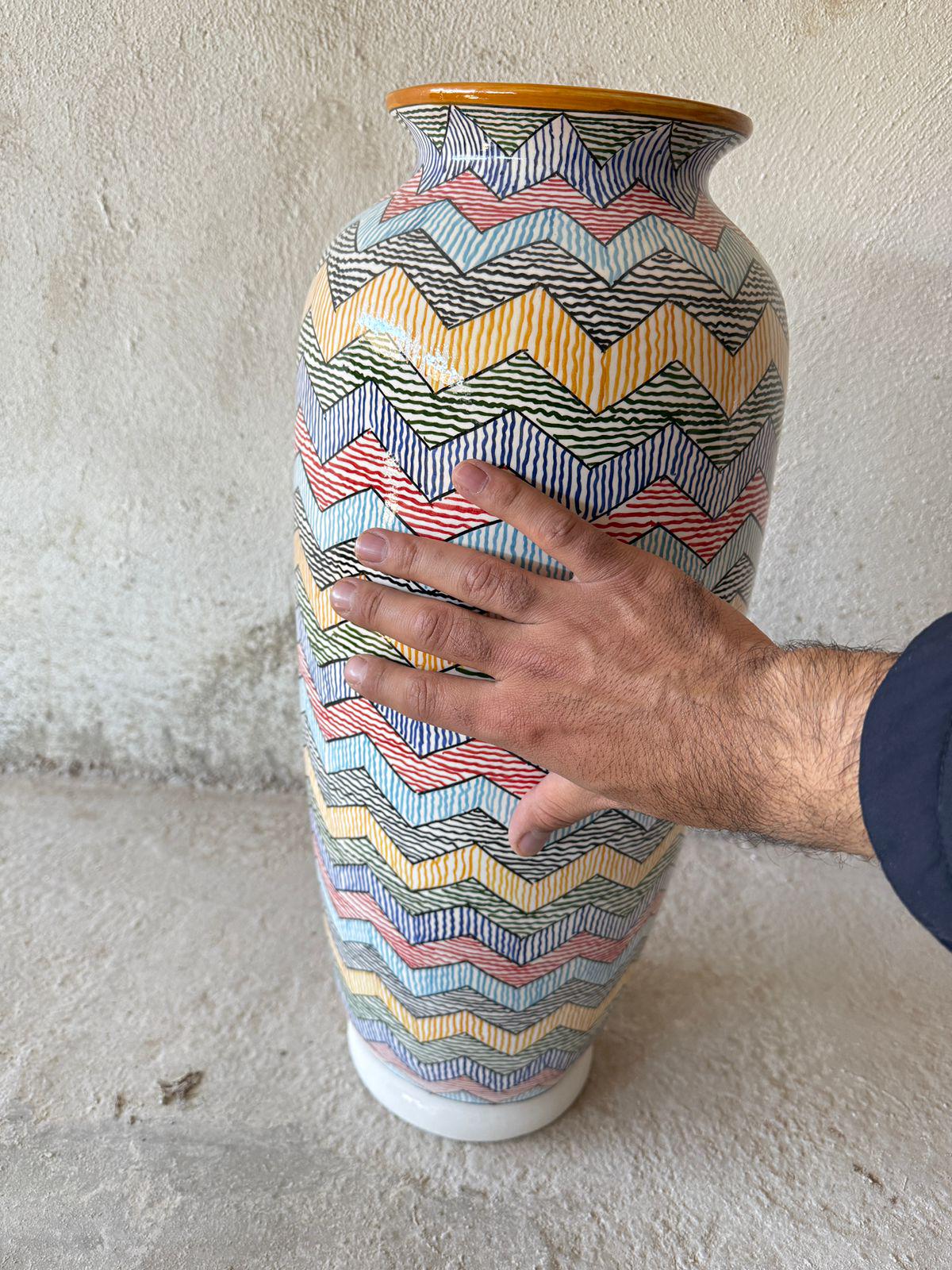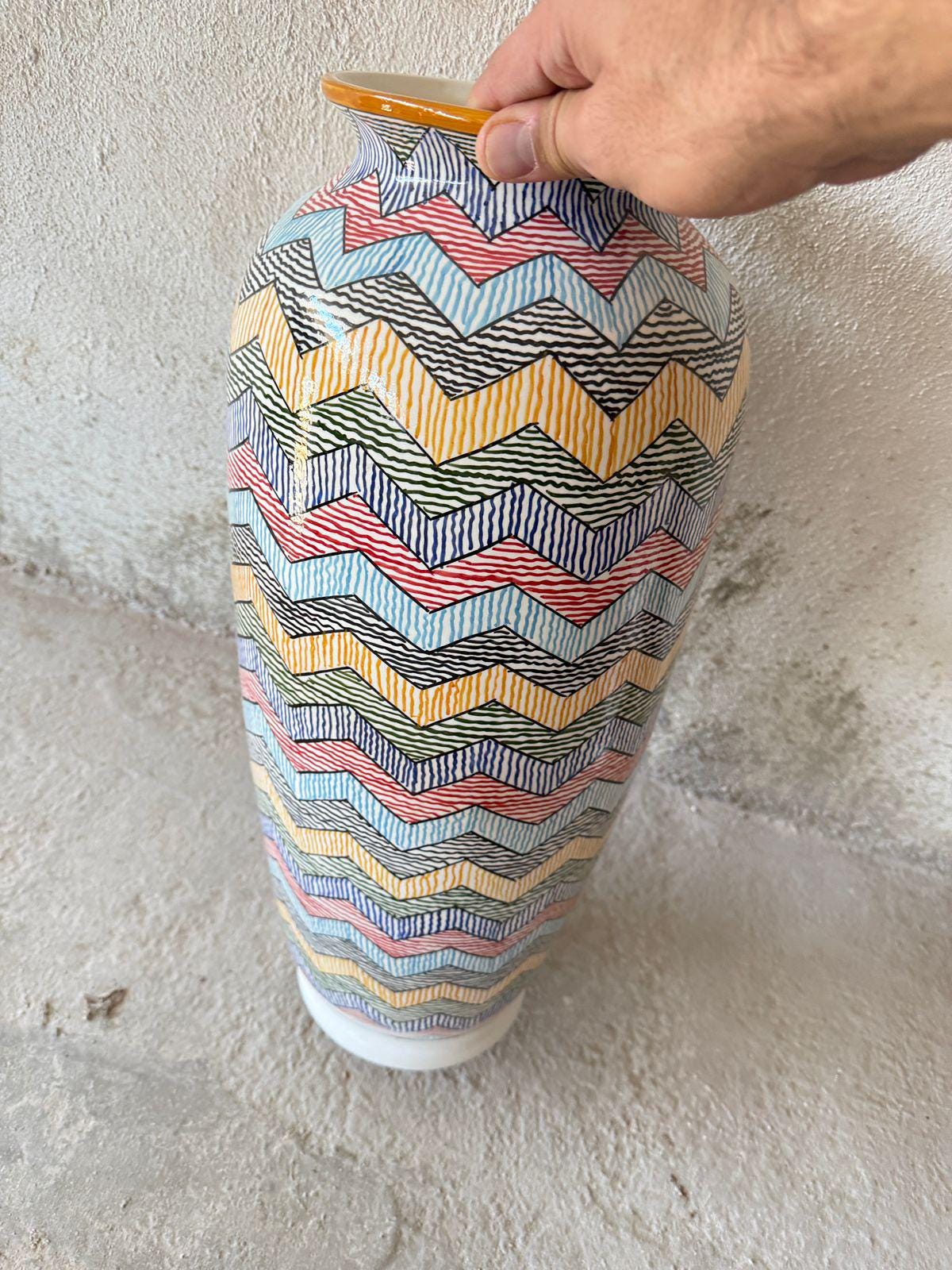 Bring character and artistry into your space with this large handcrafted ceramic vase, a true contemporary décor statement piece. Carefully hand-painted by skilled artisans, this jar features a refined pastel chevron pattern that blends soft tones with graphic elegance, creating a timeless yet modern look.