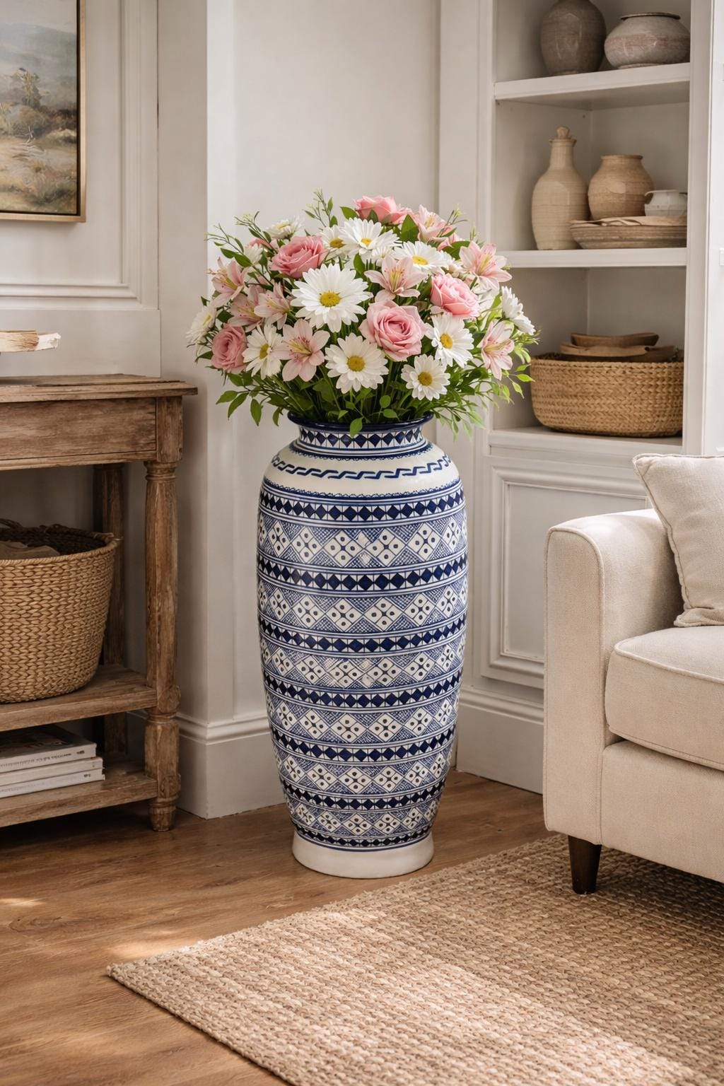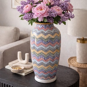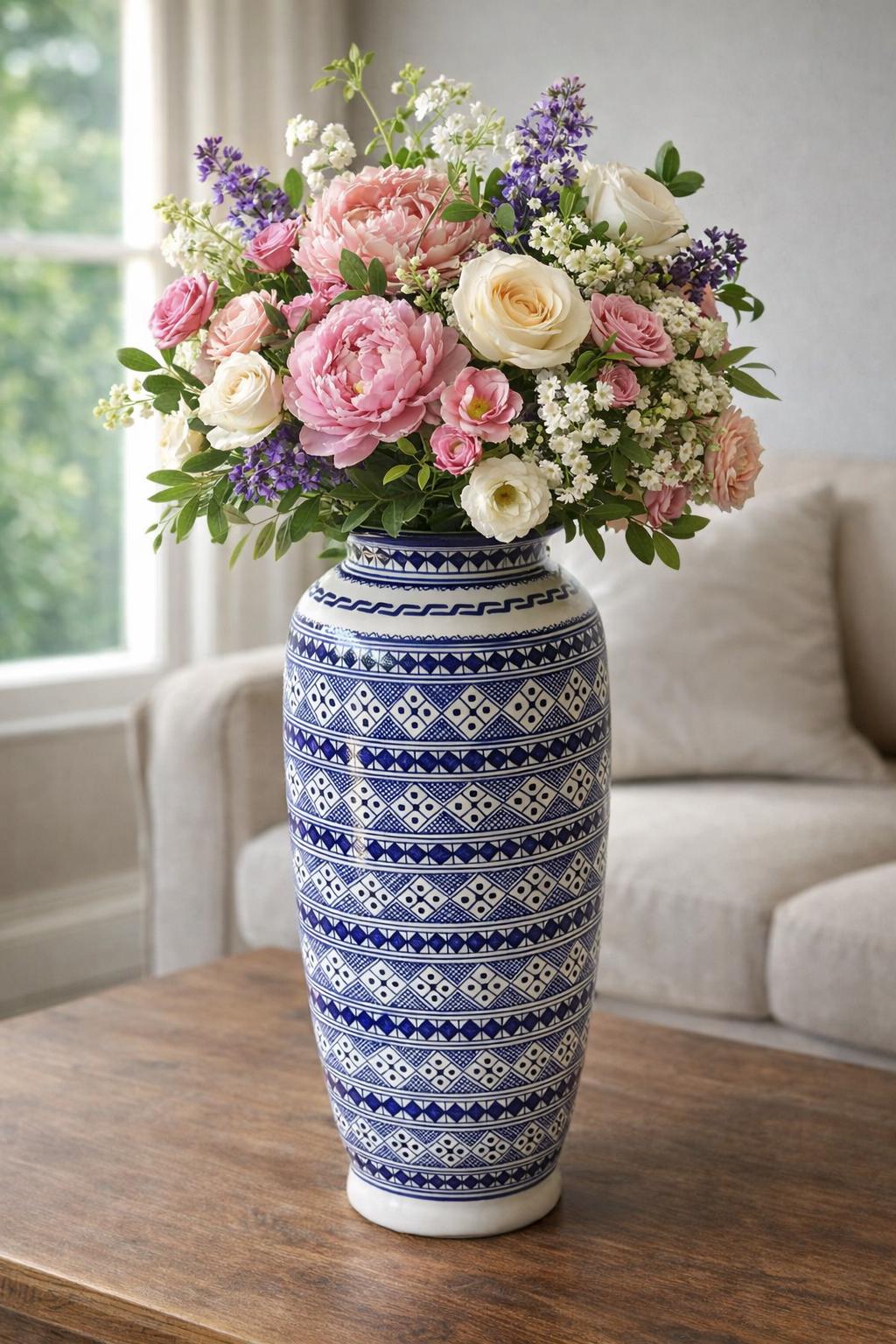 Its tall silhouette makes it ideal for entryways, living room corners, stair landings, or beside a sofa, where it can stand beautifully on its own or be styled with fresh flowers or leafy branches. Each vase is crafted and painted by skilled artisans, making every piece slightly unique.
