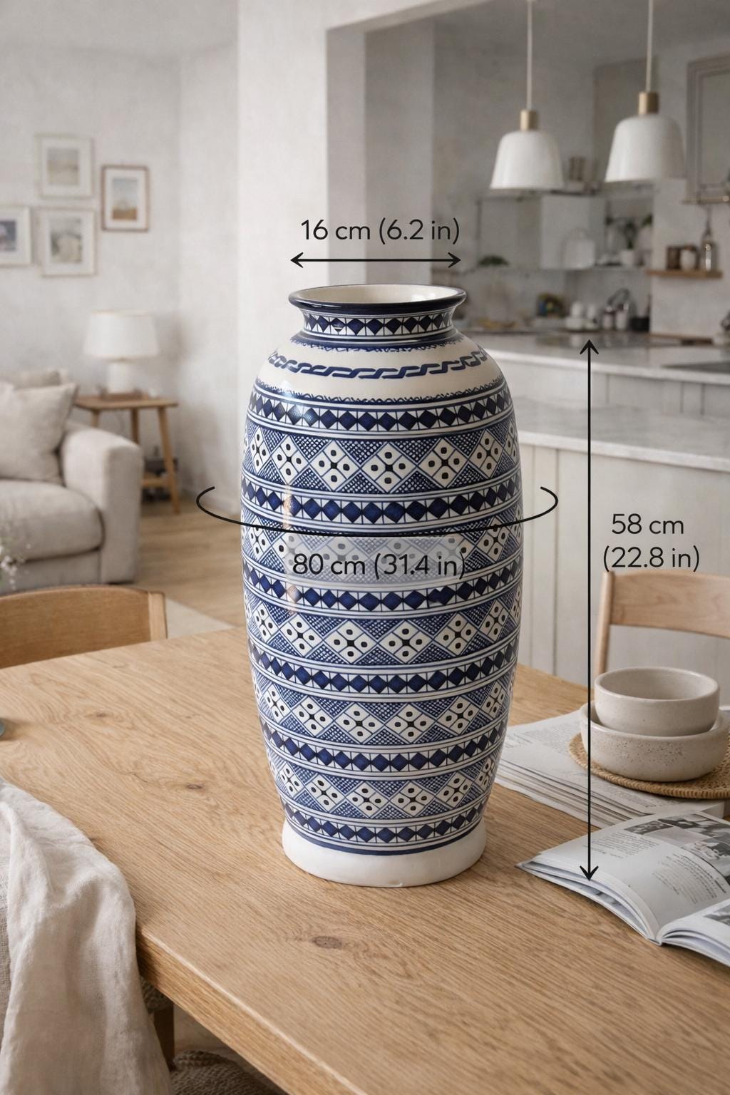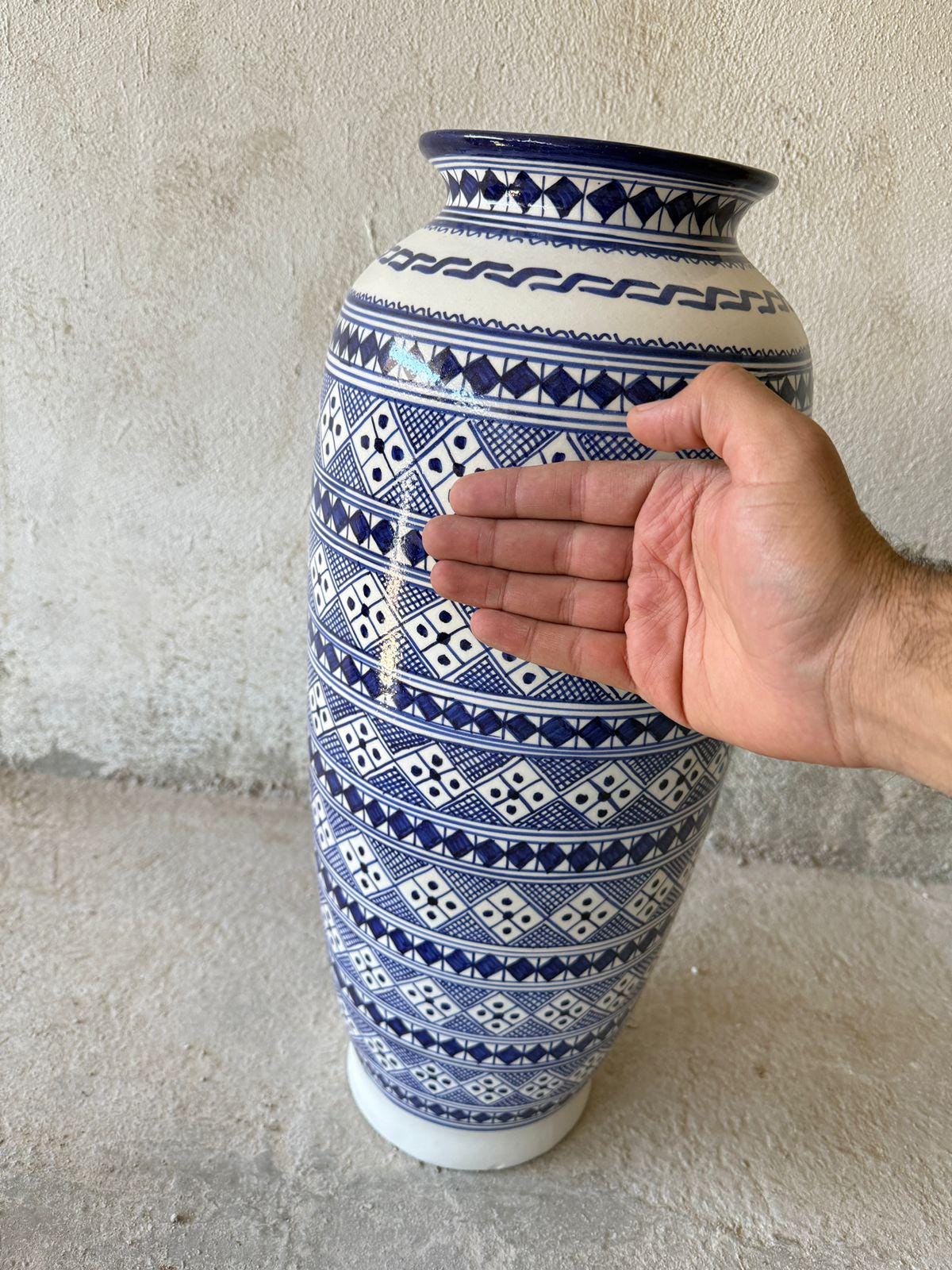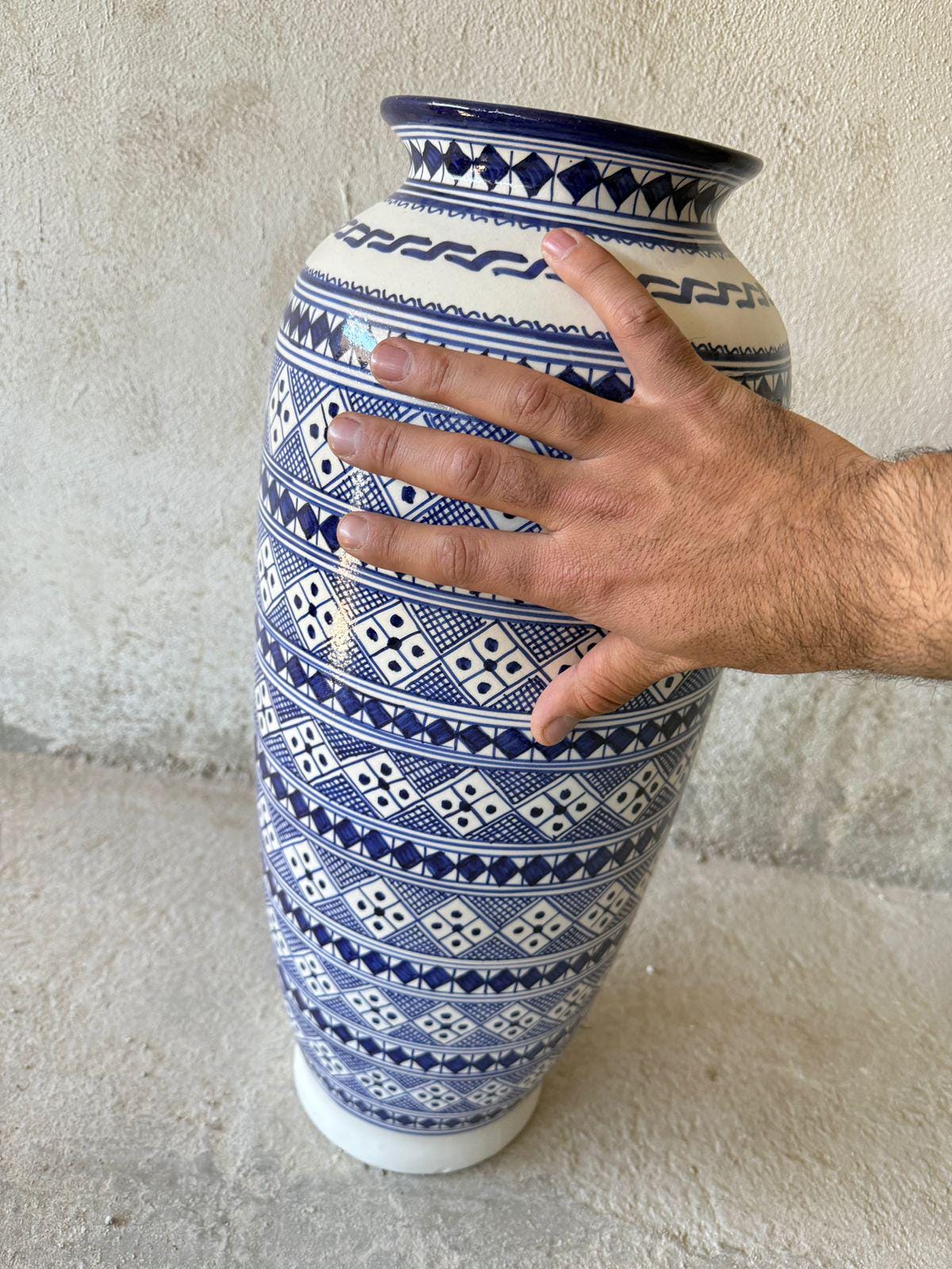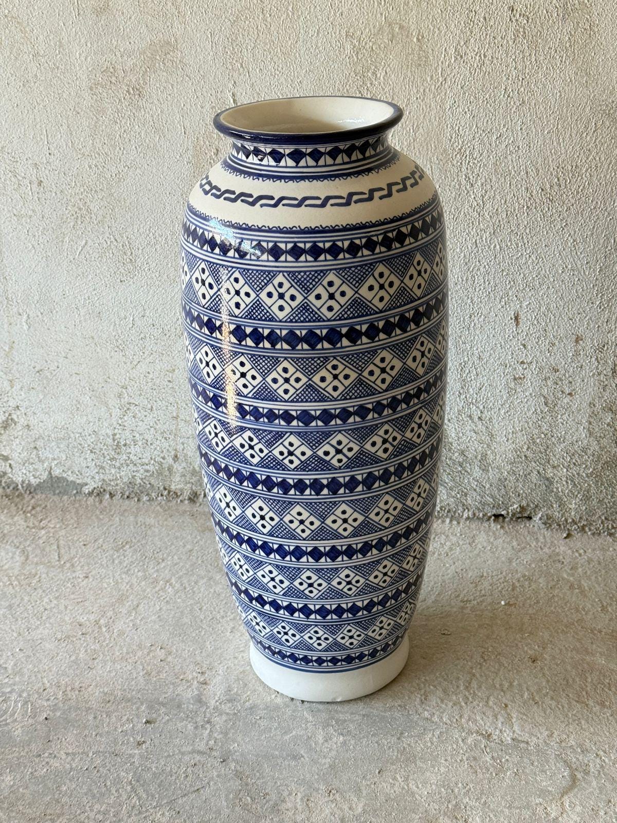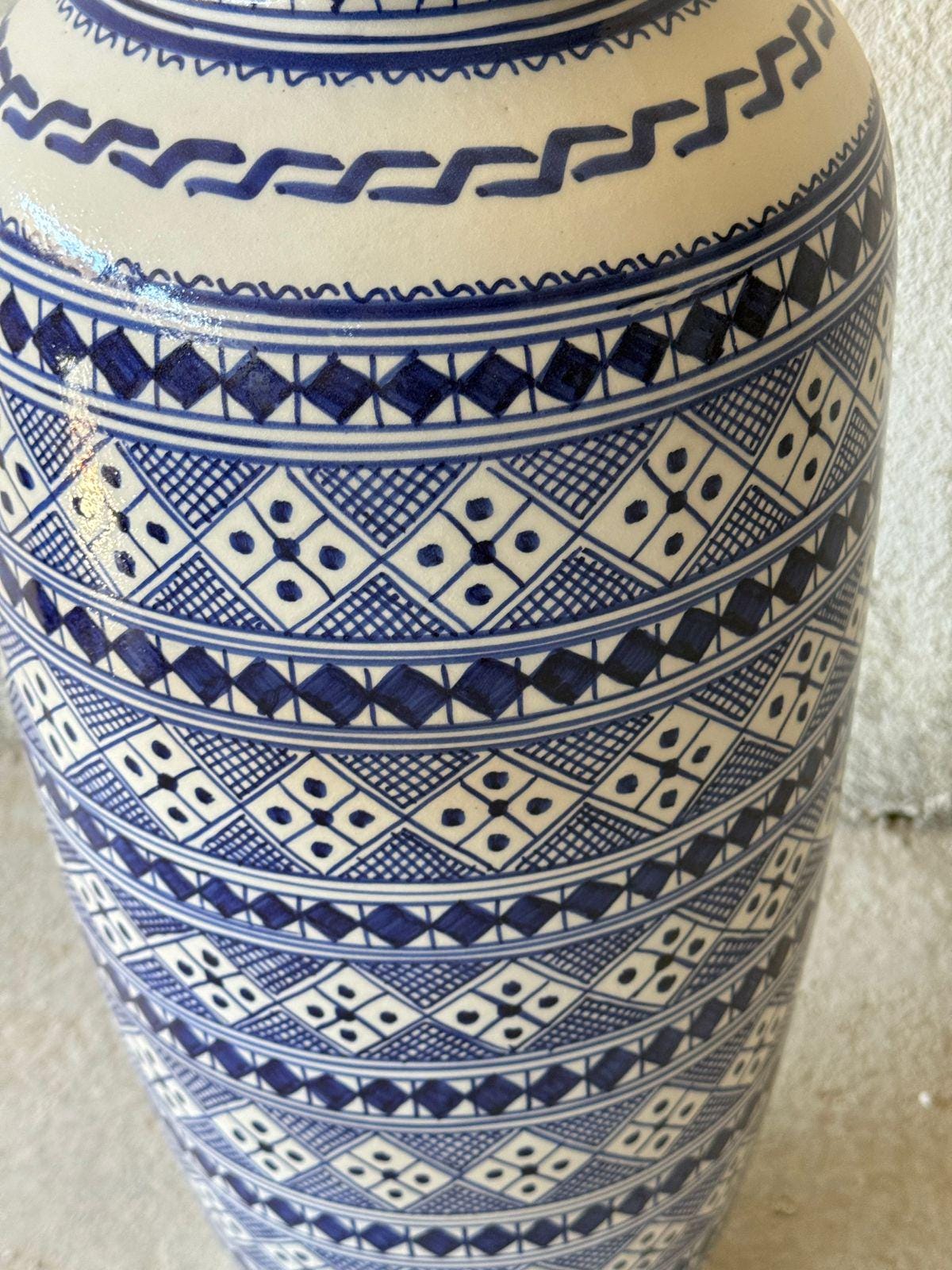 🎨 Details ✔ Height Size : 58cm - 22.8 inches ✔ Neck size : 16cm - 6,2 inches ✔ Width Diametre Size : 80cm - 31.4 inches ✔ Shipping and Processing Time: 2-5 days ✔ Material: High-quality glazed ceramic ✔ Technique: Hand-painted ✔ Pattern: Moroccan Berber (Amazigh) geometric art ✔ Finish: Smooth glazed surface ✔ Style: Complements Bohemian, Mediterranean, Moroccan, eclectic, and modern interiors ✔ Use: Decorative vase / floor jar / statement décor 📌 Please add your phone number in the personalization section.