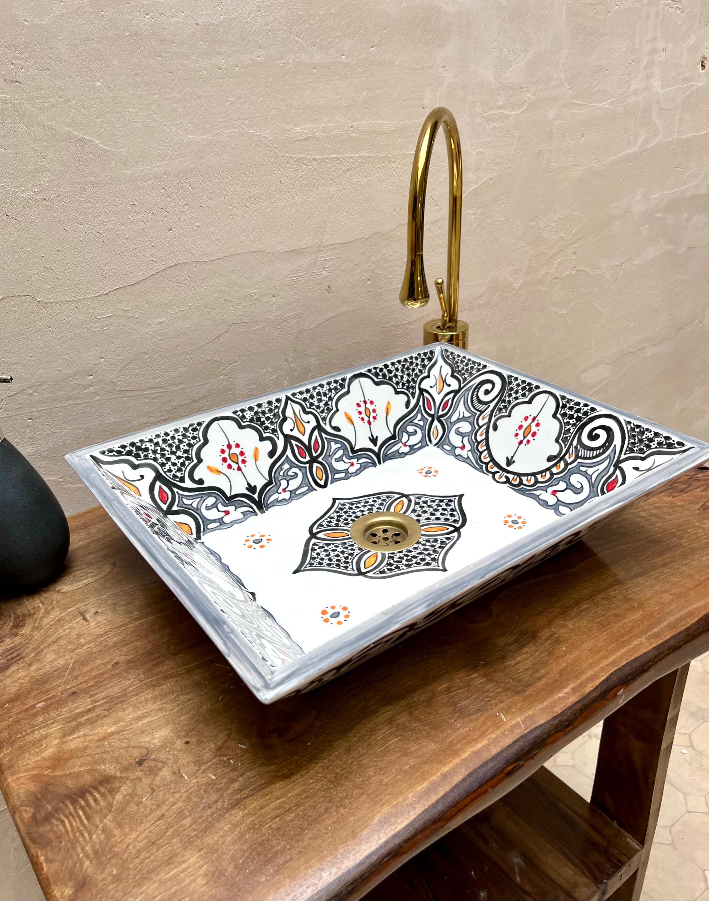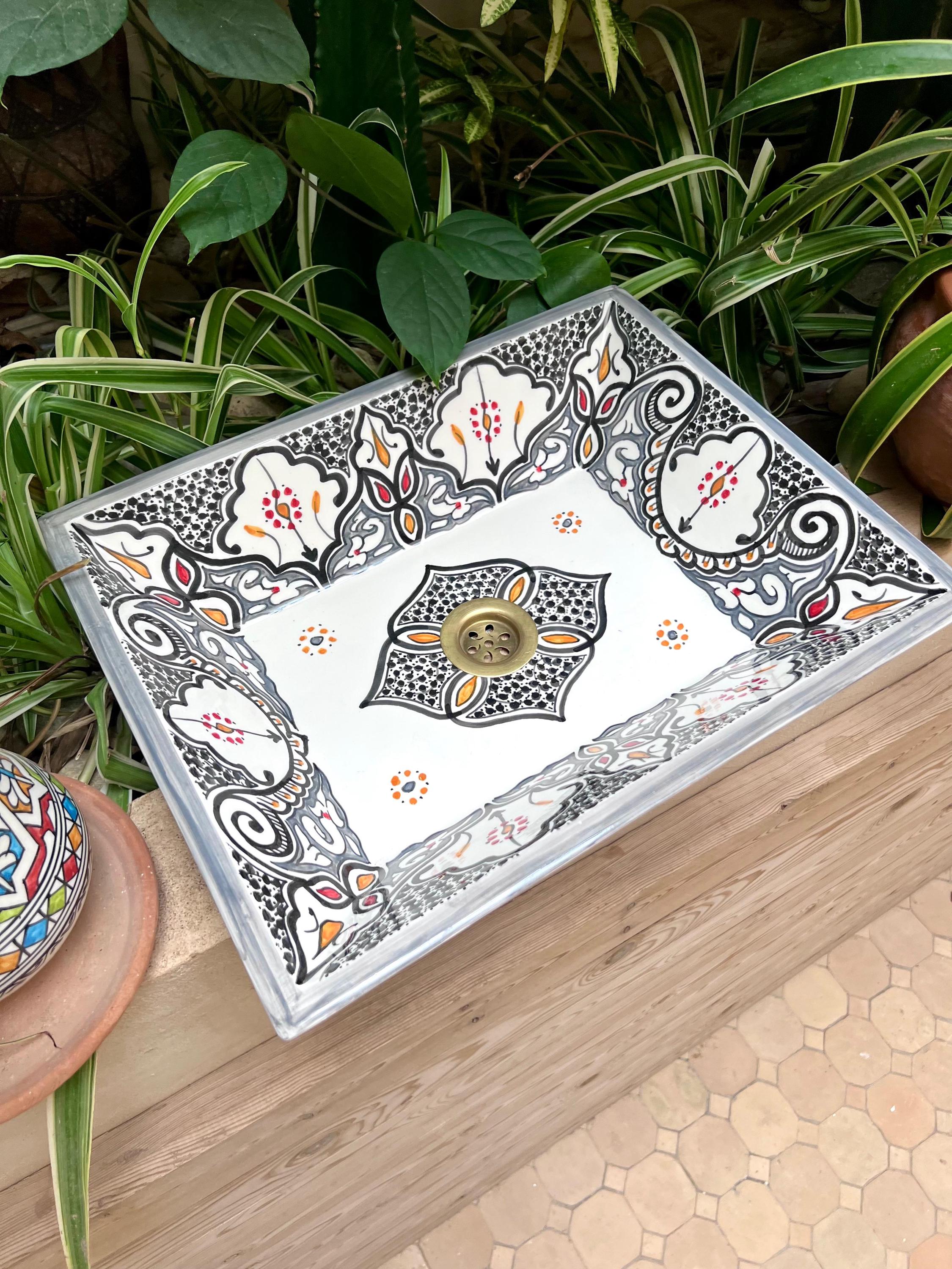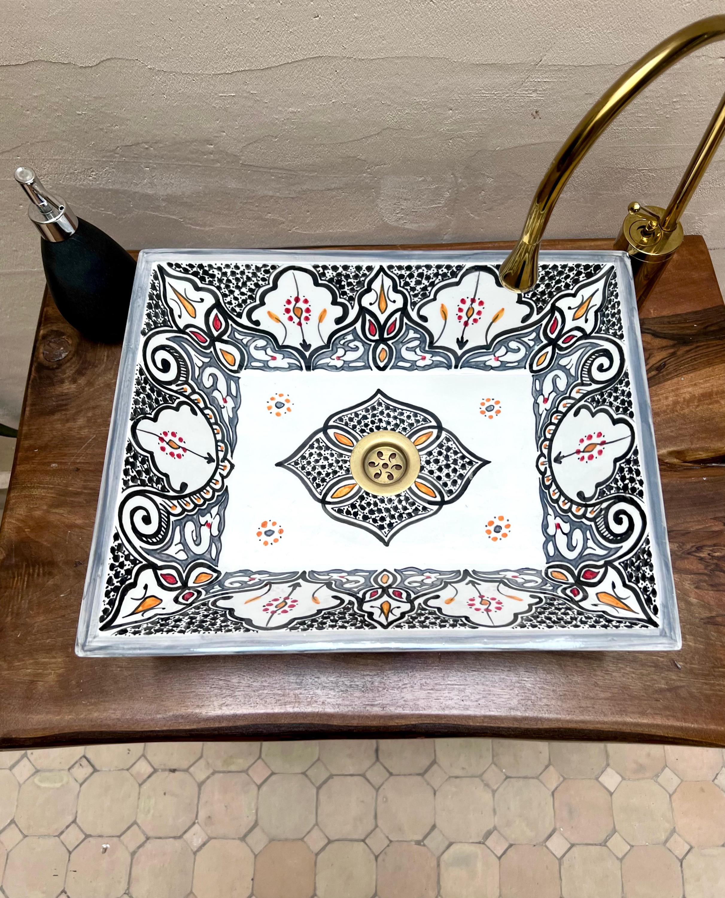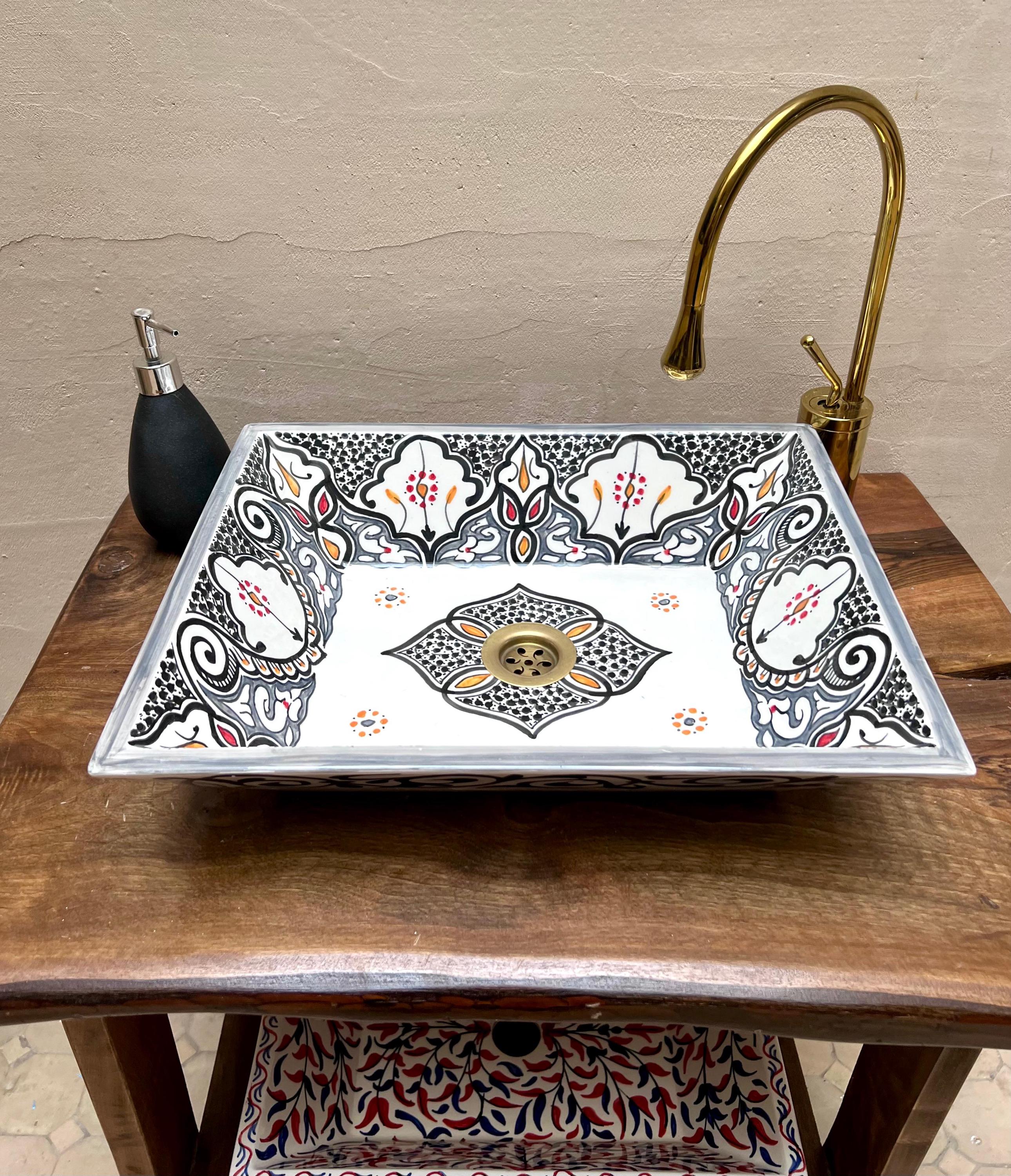 This beautiful Moroccan rectangular sink is handmade by skilled artisans using high-quality ceramic. Featuring traditional hand-painted designs and a smooth glazed finish, it is both durable and easy to clean. Perfect for kitchens, bathrooms, or powder rooms, it adds a unique touch of Moroccan charm to any space. The sink comes with both silver and copper drains included for free. If you need a different size, feel free to contact us.