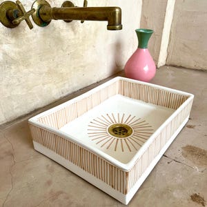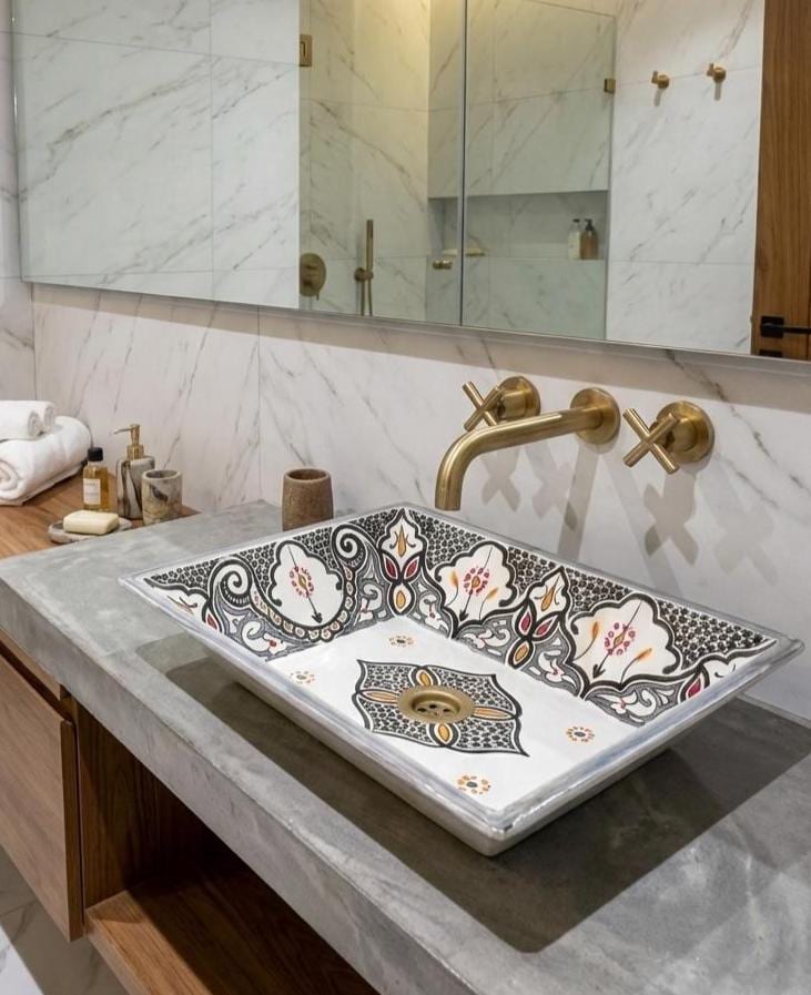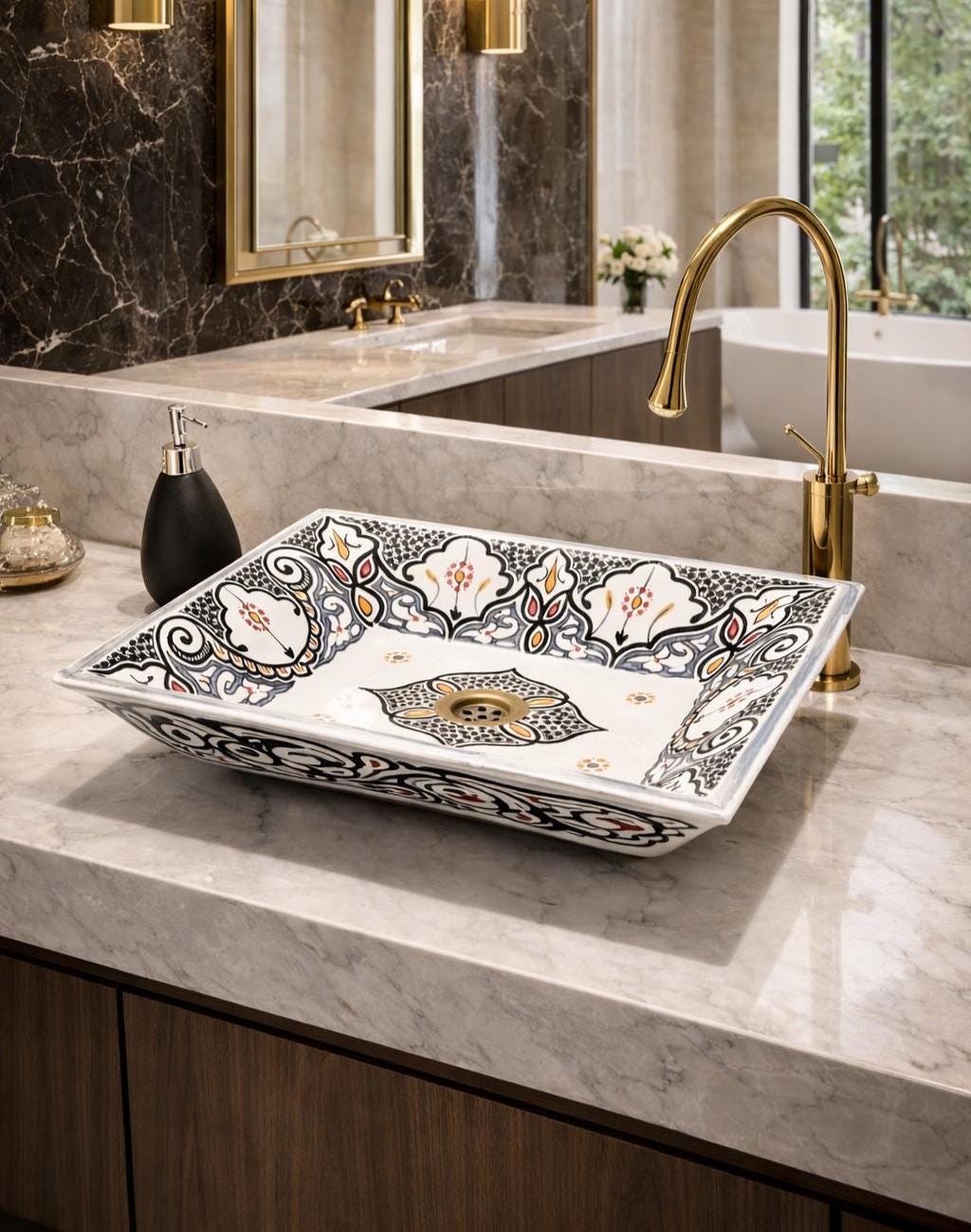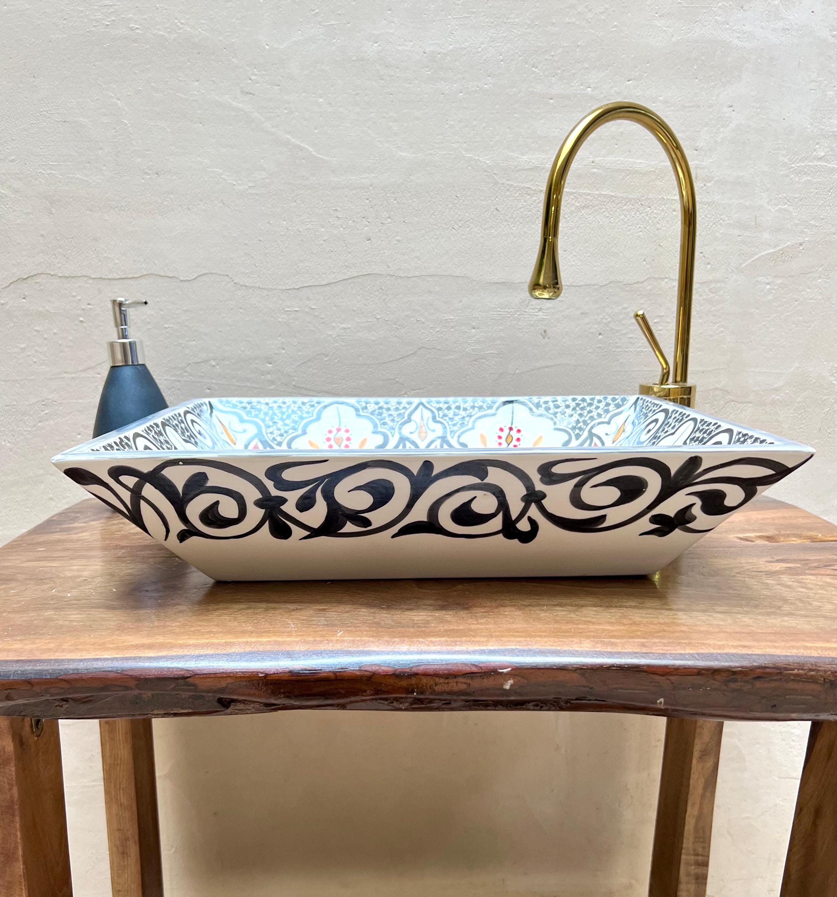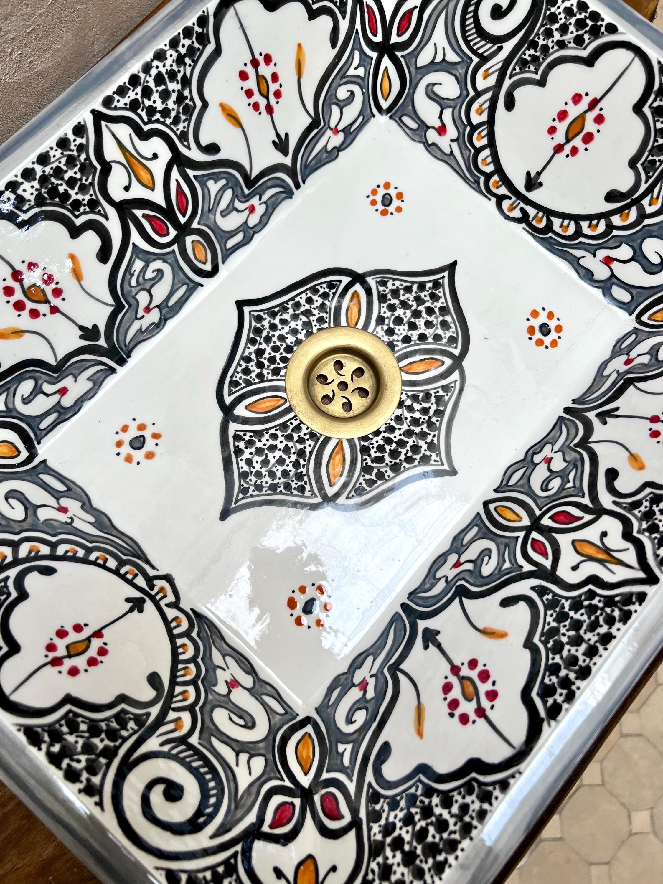 This beautiful Moroccan rectangular sink is handmade by skilled artisans using high-quality ceramic. Featuring traditional hand-painted designs and a smooth glazed finish, it is both durable and easy to clean. Perfect for kitchens, bathrooms, or powder rooms, it adds a unique touch of Moroccan charm to any space. The sink comes with both silver and copper drains included for free. If you need a different size, feel free to contact us.
