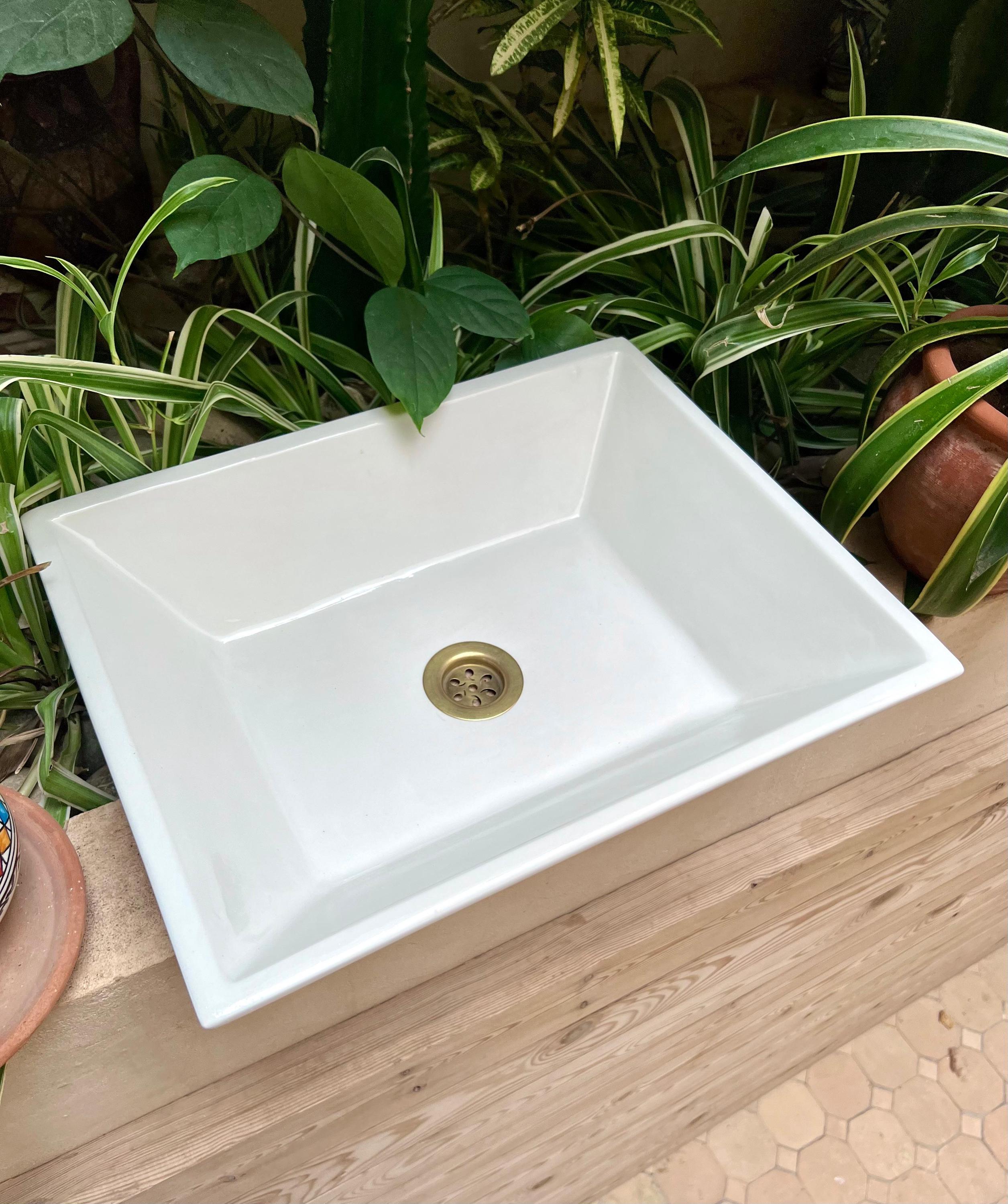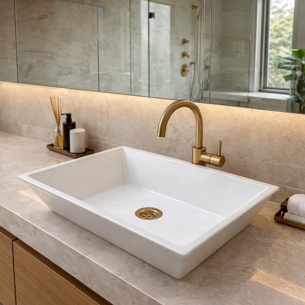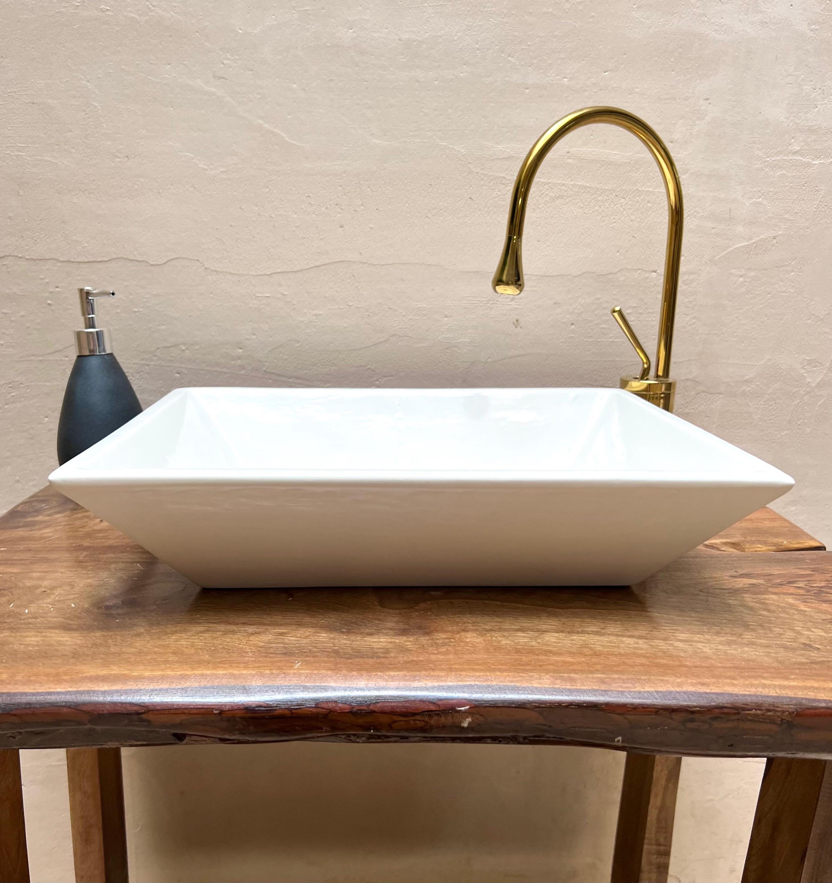 This modern rectangular ceramic vessel sink features a clean white finish and sharp architectural lines, making it a timeless choice for contemporary bathrooms. Its minimalist shape pairs beautifully with modern or classic faucets, while the smooth glazed surface offers durability and easy maintenance.