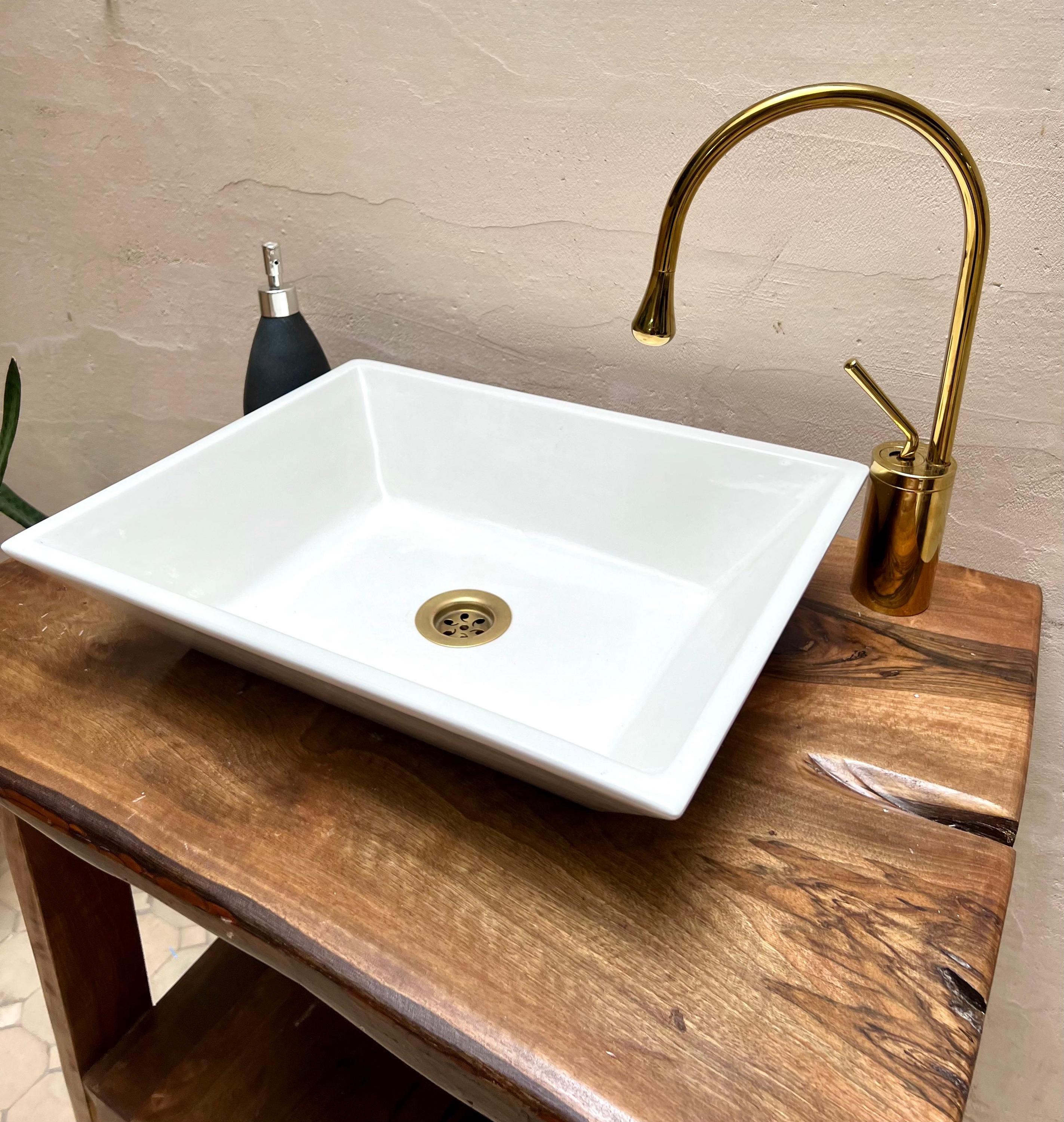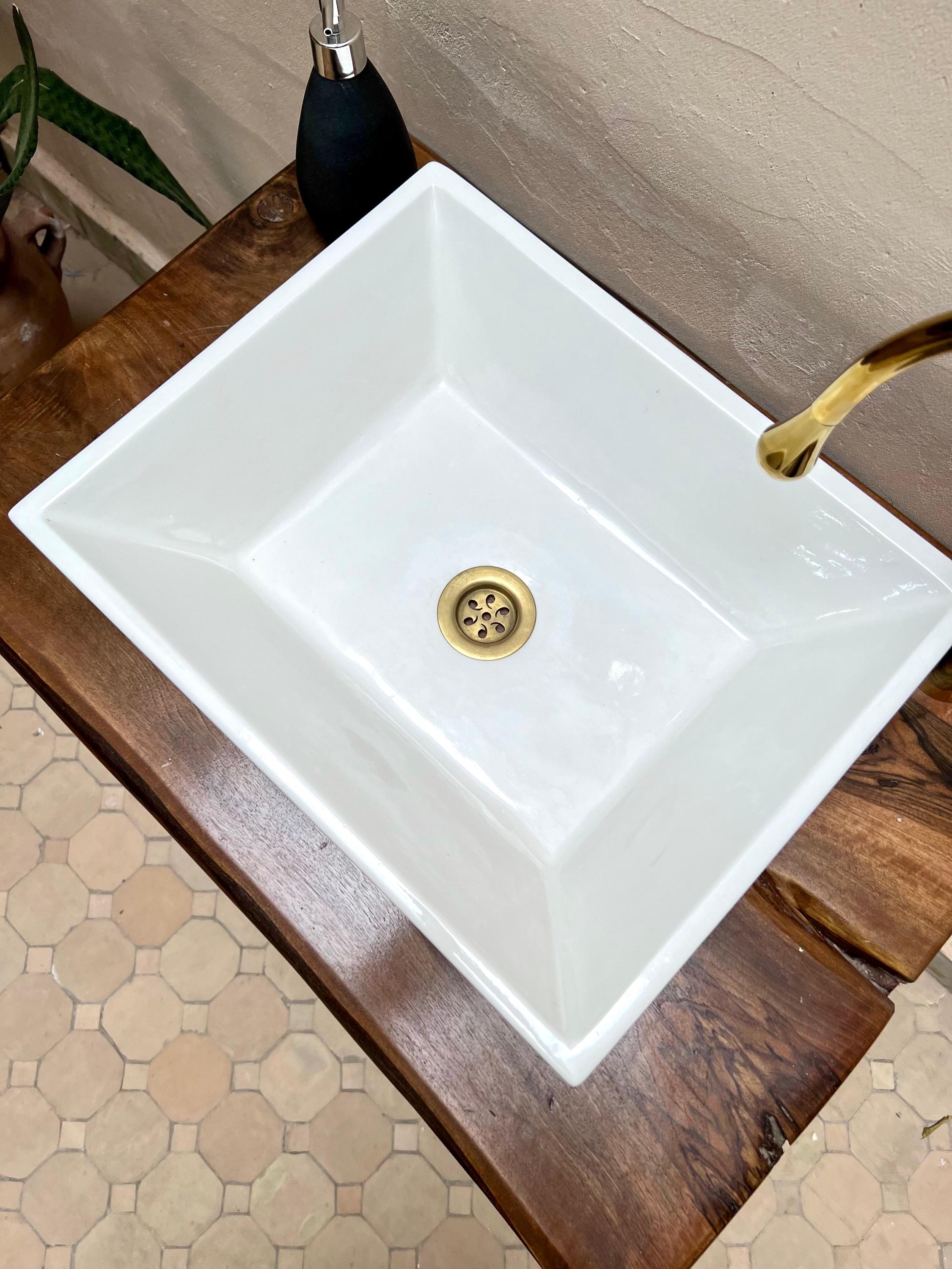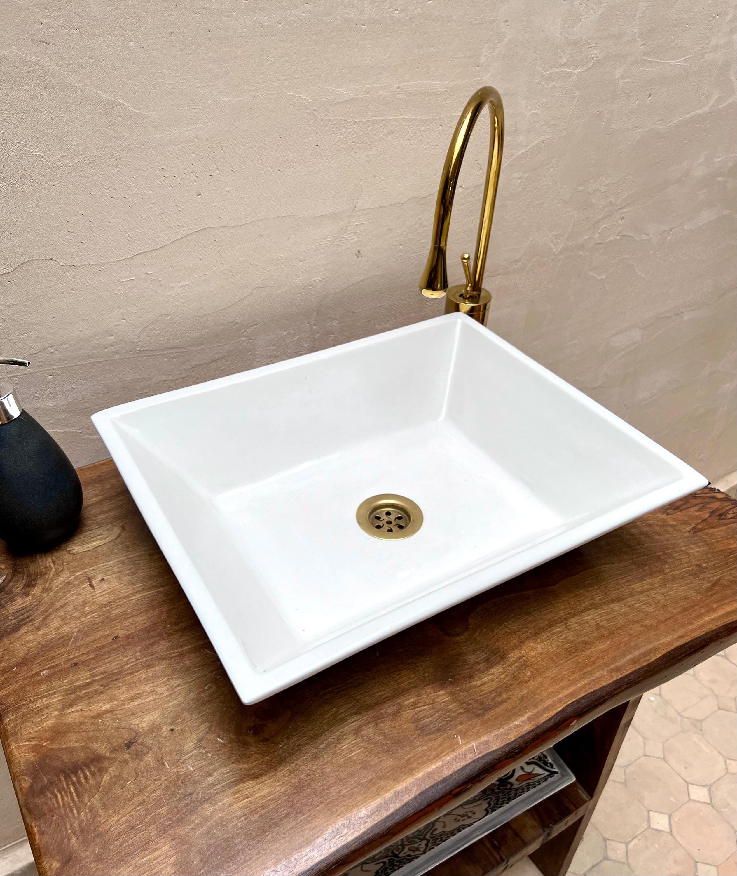 This modern rectangular ceramic vessel sink features a clean white finish and sharp architectural lines, making it a timeless choice for contemporary bathrooms. Its minimalist shape pairs beautifully with modern or classic faucets, while the smooth glazed surface offers durability and easy maintenance.