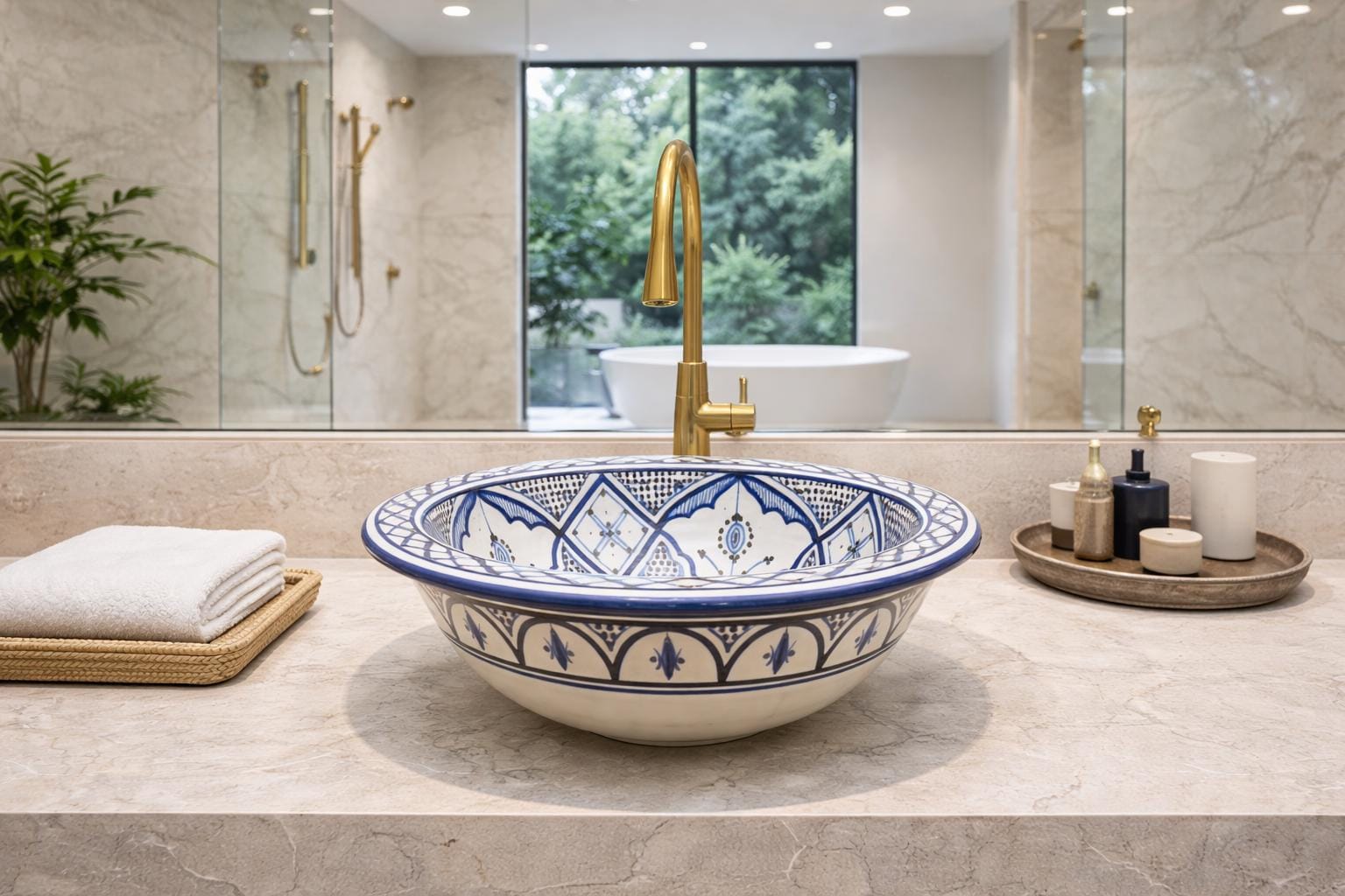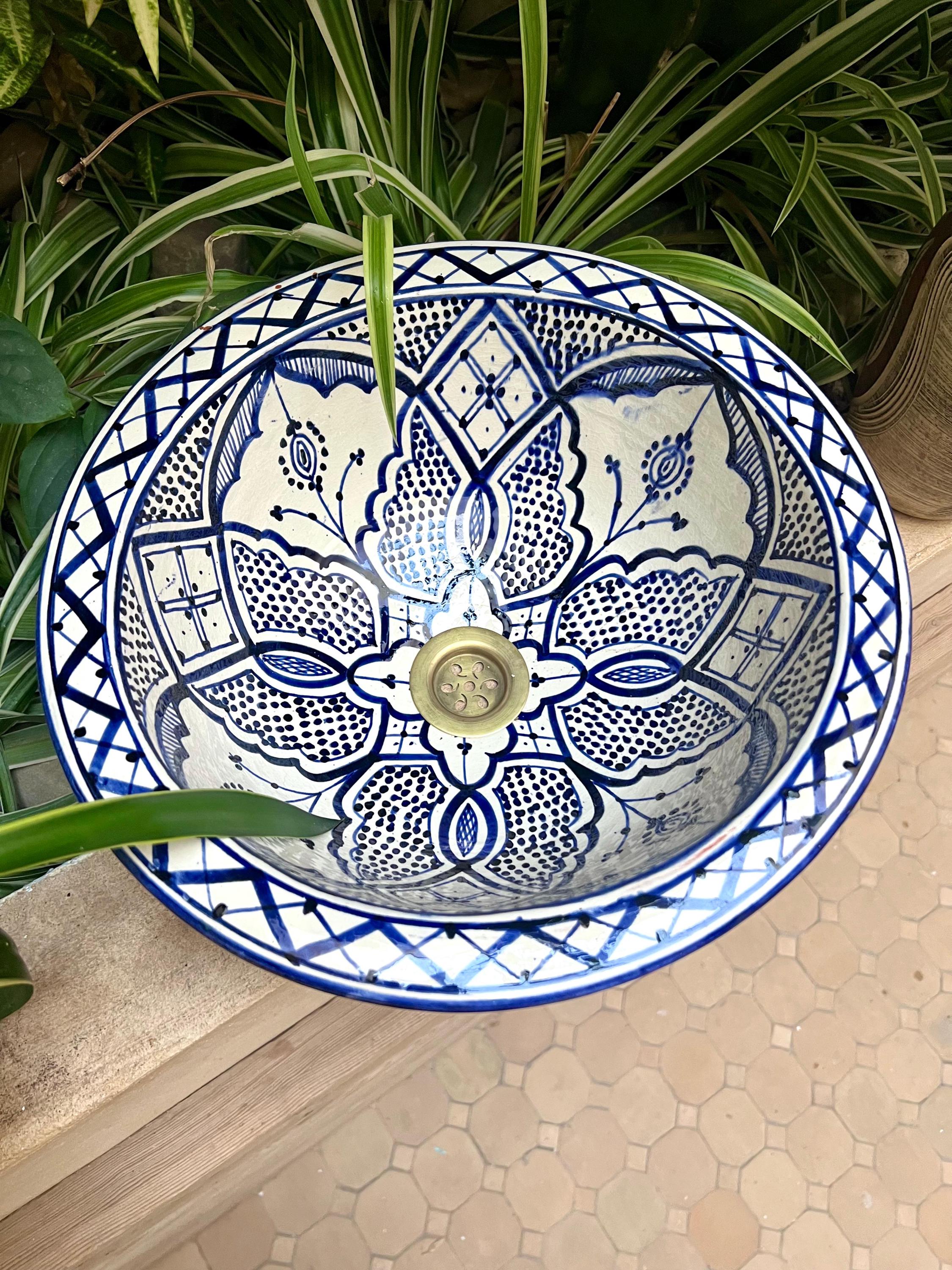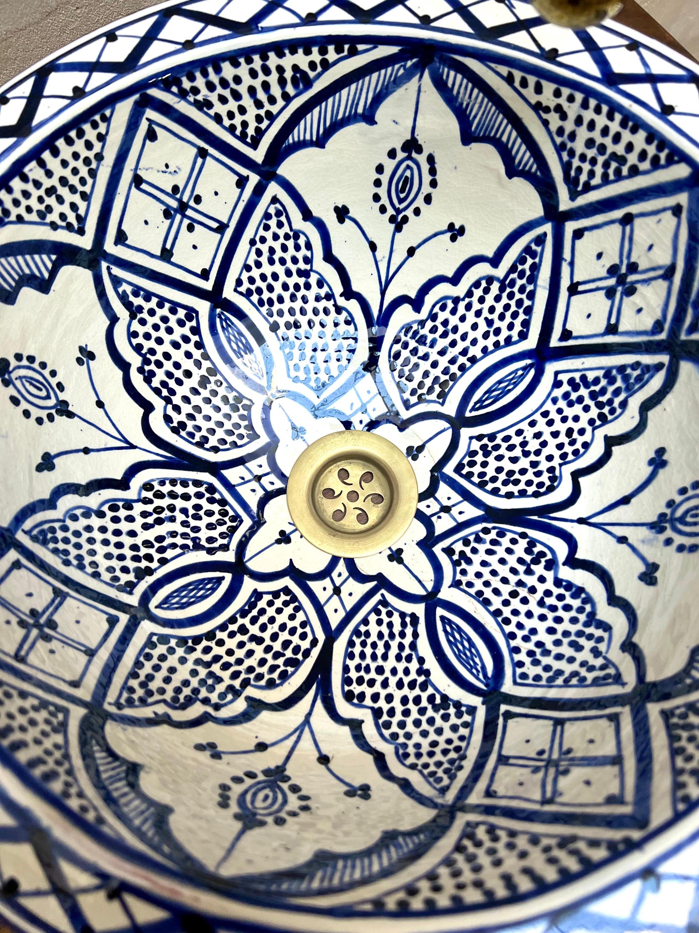 This beautiful Moroccan round ceramic sink is handcrafted by skilled artisans in Fes, made from high-quality clay, and features intricate hand-painted designs with a smooth glazed finish. Made from high-quality ceramic, it is durable, easy to clean, and perfect for bathrooms, kitchens, or powder rooms. Its timeless design adds a touch of Moroccan elegance to any space. The sink comes with both silver and copper drains included for free. Each piece is truly unique, and as a result, minor imperfections are to be expected. If you need a different size, feel free to contact us.
