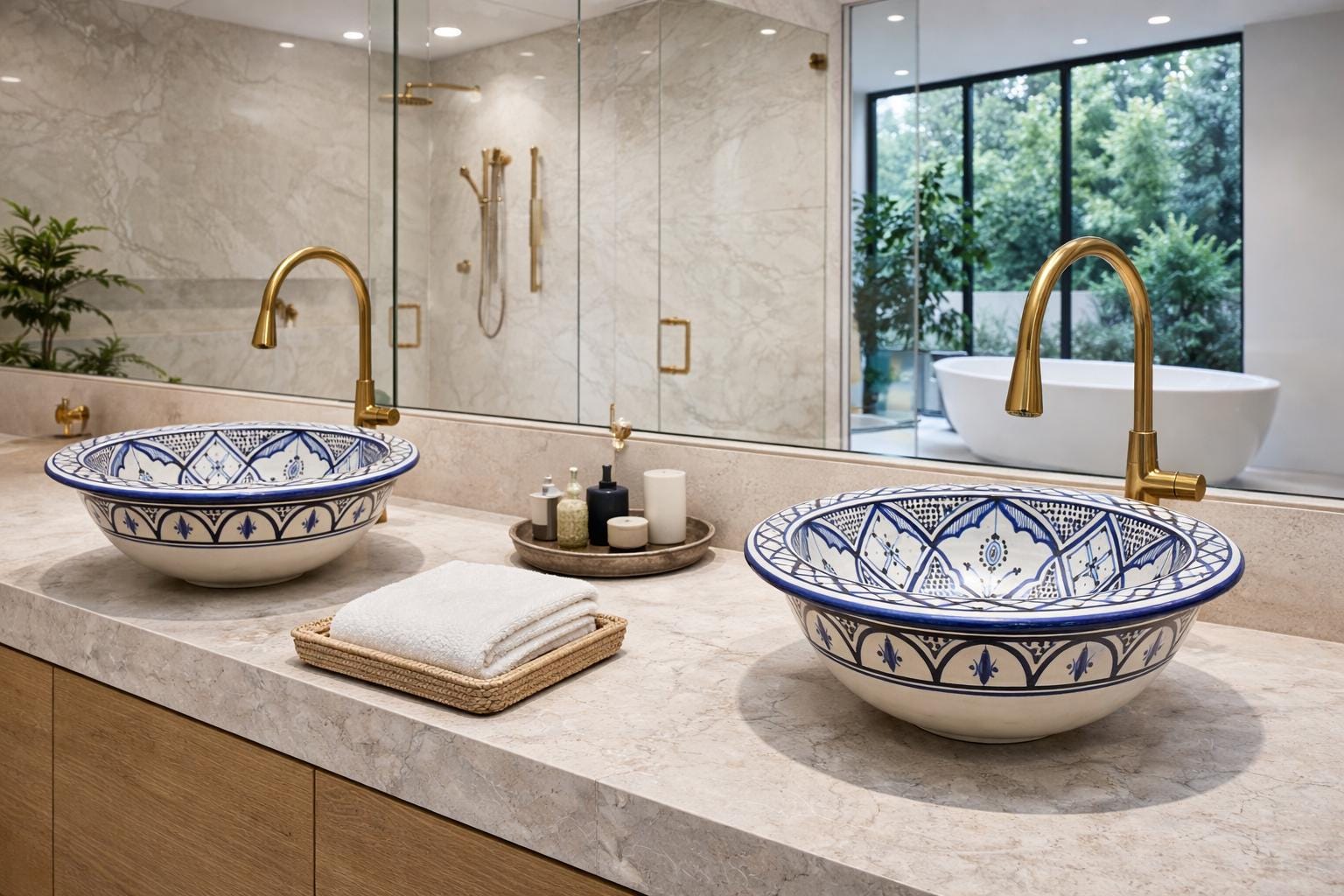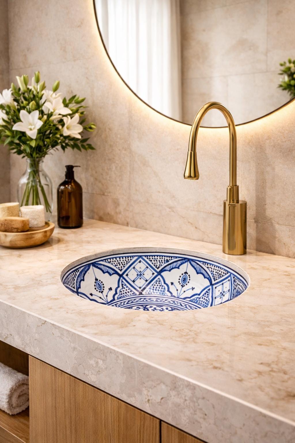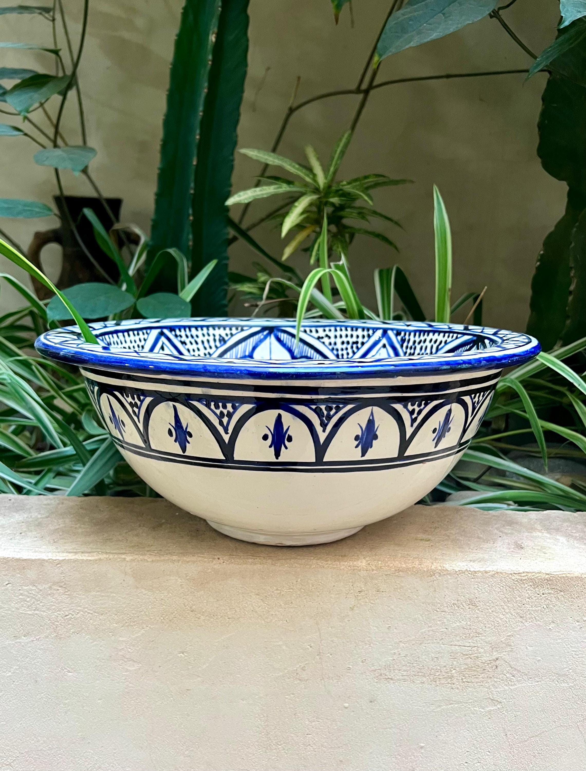 This beautiful Moroccan round ceramic sink is handcrafted by skilled artisans in Fes, made from high-quality clay, and features intricate hand-painted designs with a smooth glazed finish. Made from high-quality ceramic, it is durable, easy to clean, and perfect for bathrooms, kitchens, or powder rooms. Its timeless design adds a touch of Moroccan elegance to any space. The sink comes with both silver and copper drains included for free. Each piece is truly unique, and as a result, minor imperfections are to be expected. If you need a different size, feel free to contact us.