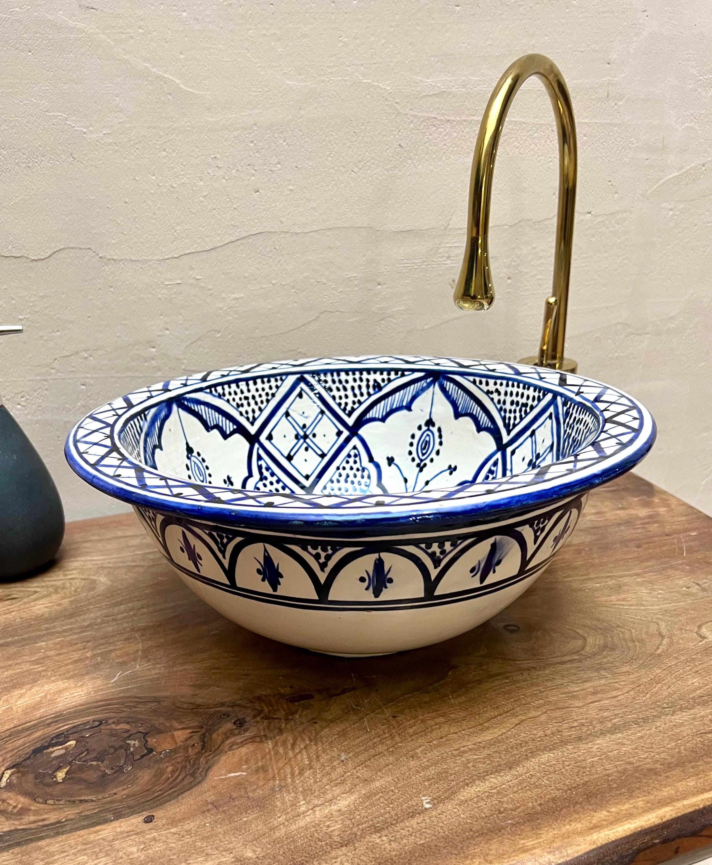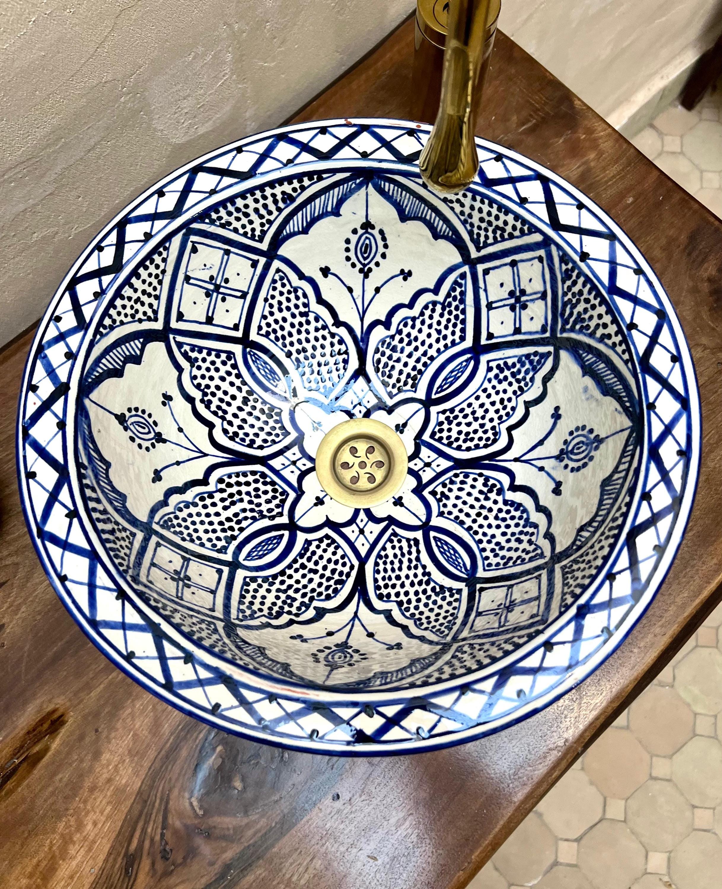 Handmade Moroccan Ceramic Sink: Blue Berber Design Sink with Rim, Free Drains