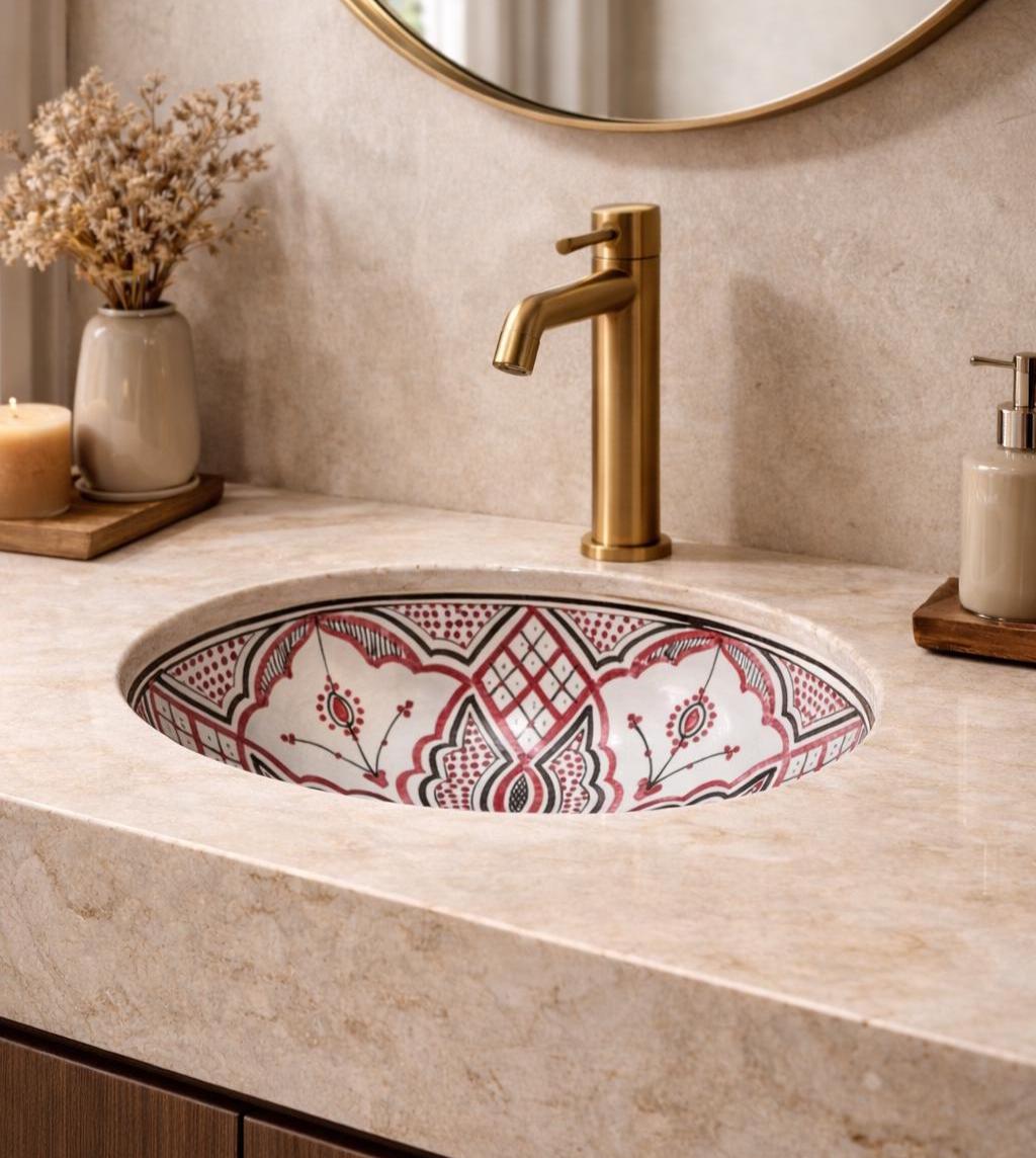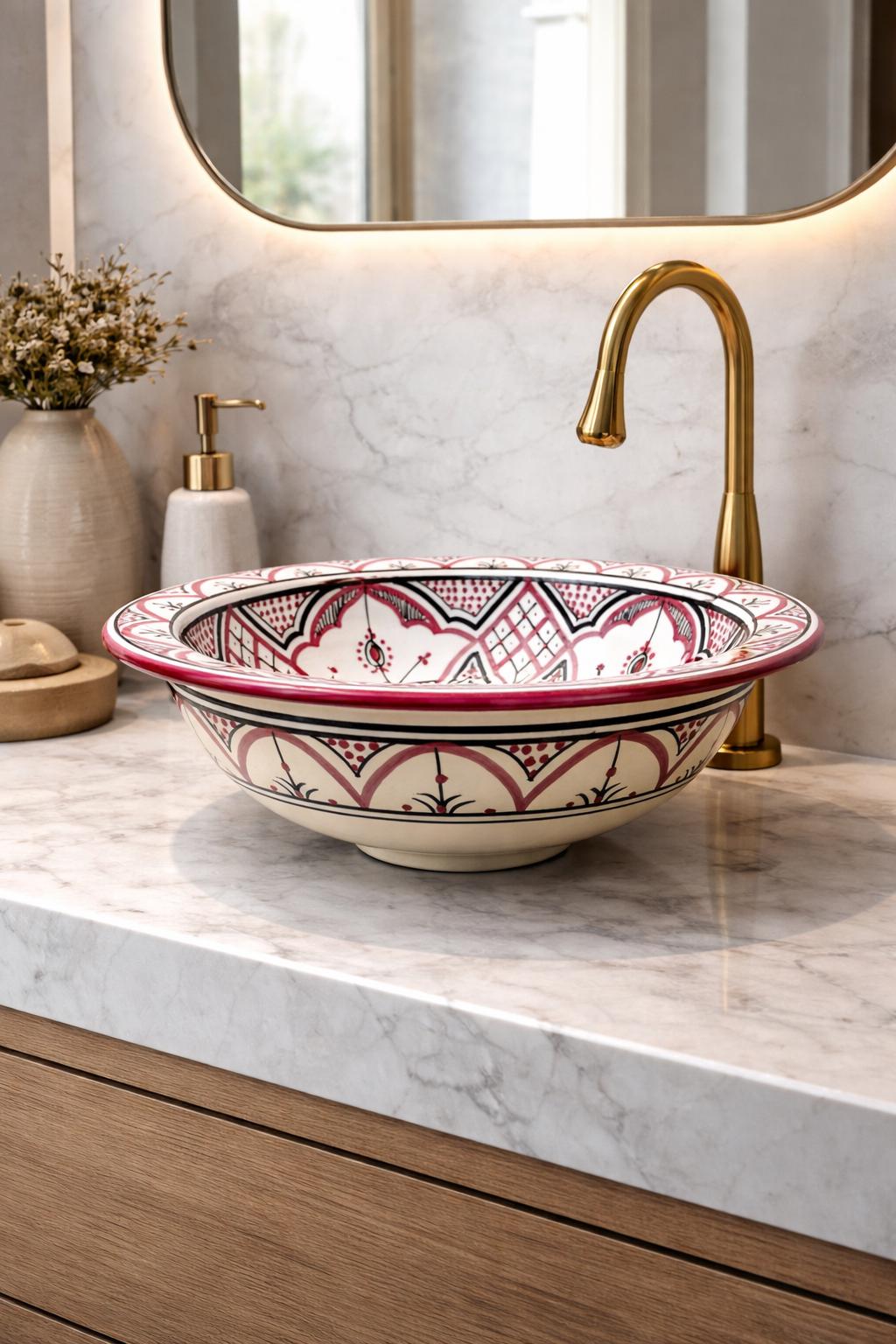 This beautiful Moroccan round ceramic sink is handcrafted by skilled artisans in Fes, made from high-quality clay, and features intricate hand-painted designs with a smooth glazed finish. Made from high-quality ceramic, it is durable, easy to clean, and perfect for bathrooms, kitchens, or powder rooms. Its timeless design adds a touch of Moroccan elegance to any space. The sink comes with both silver and copper drains included for free. Each piece is truly unique, and as a result, minor imperfections are to be expected. If you need a different size, feel free to contact us.
