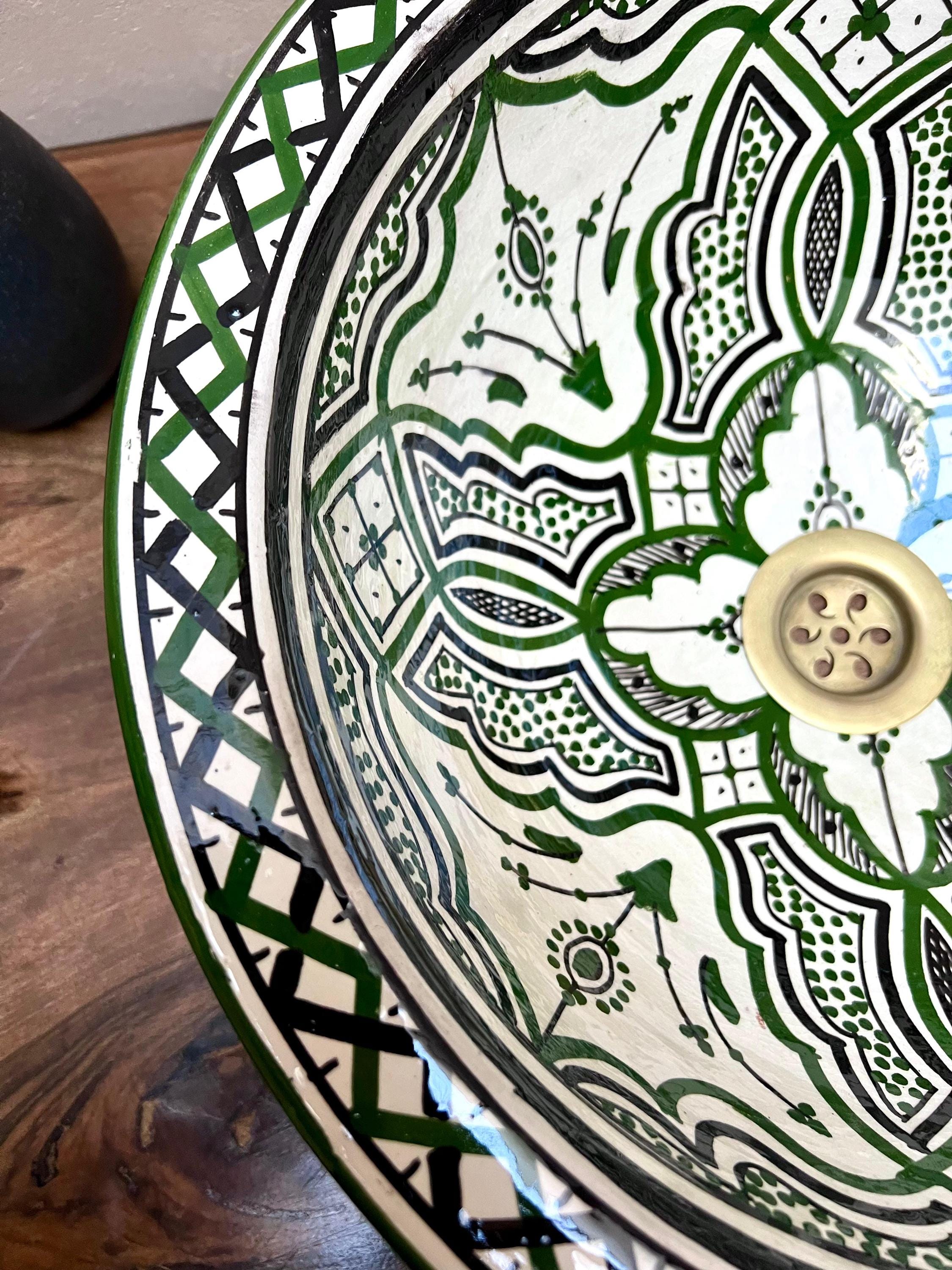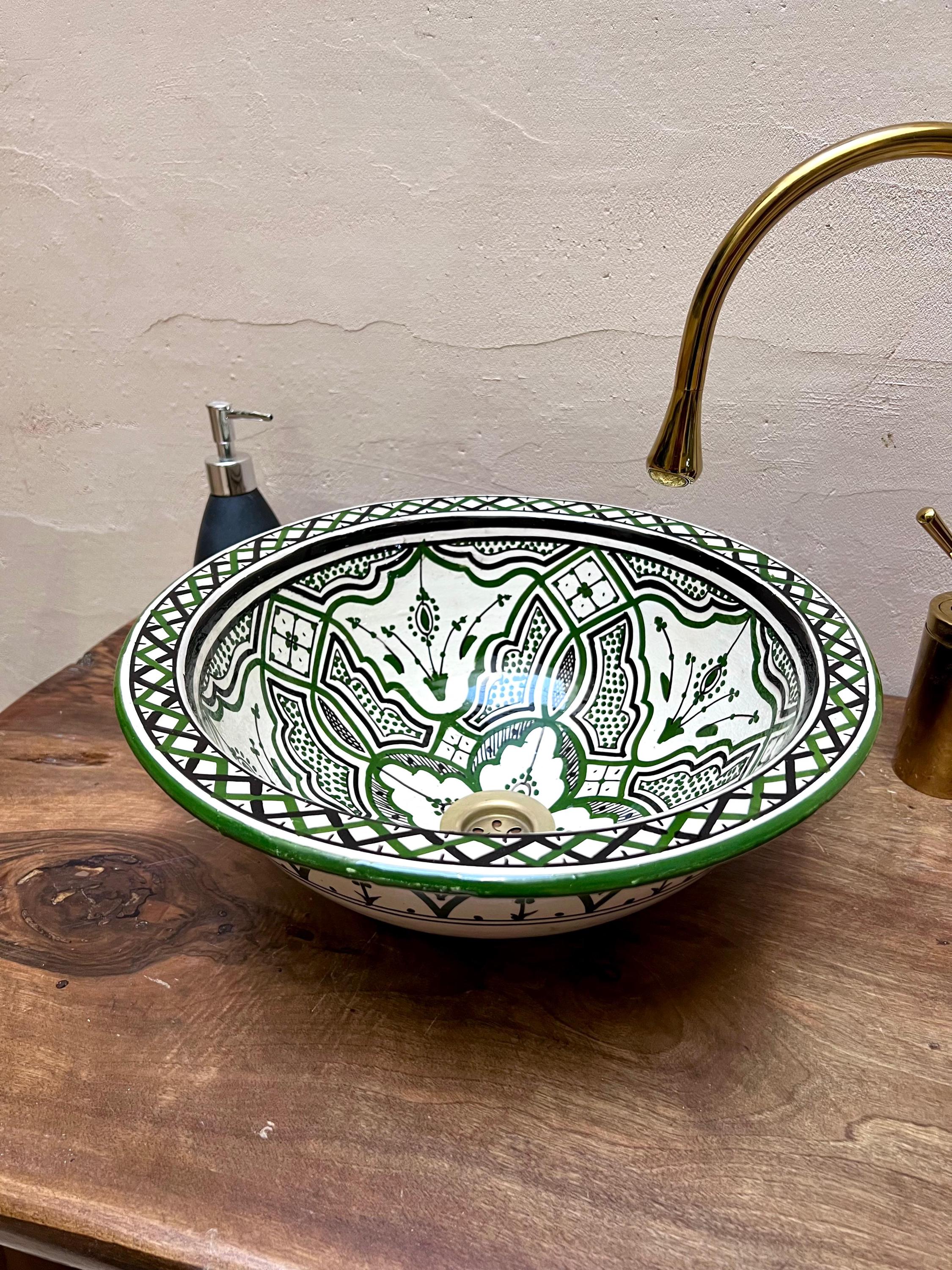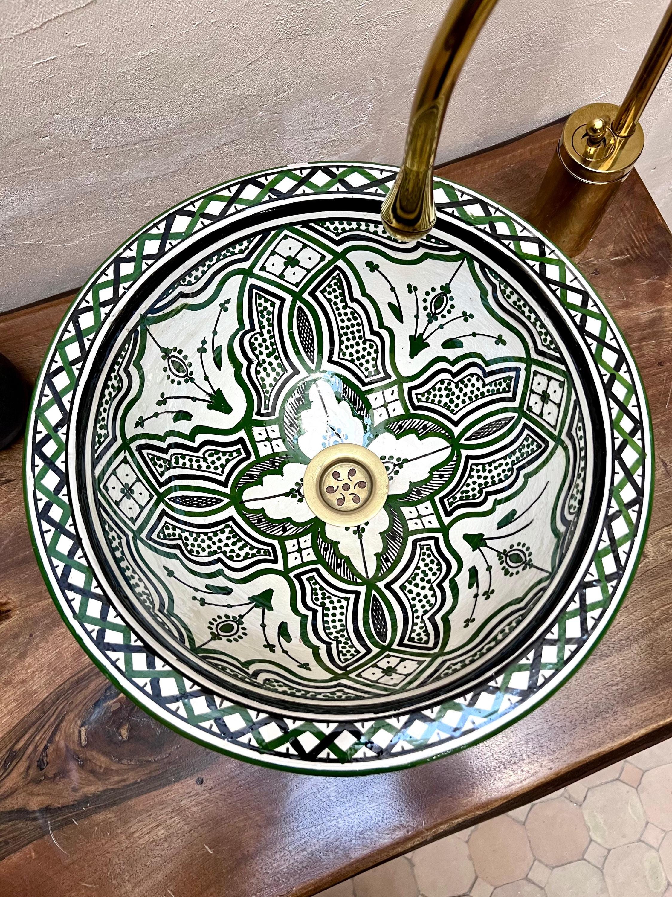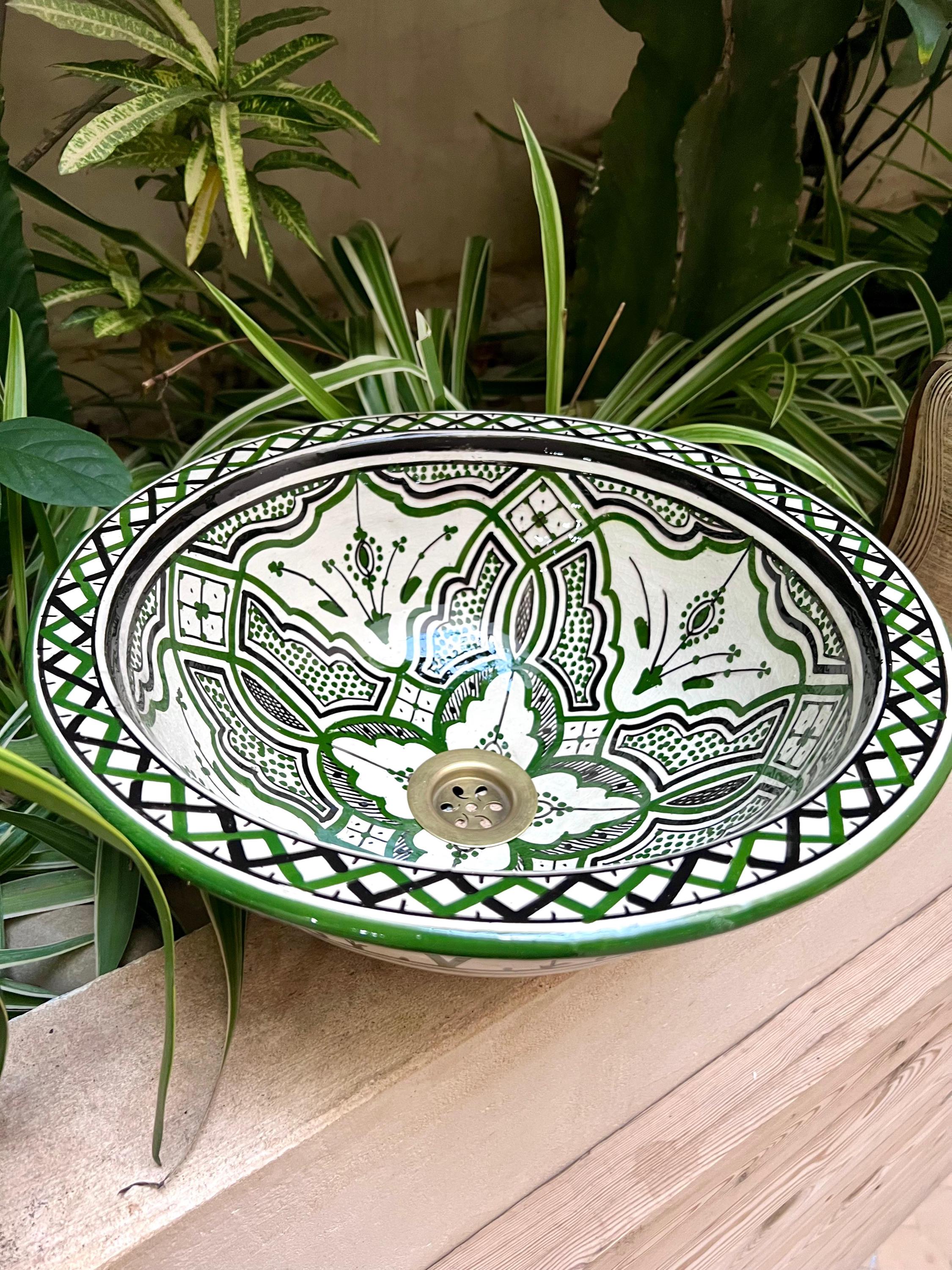 Handmade Moroccan Ceramic Sink: Green Berber Design Sink with Rim, Free Drains