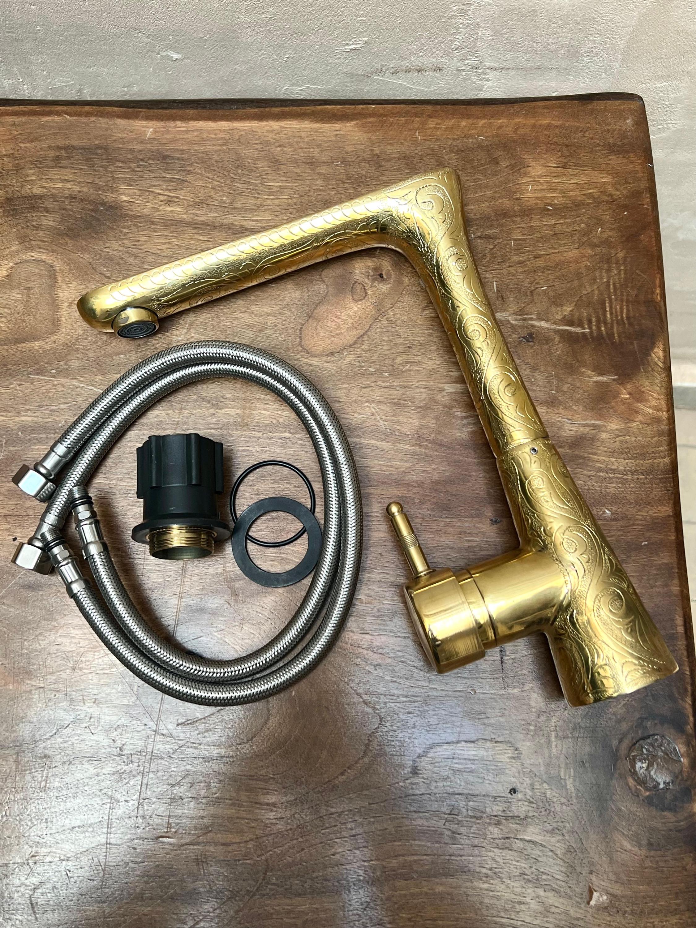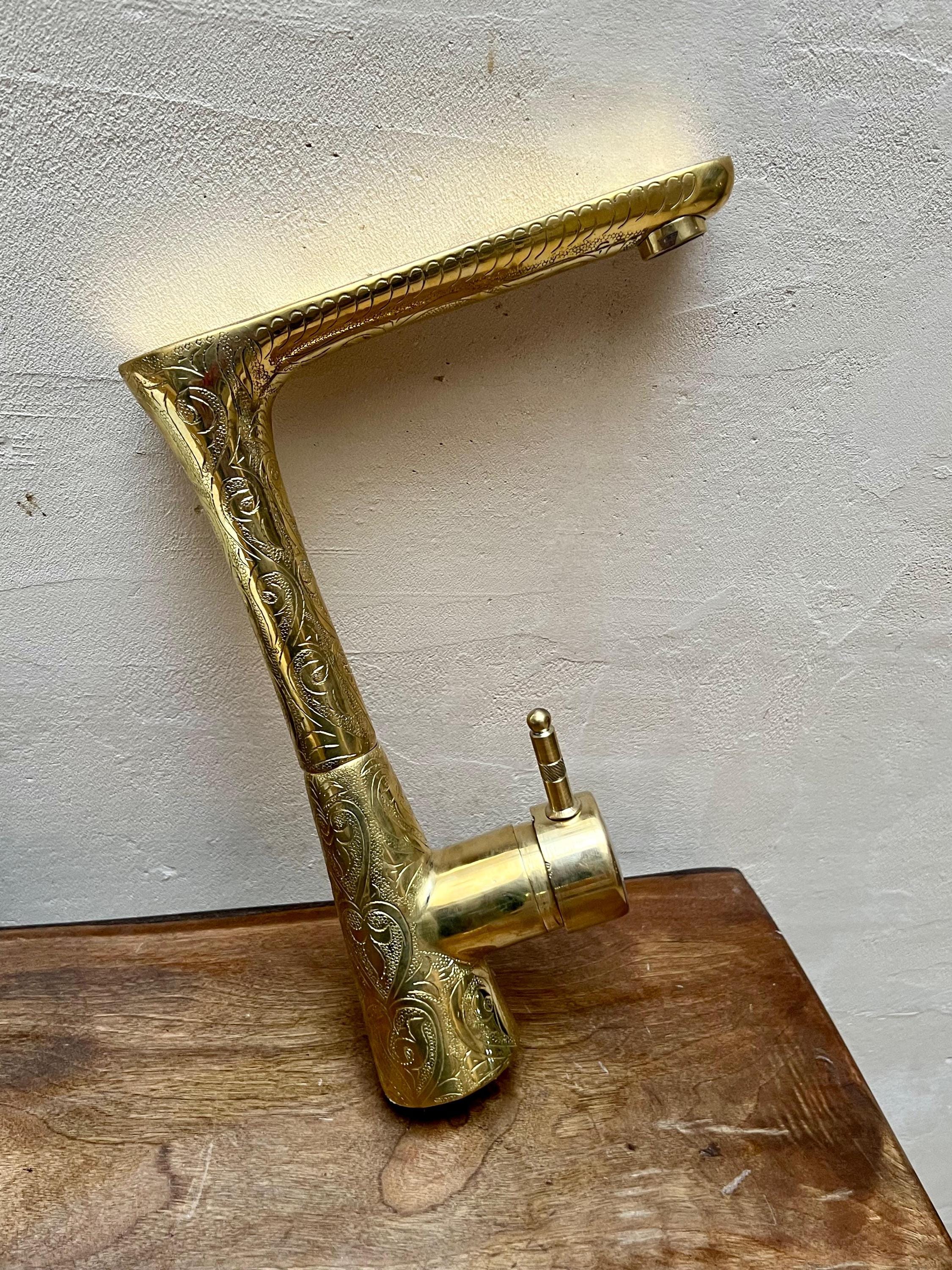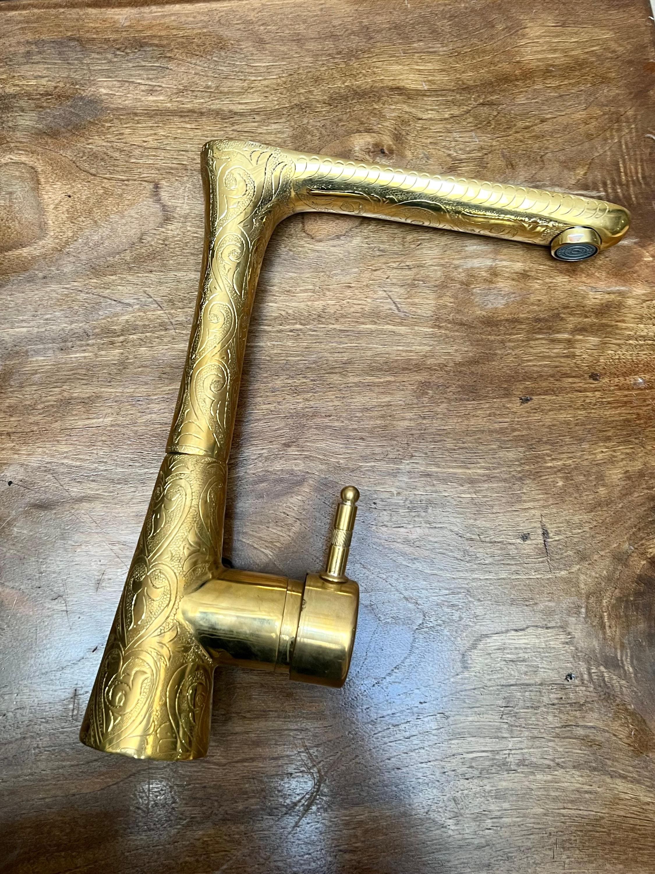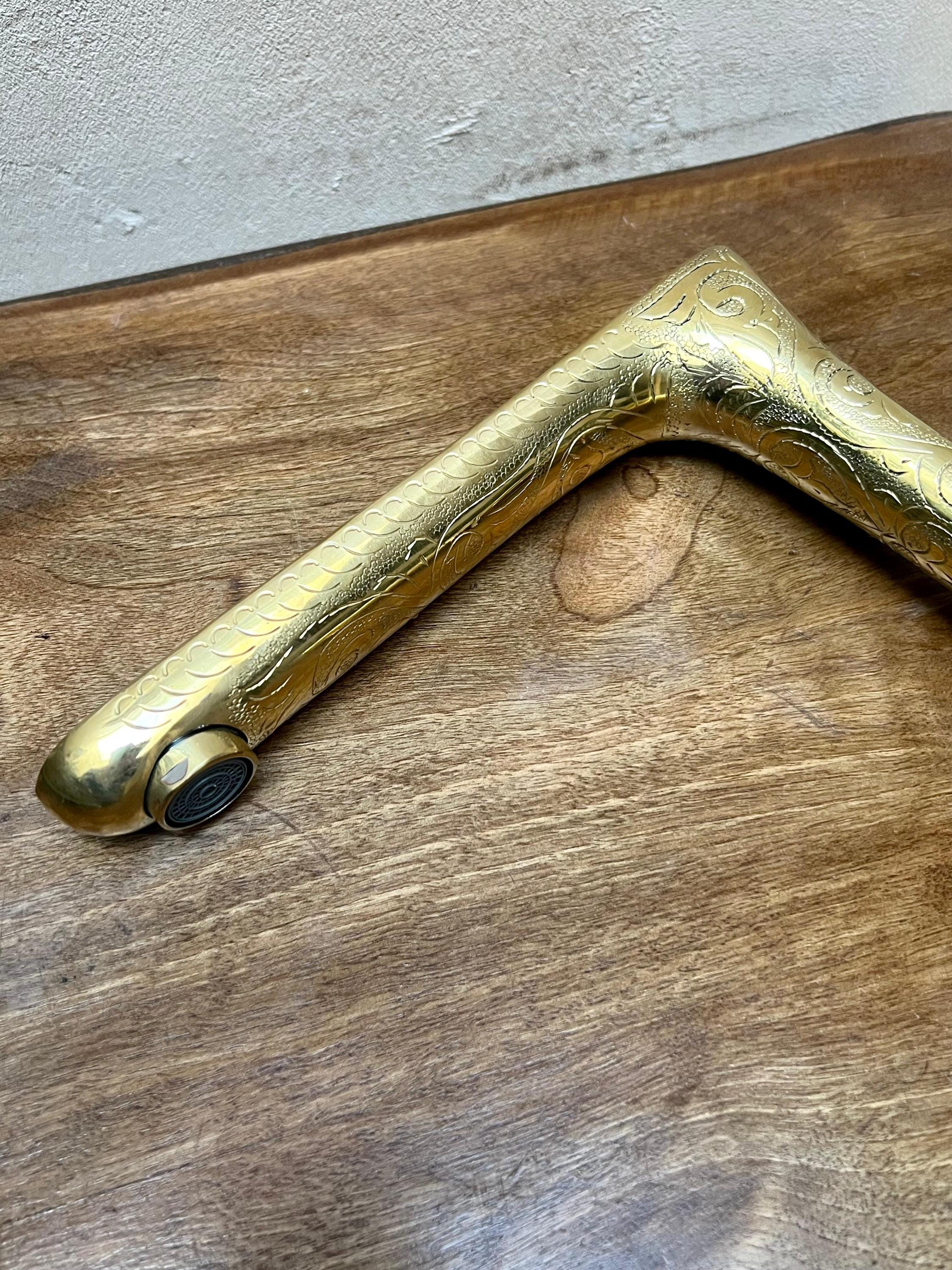 This elegant bathroom faucet features a hand-Engraved brass finish with a warm golden tone that adds depth, texture, and artisanal character. Its slim, elongated spout and softly curved profile create a refined modern silhouette while preserving a timeless, handcrafted feel.