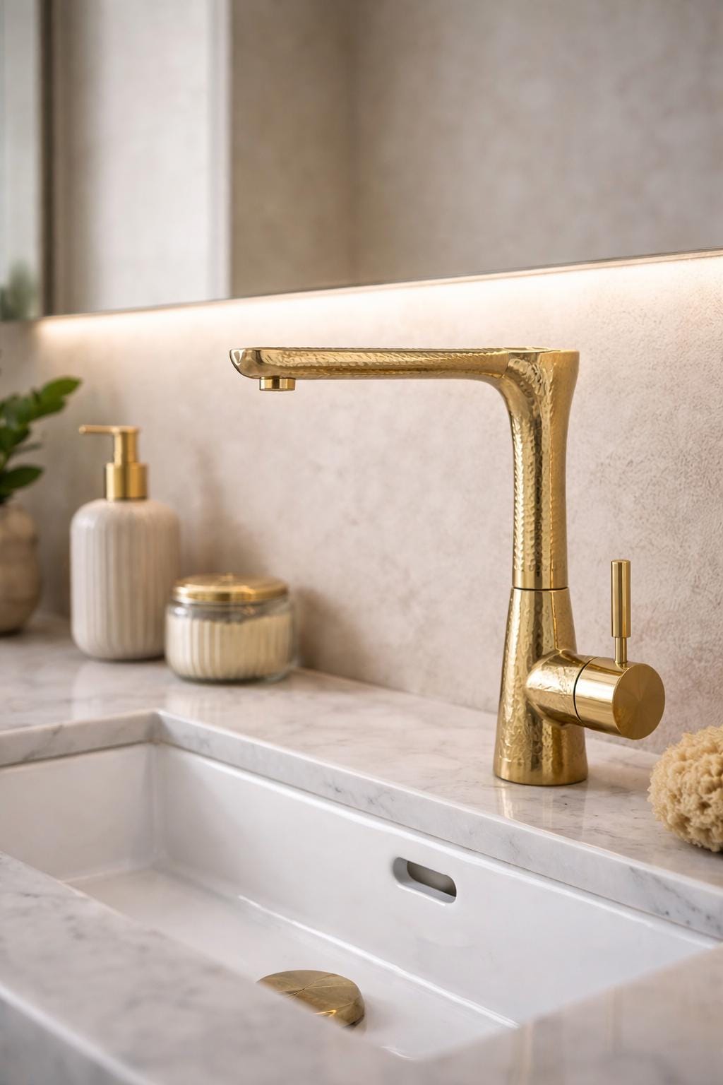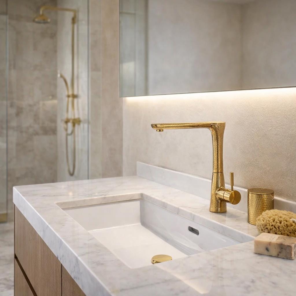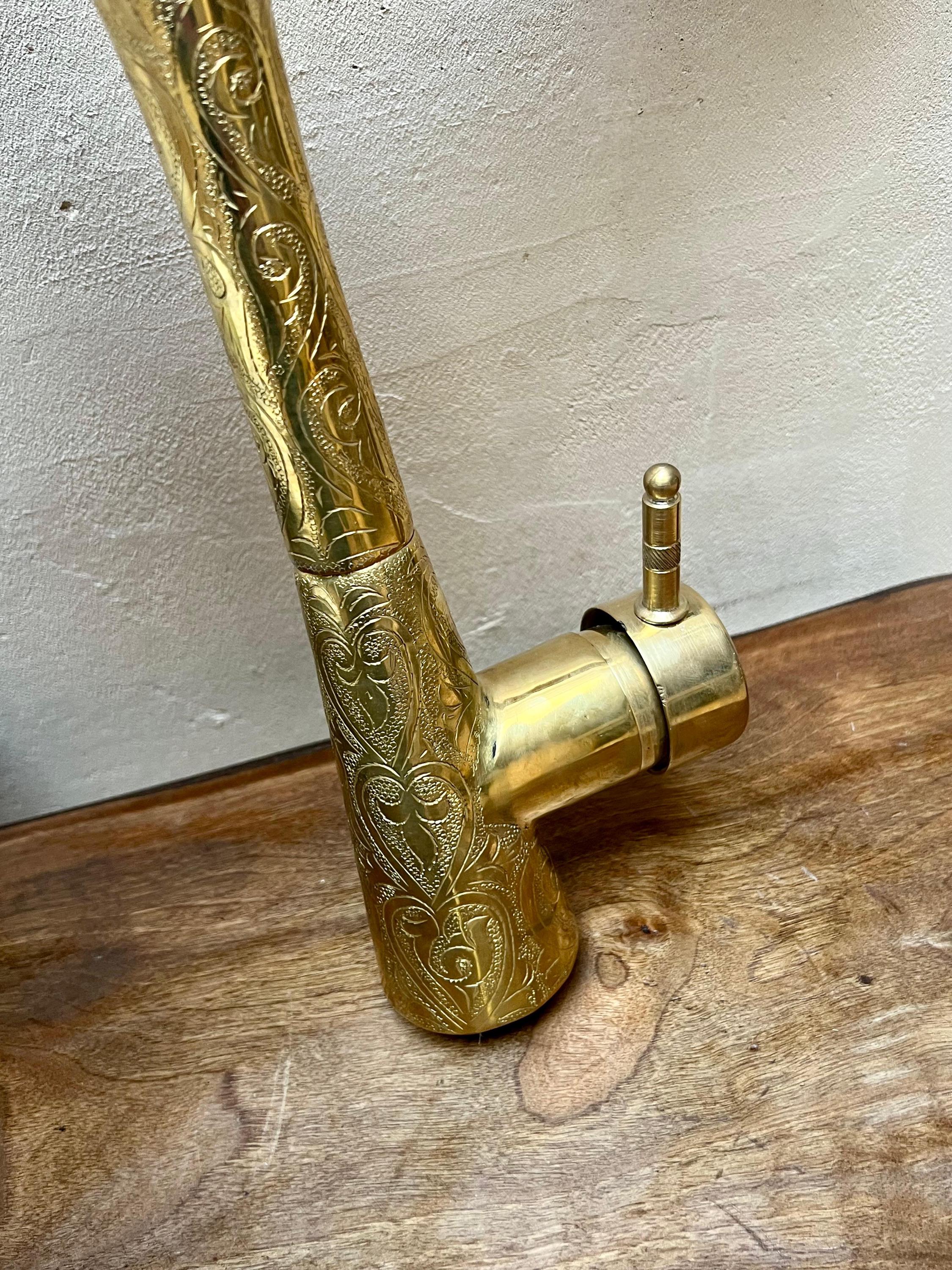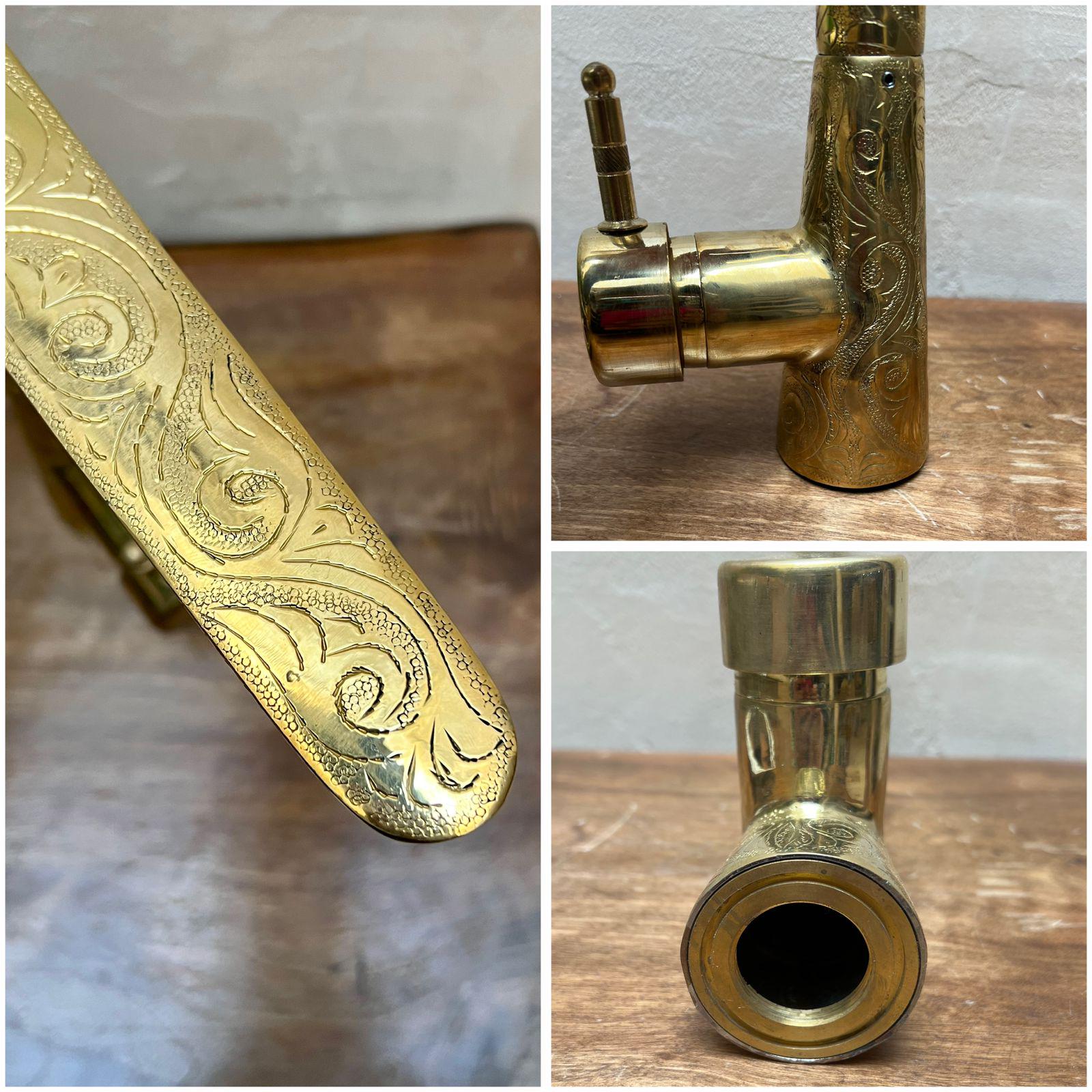 This elegant bathroom faucet features a hand-Engraved brass finish with a warm golden tone that adds depth, texture, and artisanal character. Its slim, elongated spout and softly curved profile create a refined modern silhouette while preserving a timeless, handcrafted feel.