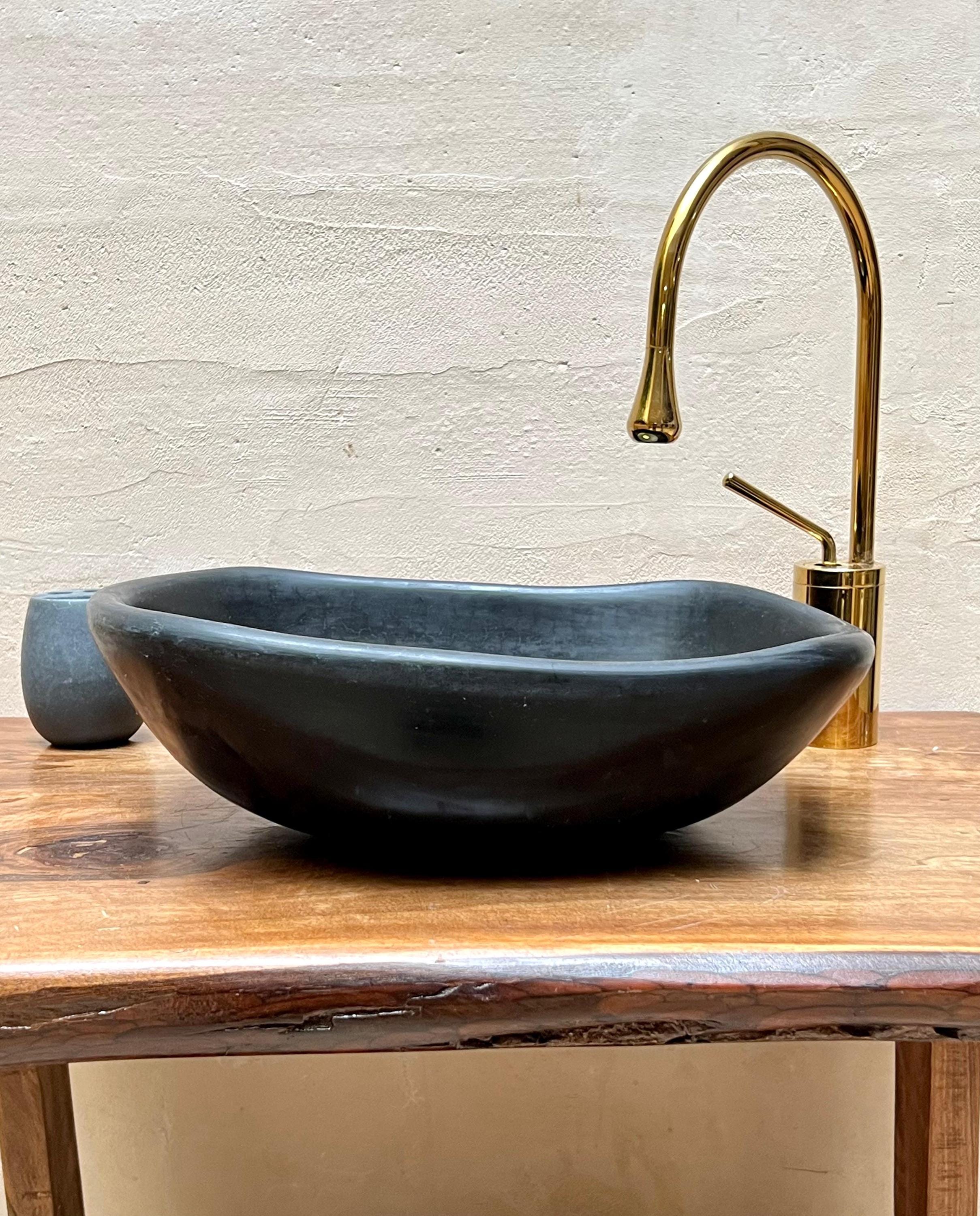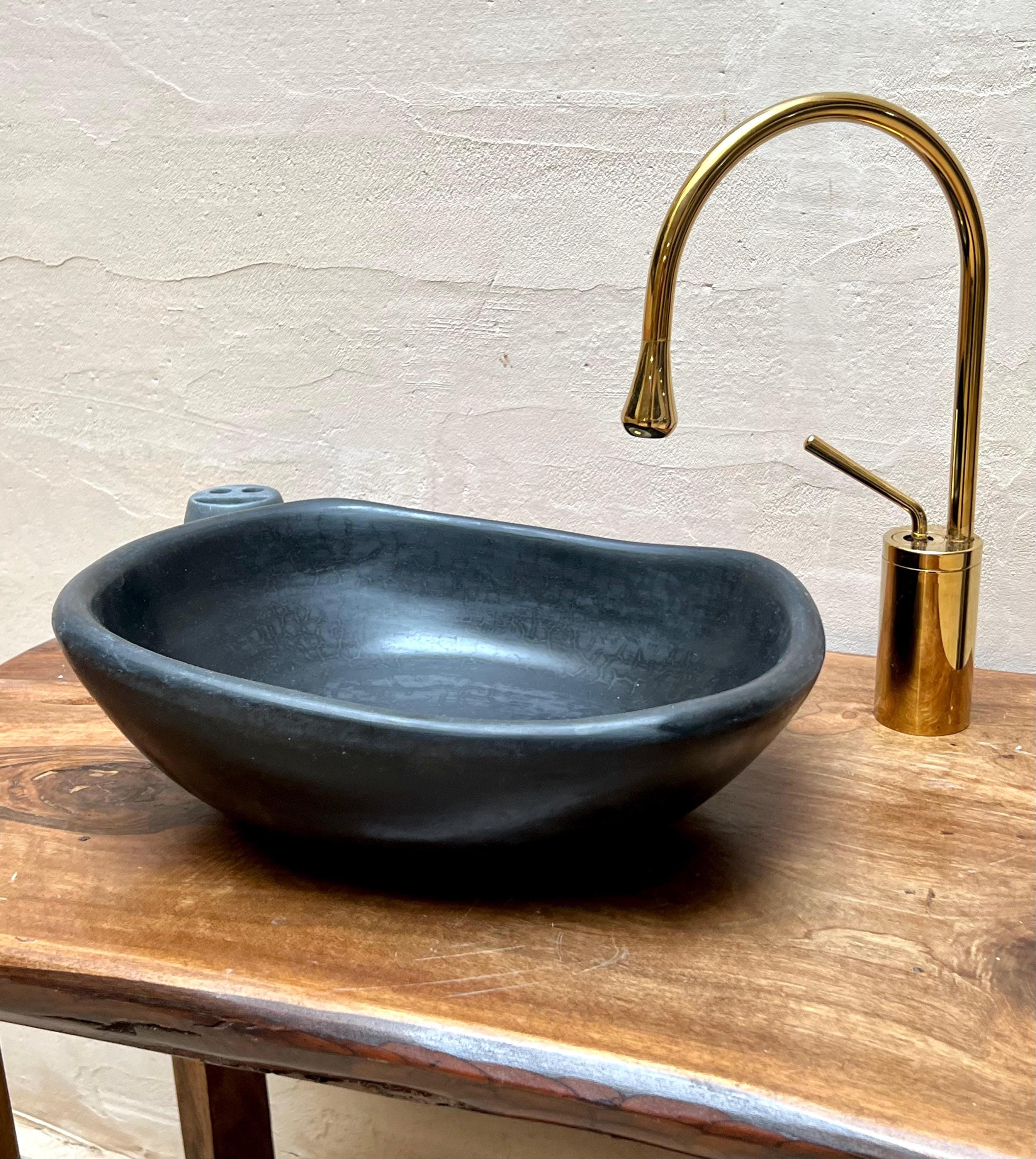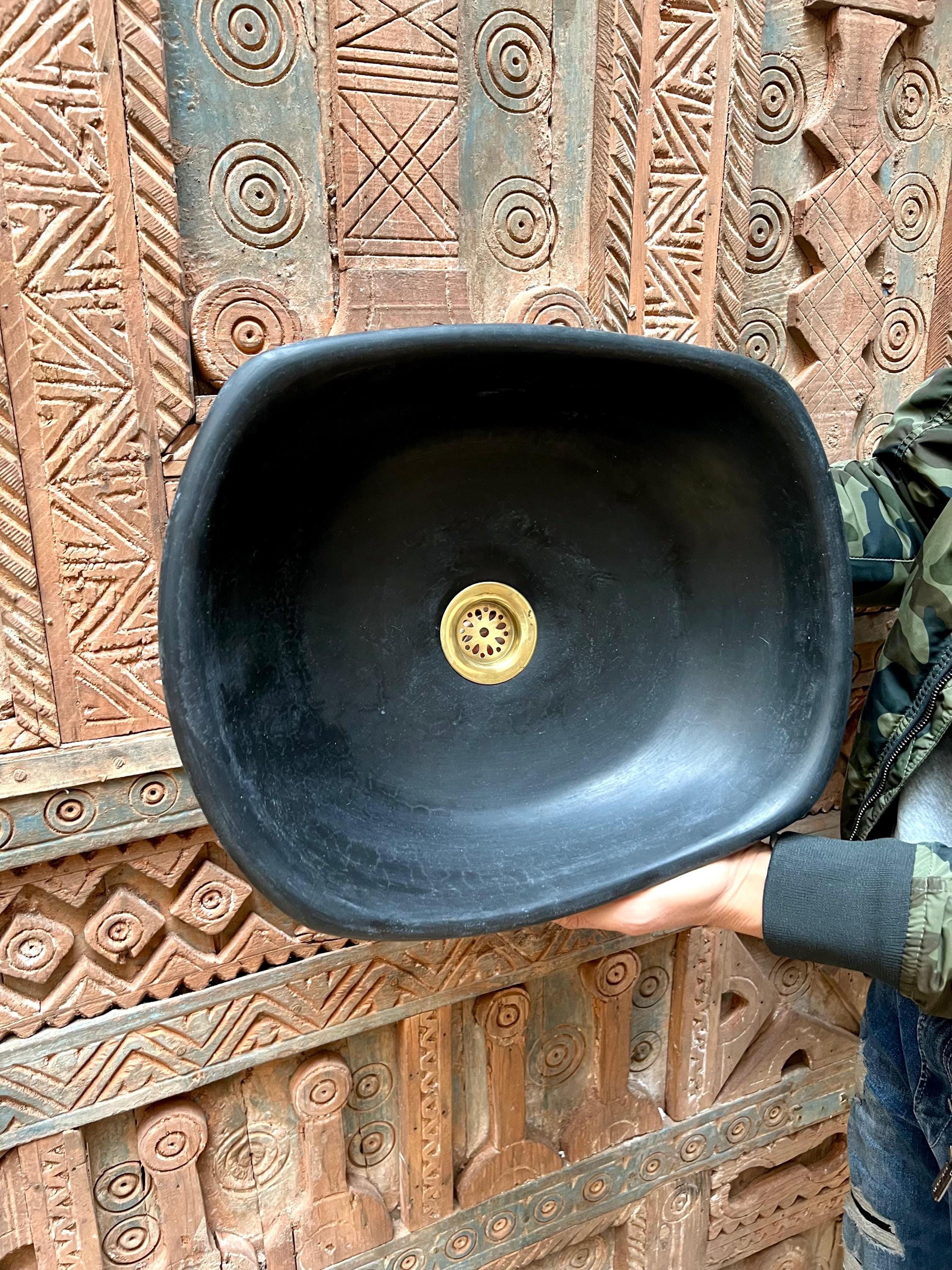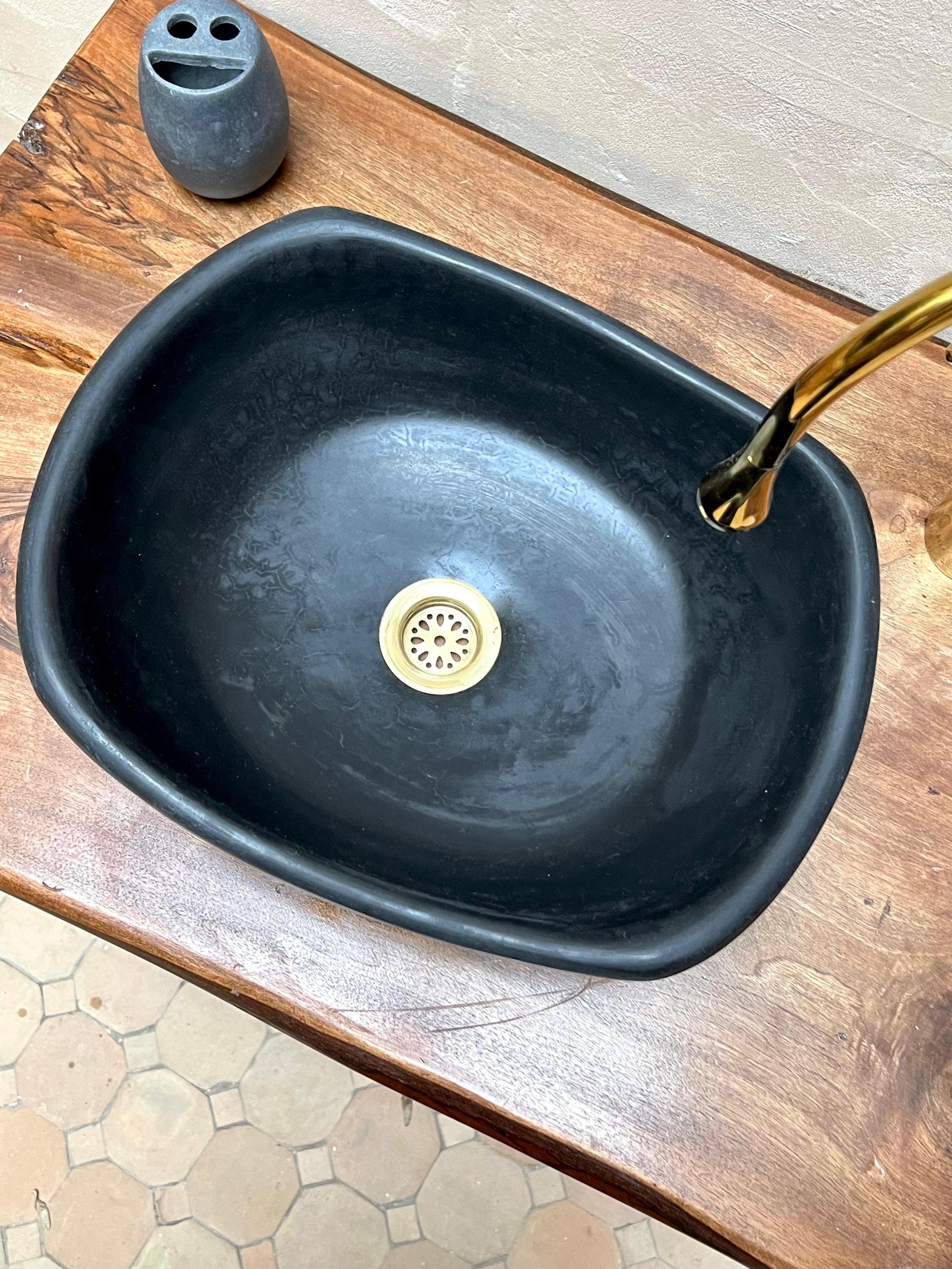 This unique black Tadelakt sink, handcrafted in Morocco using authentic traditional techniques, brings a refined natural touch to any bathroom. Its elegant oval shape combined with a deep anthracite-black finish creates a timeless, contemporary look that sits beautifully on vanity tops and countertops.