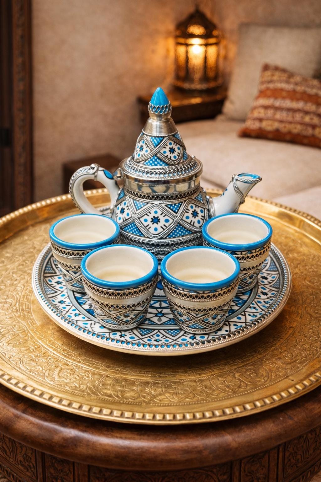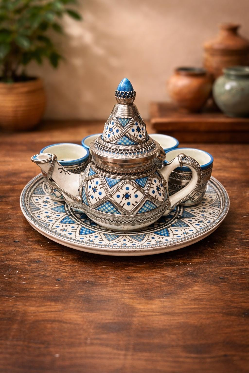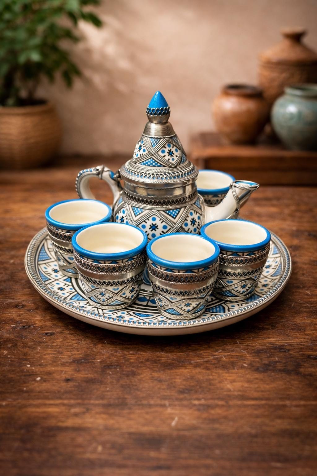 ✅ Product Description Bring the warmth and hospitality of Moroccan tradition to your home with this exquisite handmade tea set. This authentic set includes a beautifully detailed ceramic teapot, four matching cups, and a decorative tray — all hand-painted in striking blue and white geometric patterns with silver accents.
