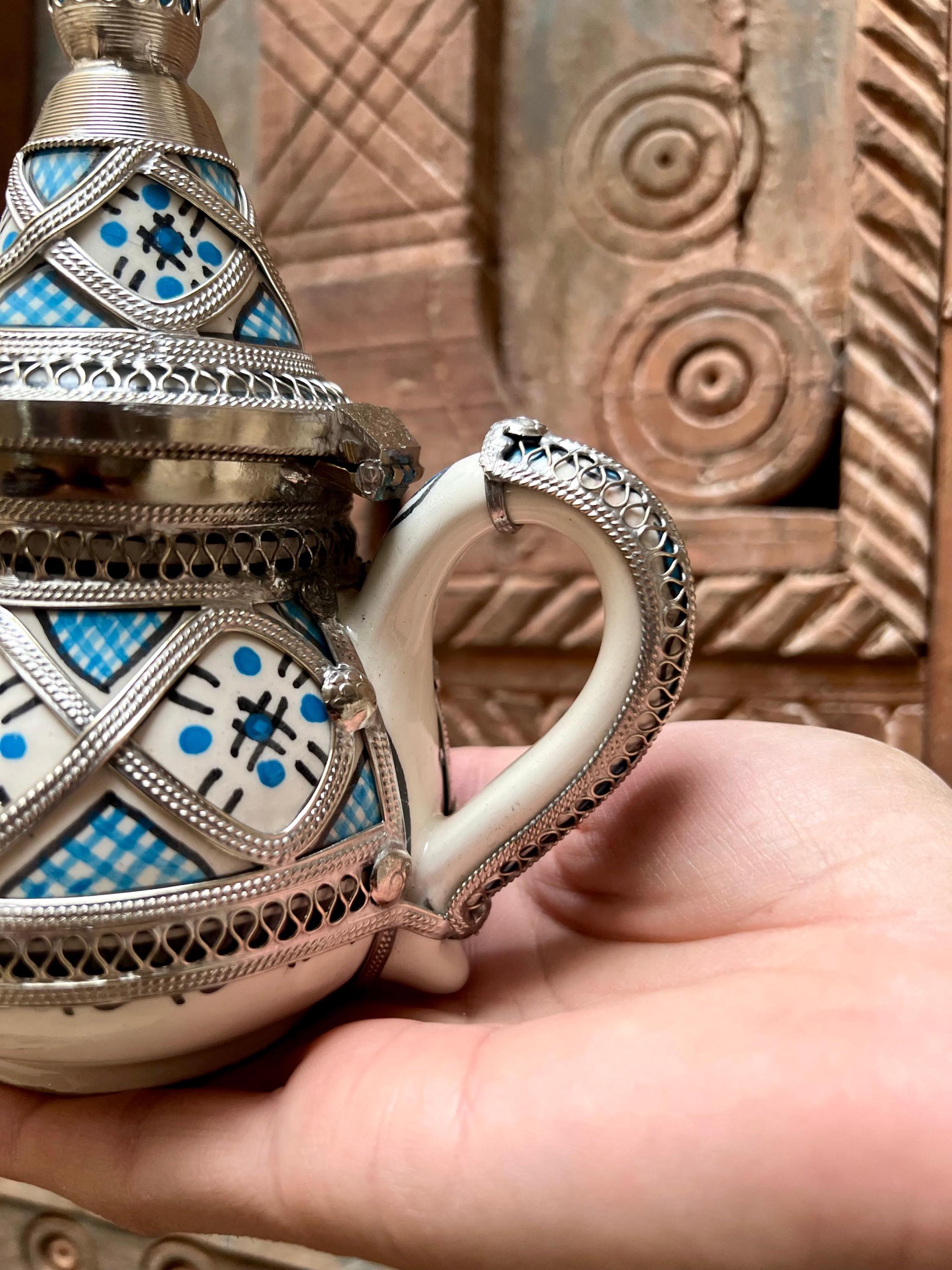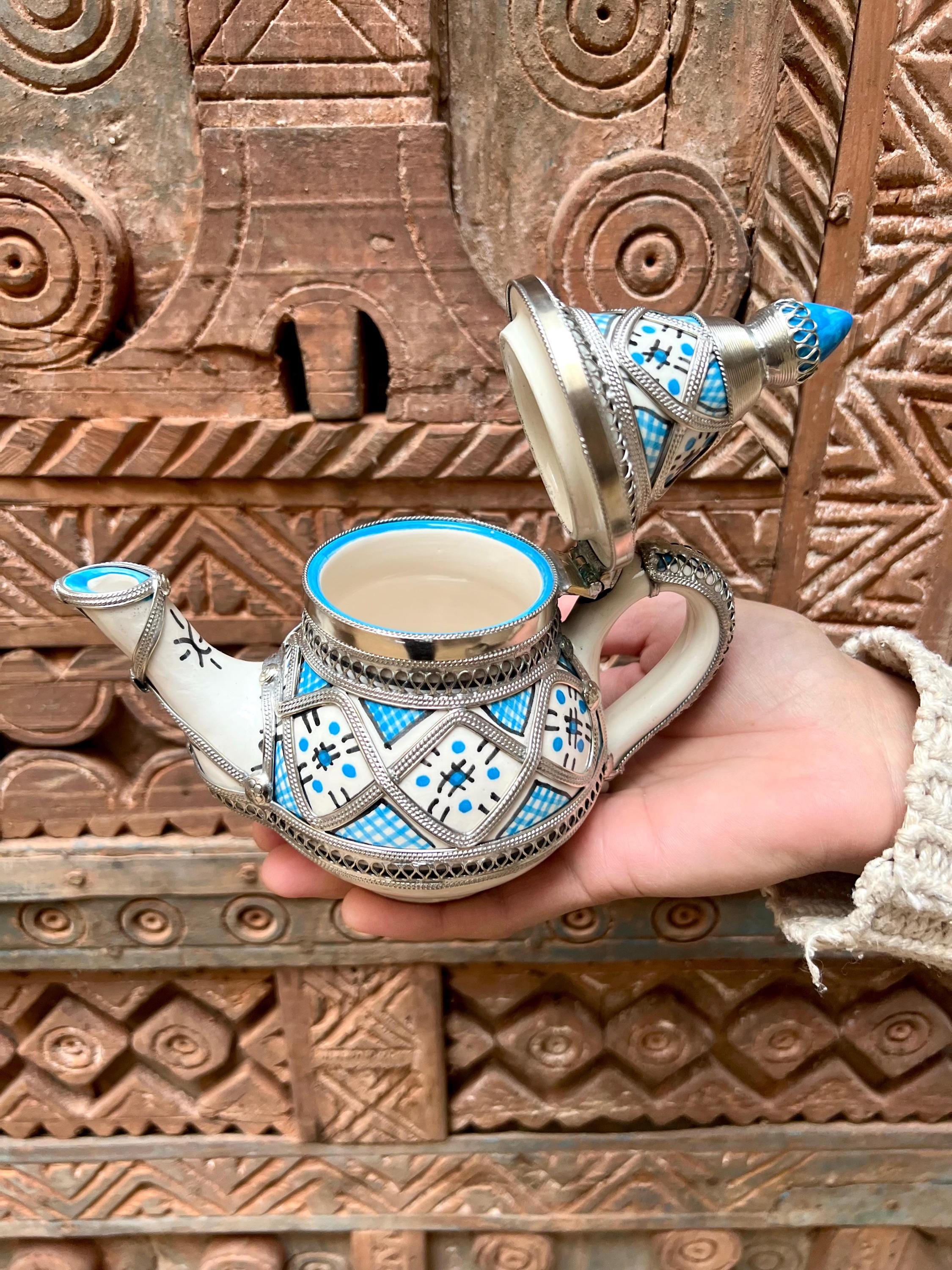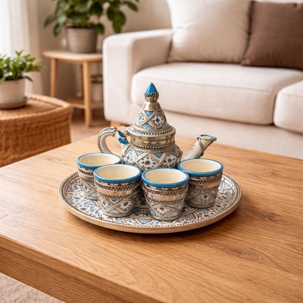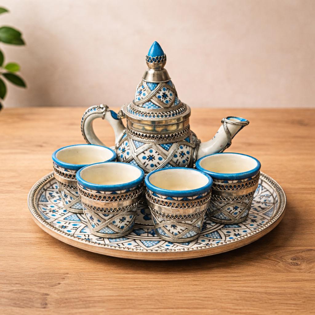 ✅ Product Description Bring the warmth and hospitality of Moroccan tradition to your home with this exquisite handmade tea set. This authentic set includes a beautifully detailed ceramic teapot, four matching cups, and a decorative tray — all hand-painted in striking blue and white geometric patterns with silver accents.