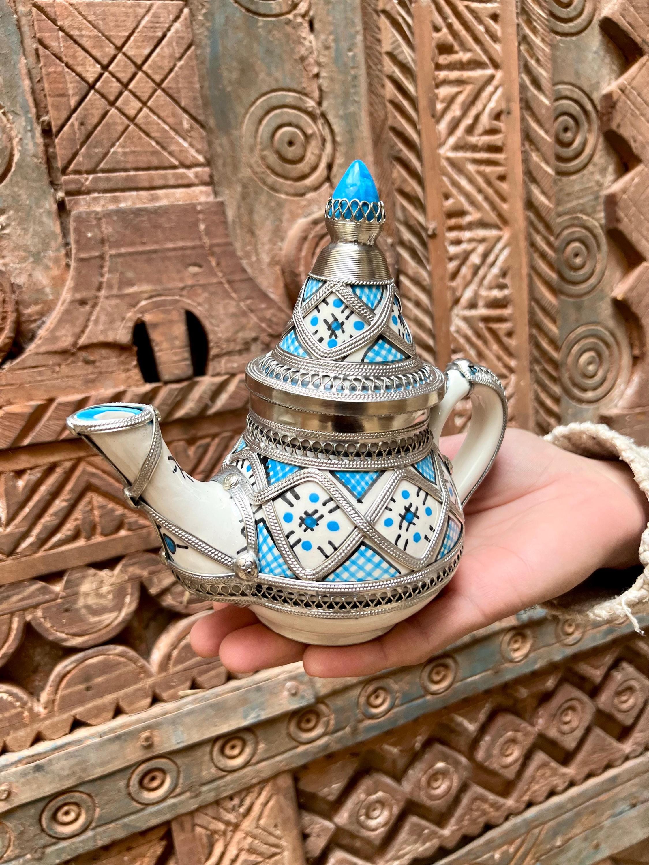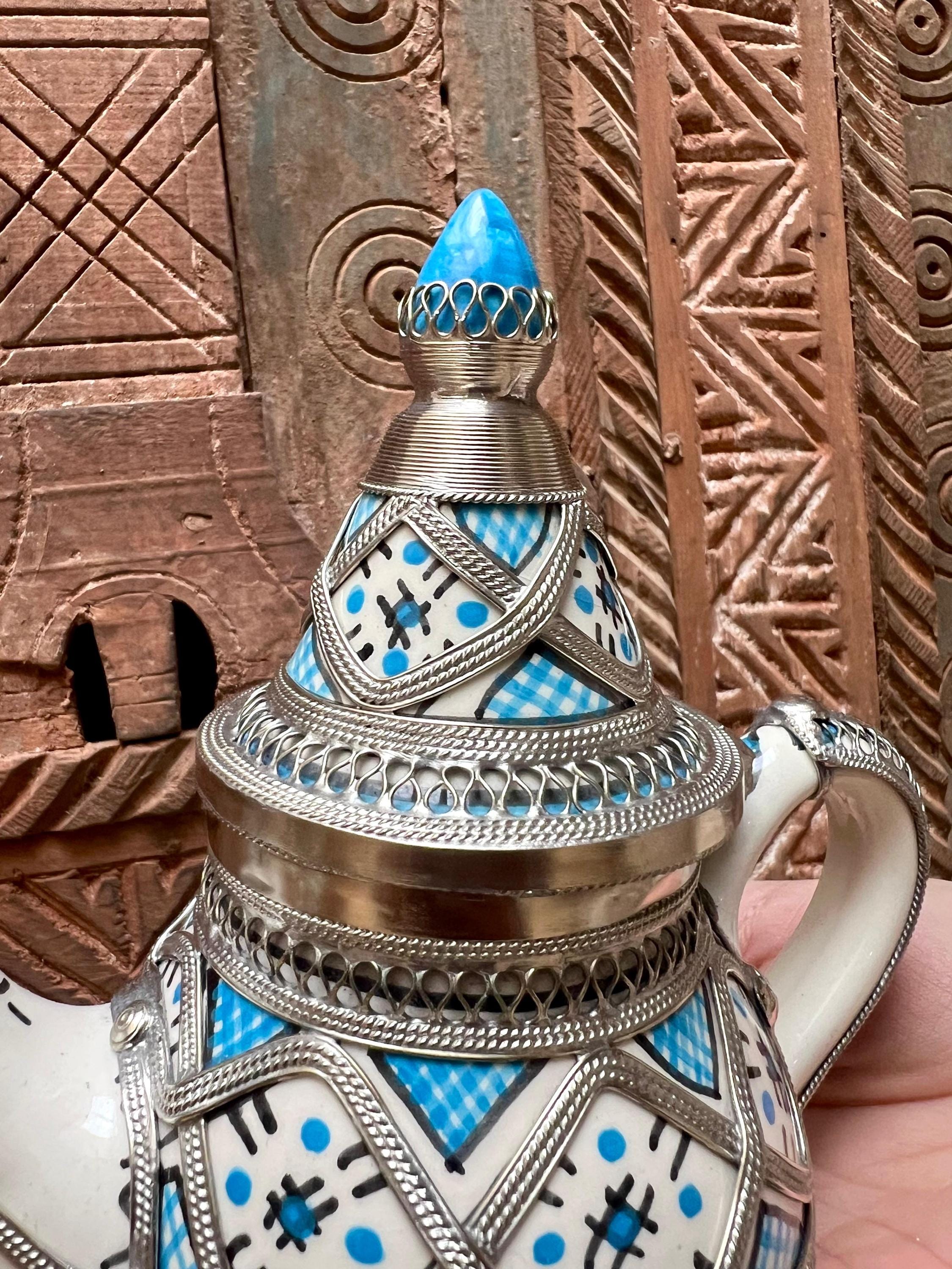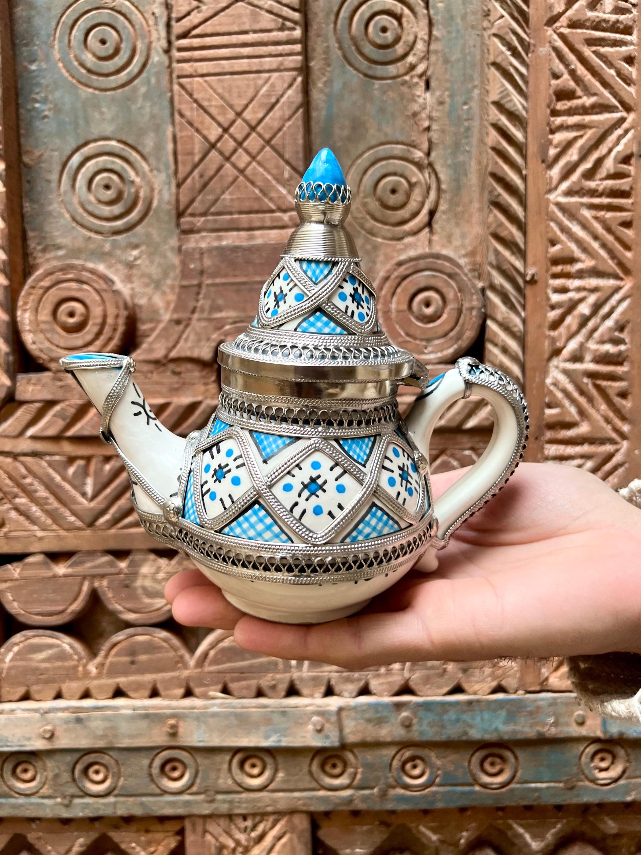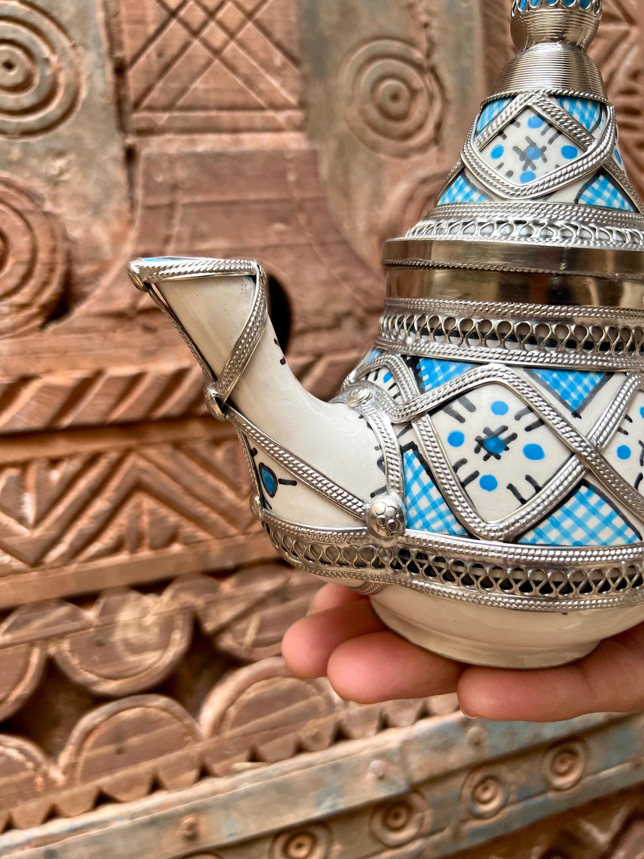 ✔ Includes: 1 teapot, 4 cups, 1 tray ✔ Material: Handmade ceramic with traditional Moroccan patterns ✔ Colors: Light Blue & white with intricate silver details ✔ Use: Functional for tea or as decorative decor ✔ Place Origin: Morocco ( FEZ )