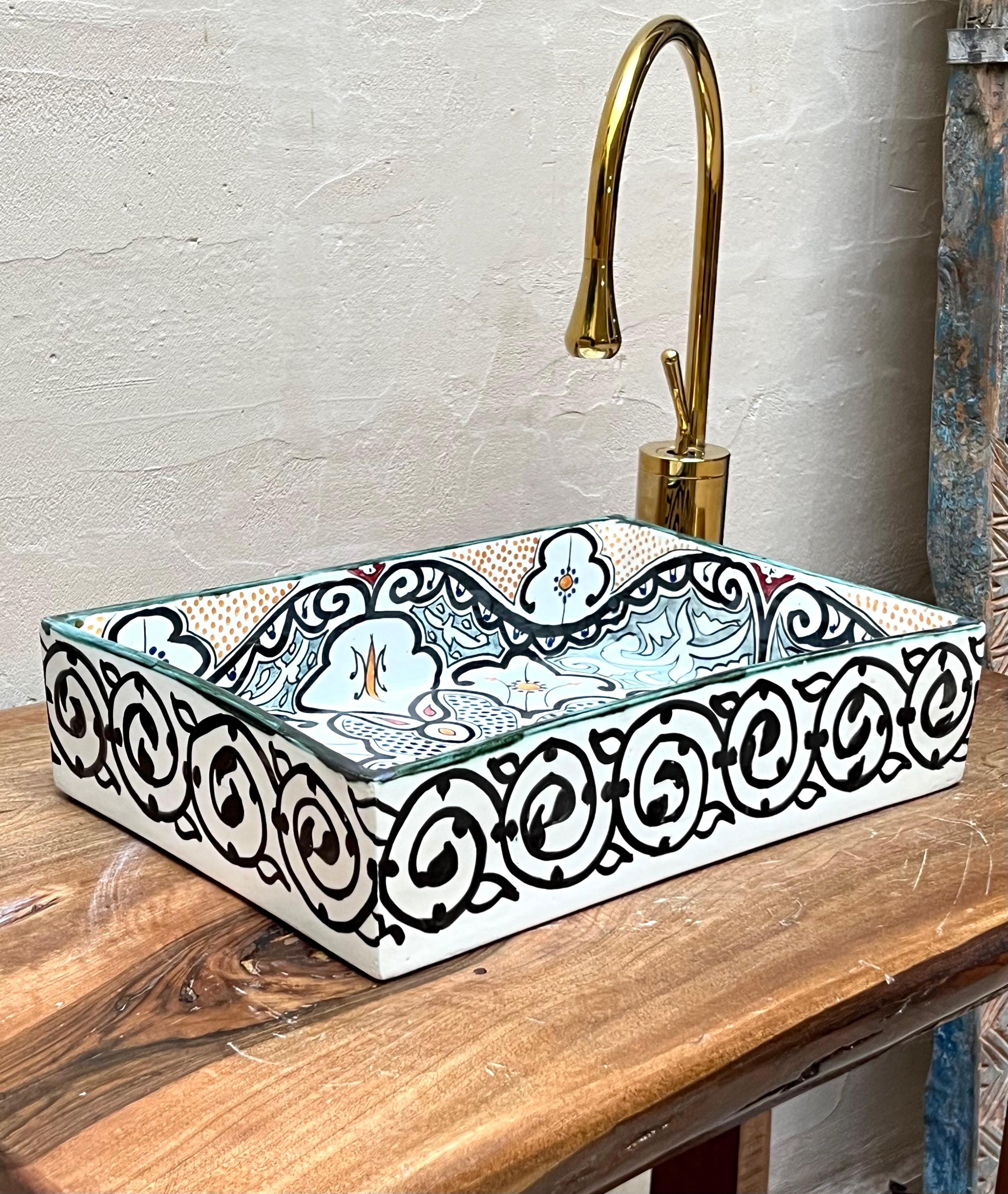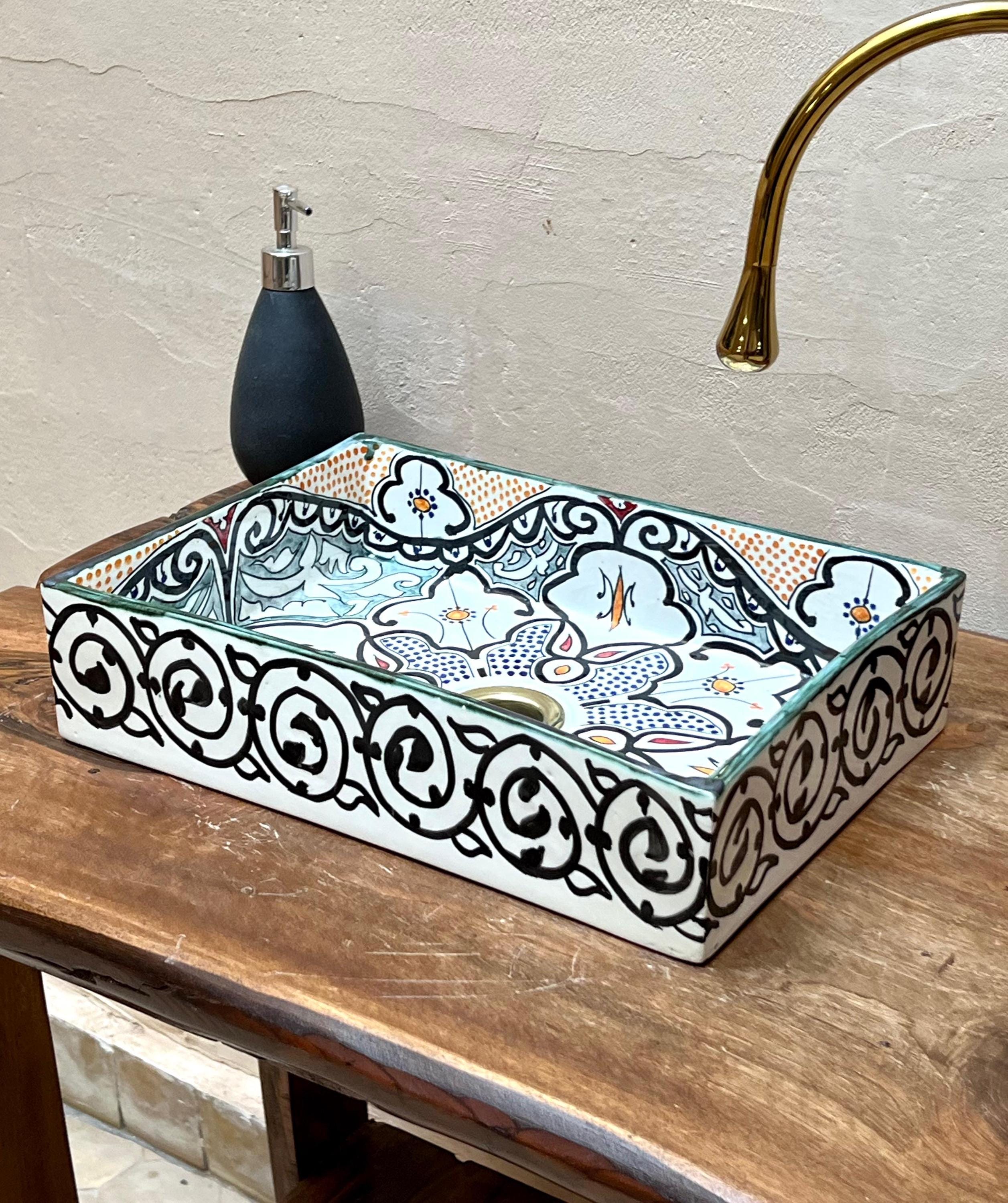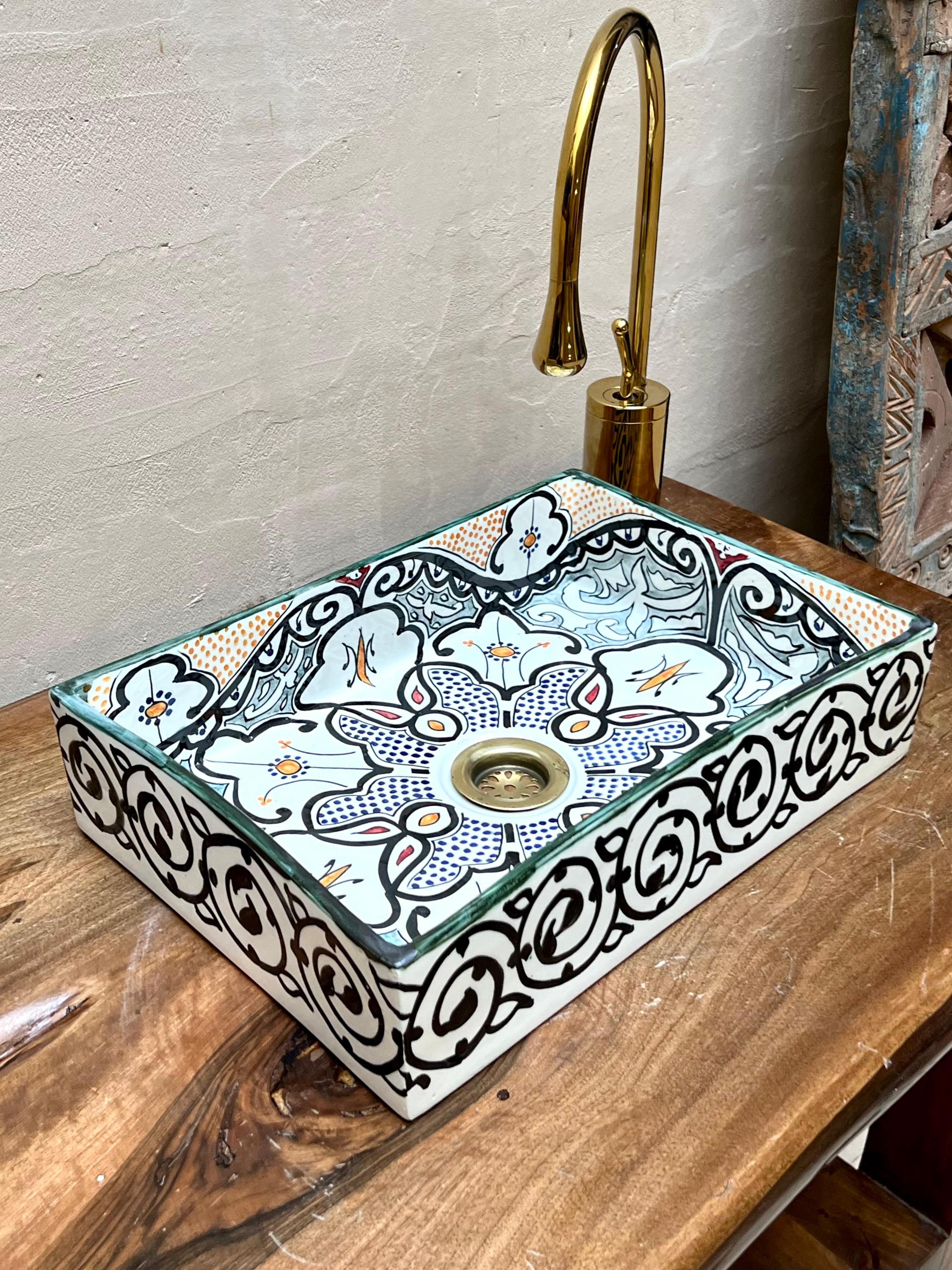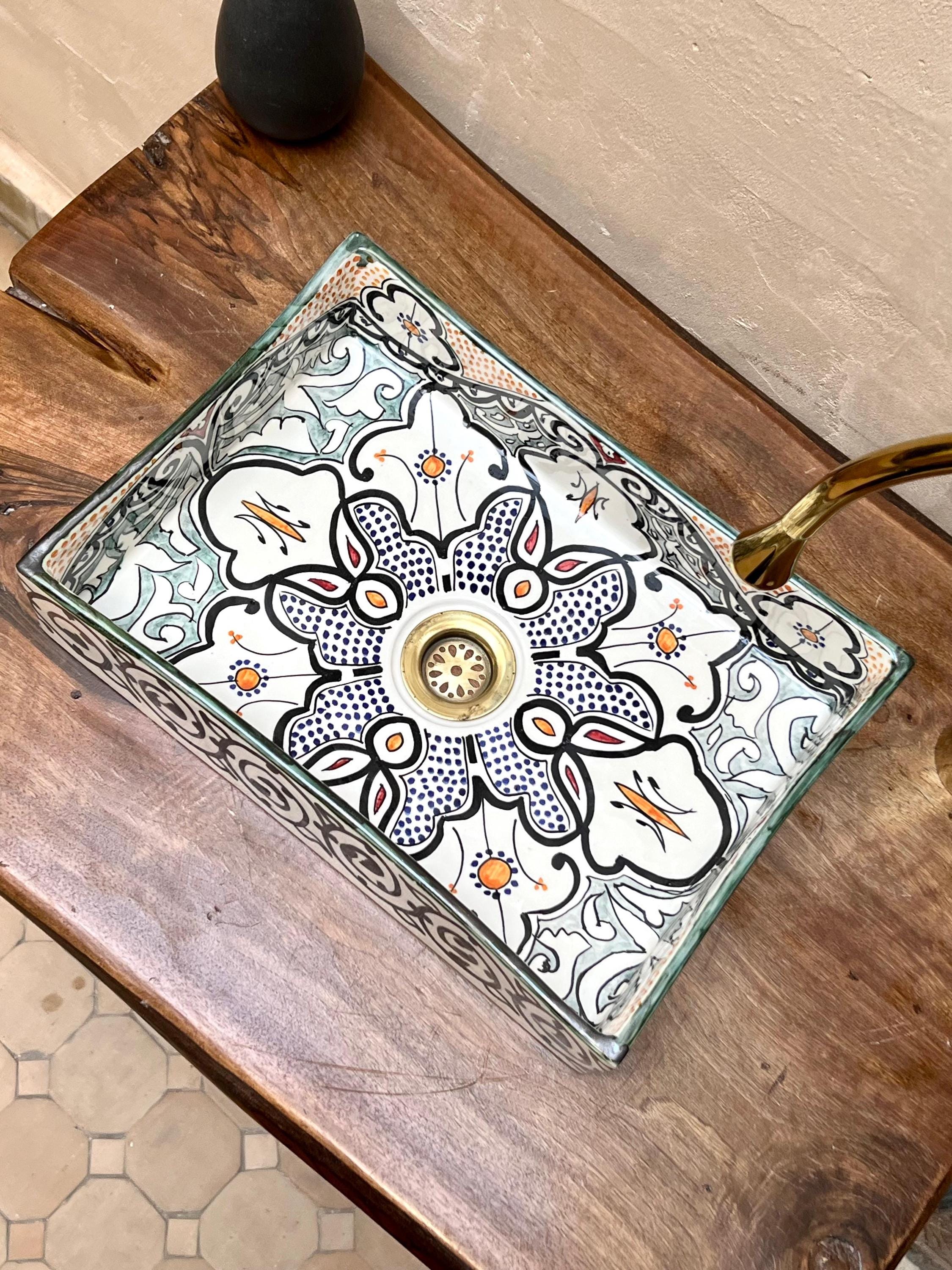 This beautiful Moroccan rectangular sink is handmade by skilled artisans using high-quality ceramic. Featuring traditional hand-painted designs and a smooth glazed finish, it is both durable and easy to clean. Perfect for kitchens, bathrooms, or powder rooms, it adds a unique touch of Moroccan charm to any space. The sink comes with both silver and copper drains included for free. If you need a different size, feel free to contact us.