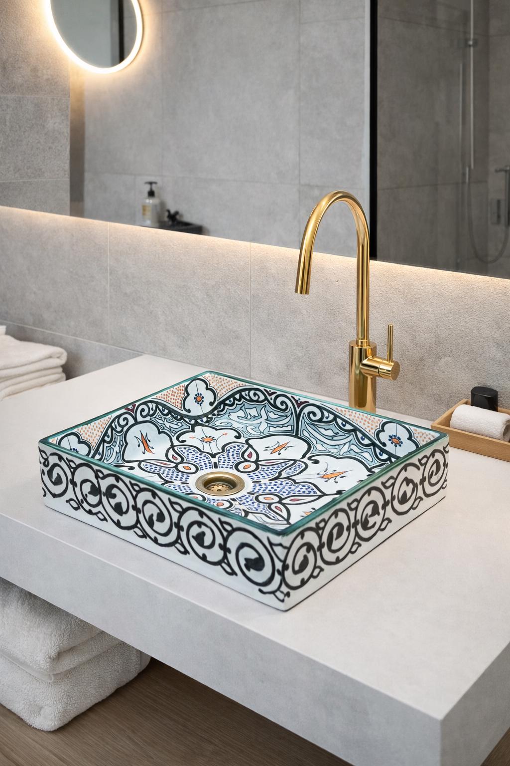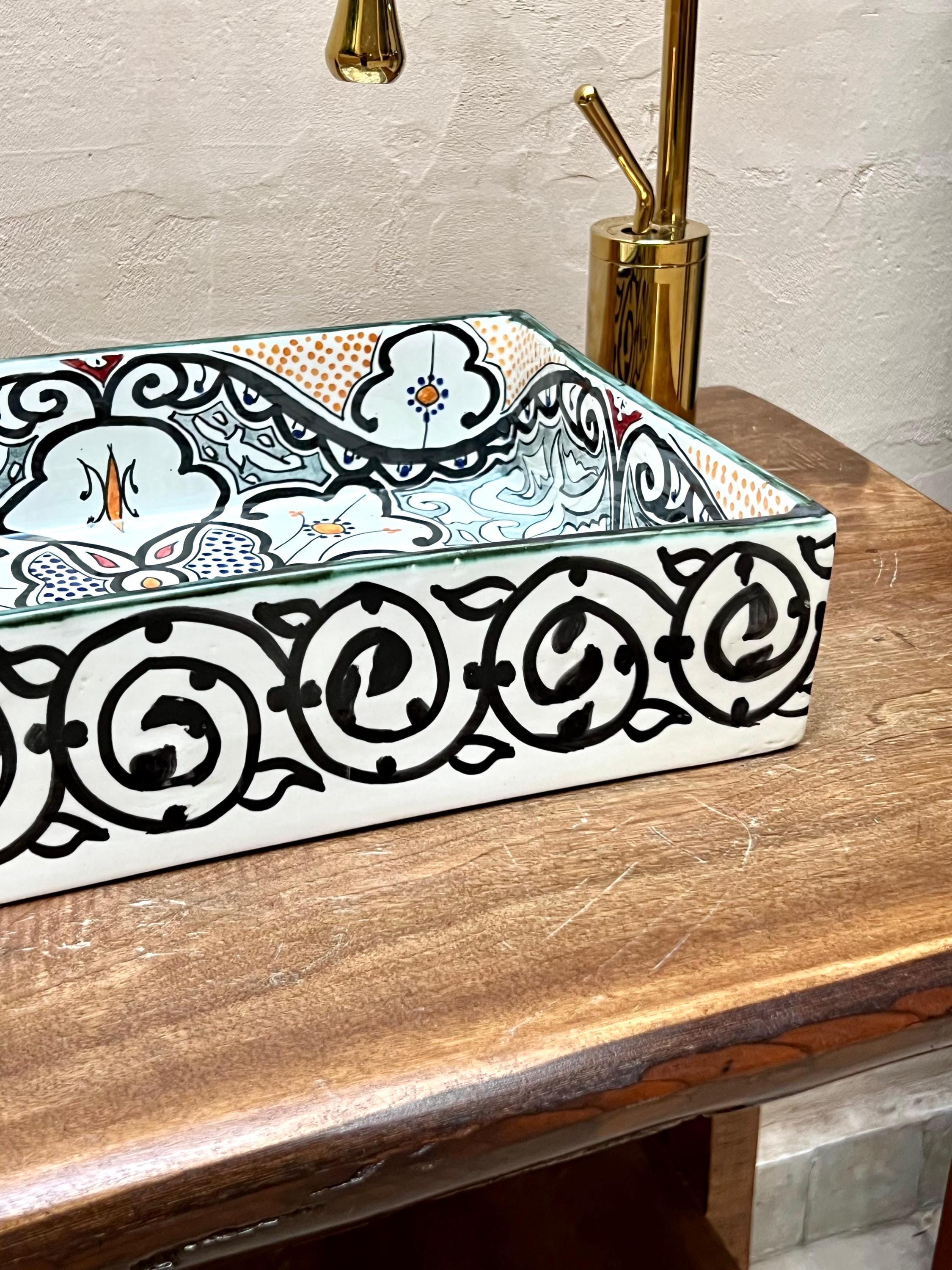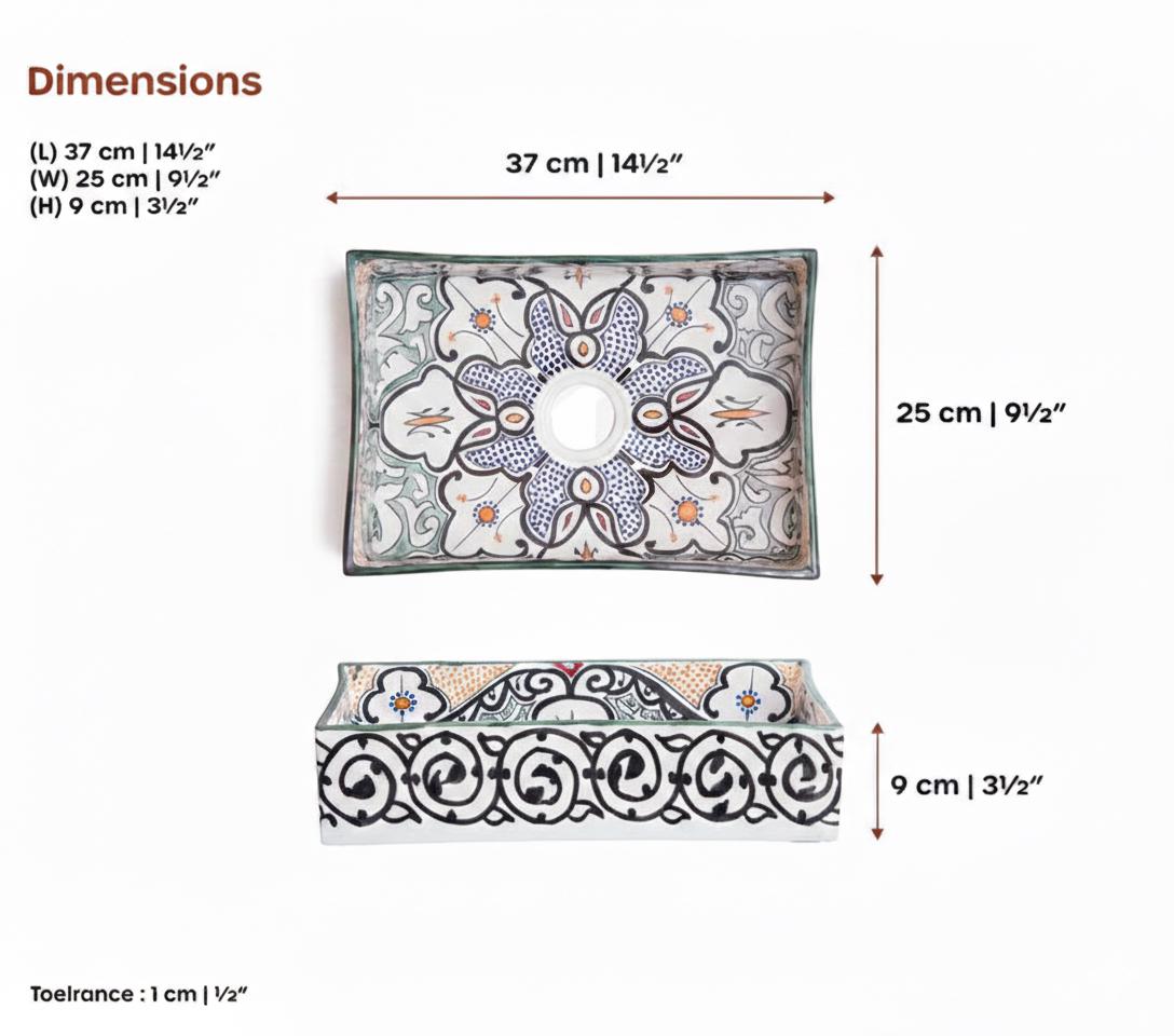 This beautiful Moroccan rectangular sink is handmade by skilled artisans using high-quality ceramic. Featuring traditional hand-painted designs and a smooth glazed finish, it is both durable and easy to clean. Perfect for kitchens, bathrooms, or powder rooms, it adds a unique touch of Moroccan charm to any space. The sink comes with both silver and copper drains included for free. If you need a different size, feel free to contact us.
