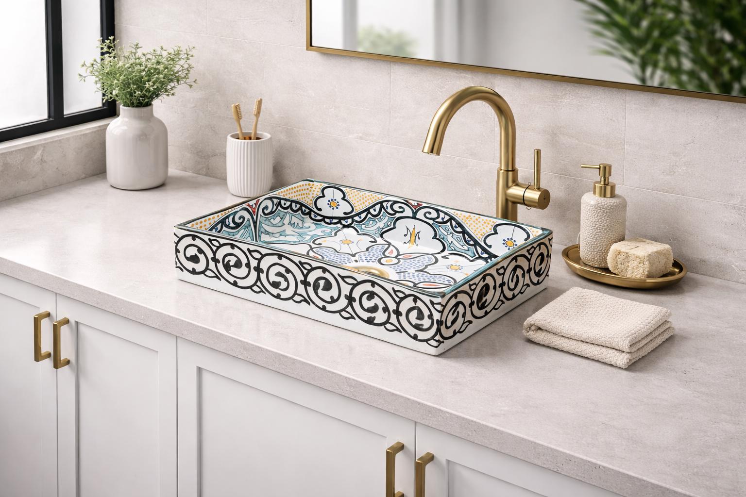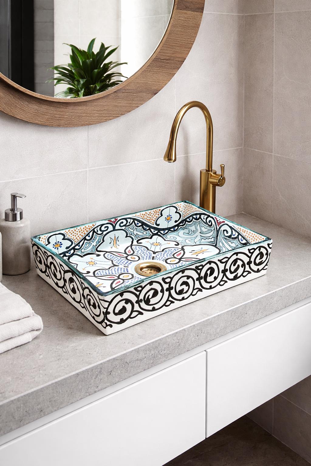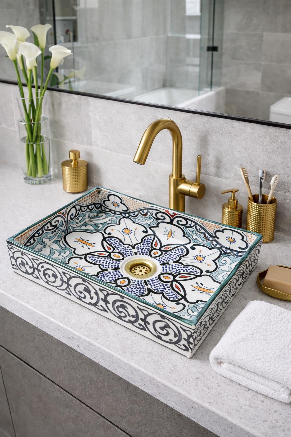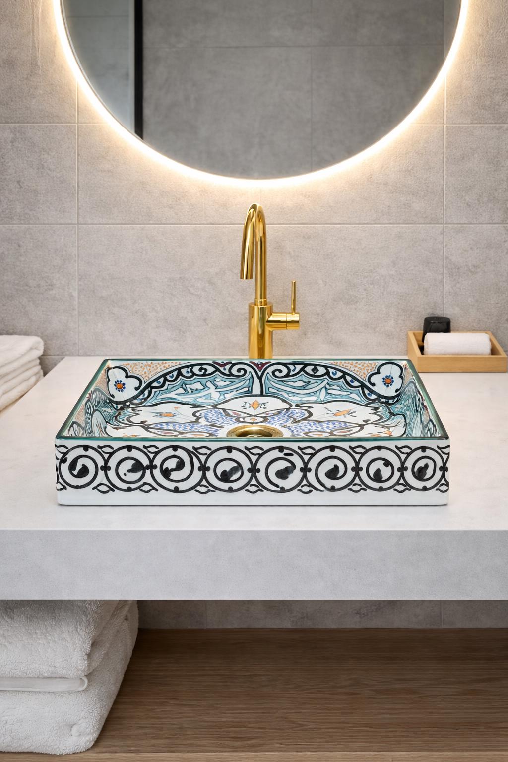 This beautiful Moroccan rectangular sink is handmade by skilled artisans using high-quality ceramic. Featuring traditional hand-painted designs and a smooth glazed finish, it is both durable and easy to clean. Perfect for kitchens, bathrooms, or powder rooms, it adds a unique touch of Moroccan charm to any space. The sink comes with both silver and copper drains included for free. If you need a different size, feel free to contact us.
