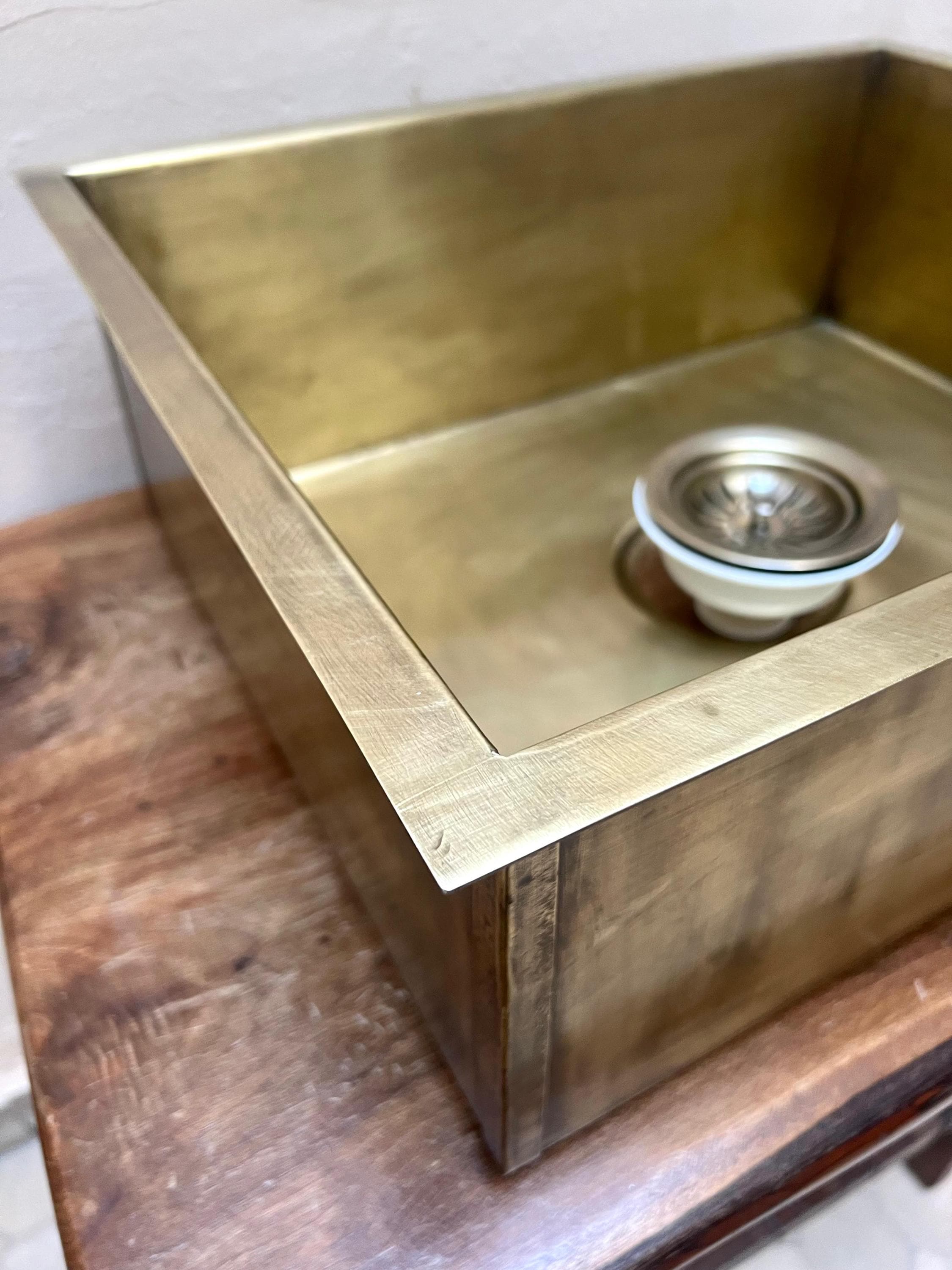 This handcrafted unlacquered rectangular brass bar sink features a beautiful antique patina finish that naturally evolves over time, creating a unique living character in every piece.