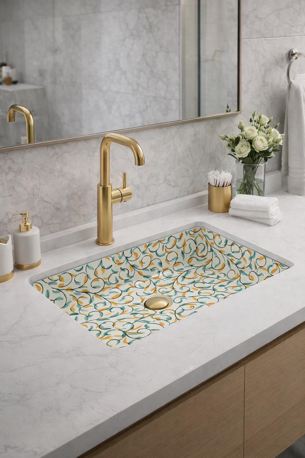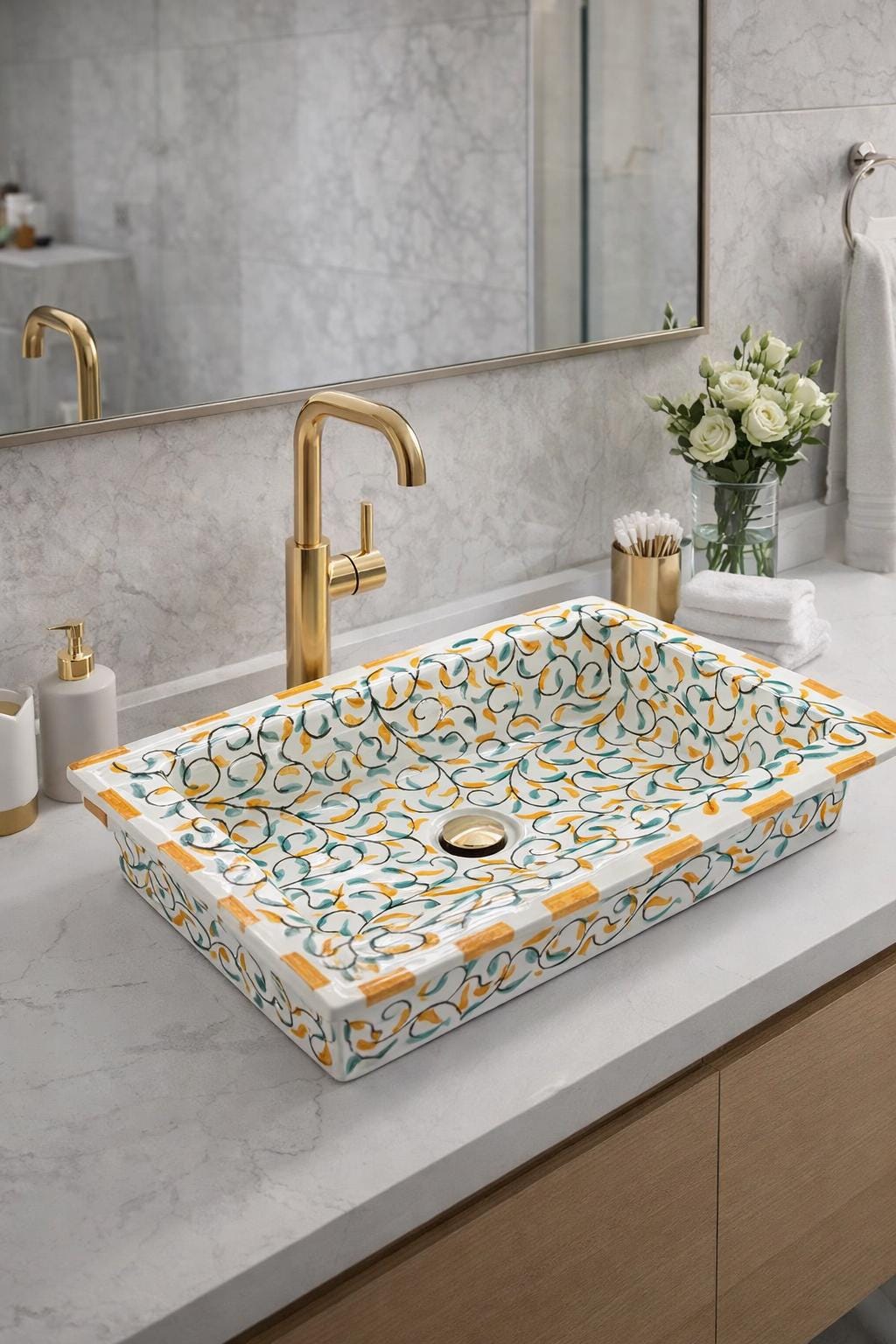 Hand-painted by skilled artisans, each sink is unique, showcasing traditional Moroccan patterns with a timeless aesthetic. Designed for both beauty and functionality, it is ideal for bathrooms, powder rooms, or luxury interiors seeking an artisanal touch.