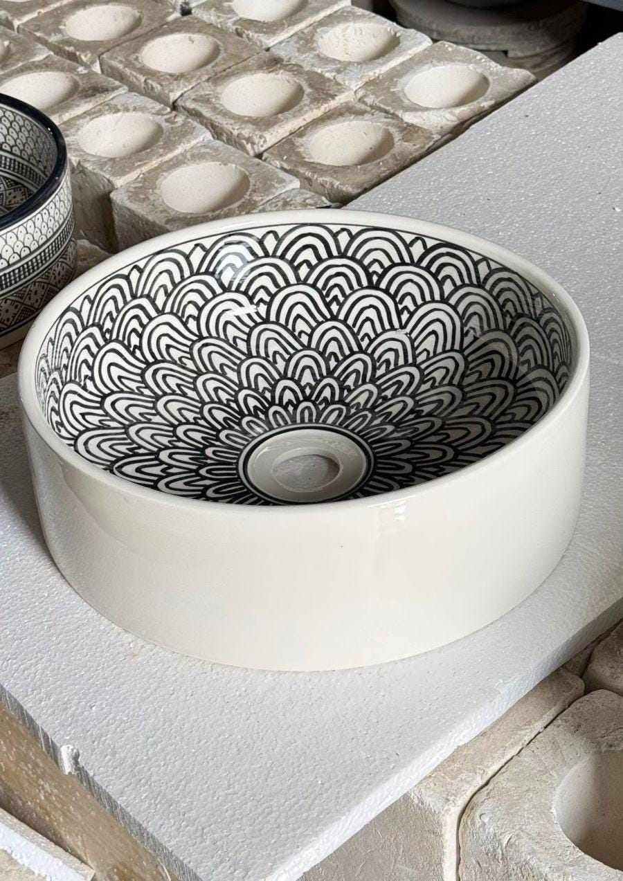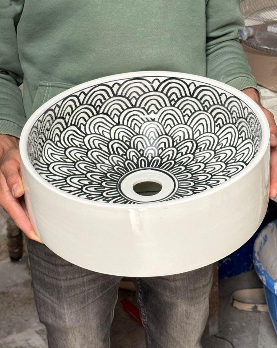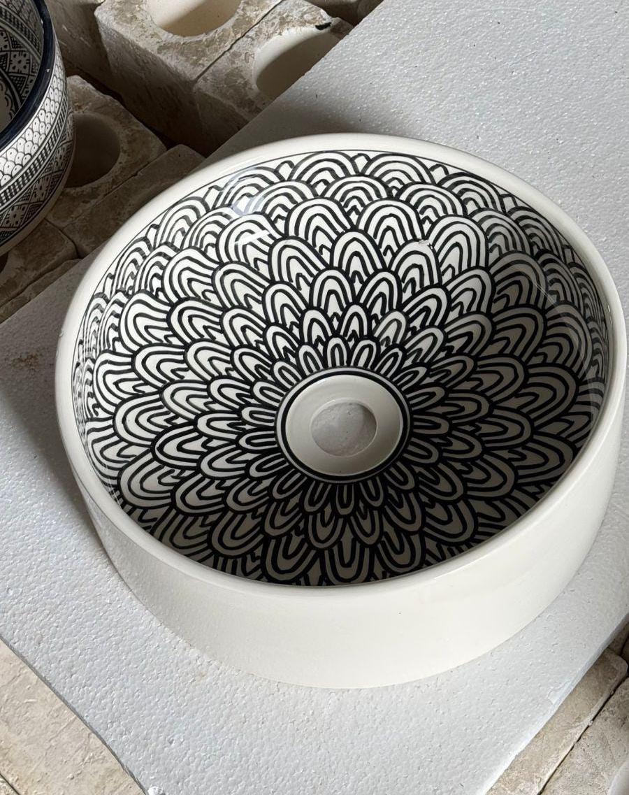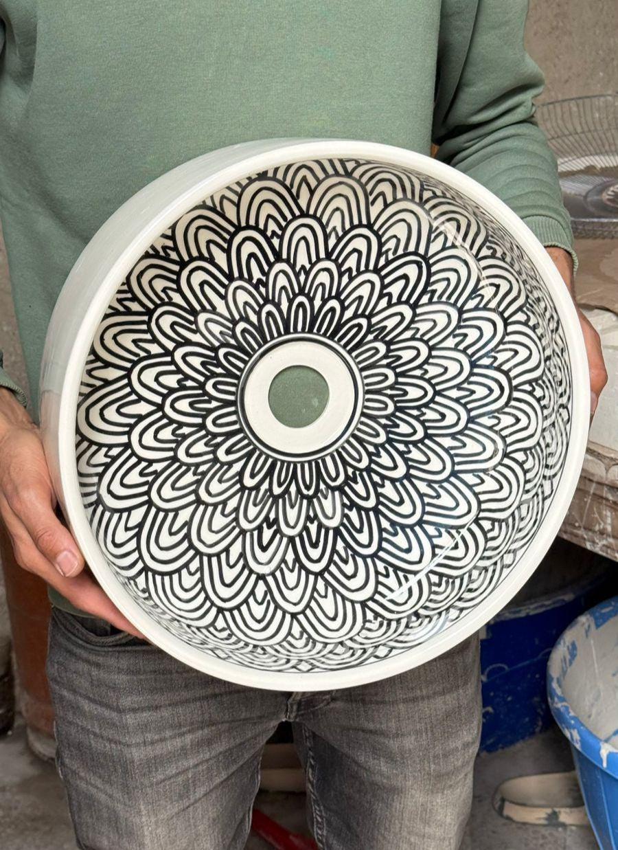 This elegant handcrafted ceramic sink is a true statement piece, designed to bring both artistry and sophistication into your bathroom space. Featuring a refined black-on-white mandala pattern, the intricate design is carefully hand-painted inside the basin, creating a striking visual focus while keeping the exterior clean and minimalist.