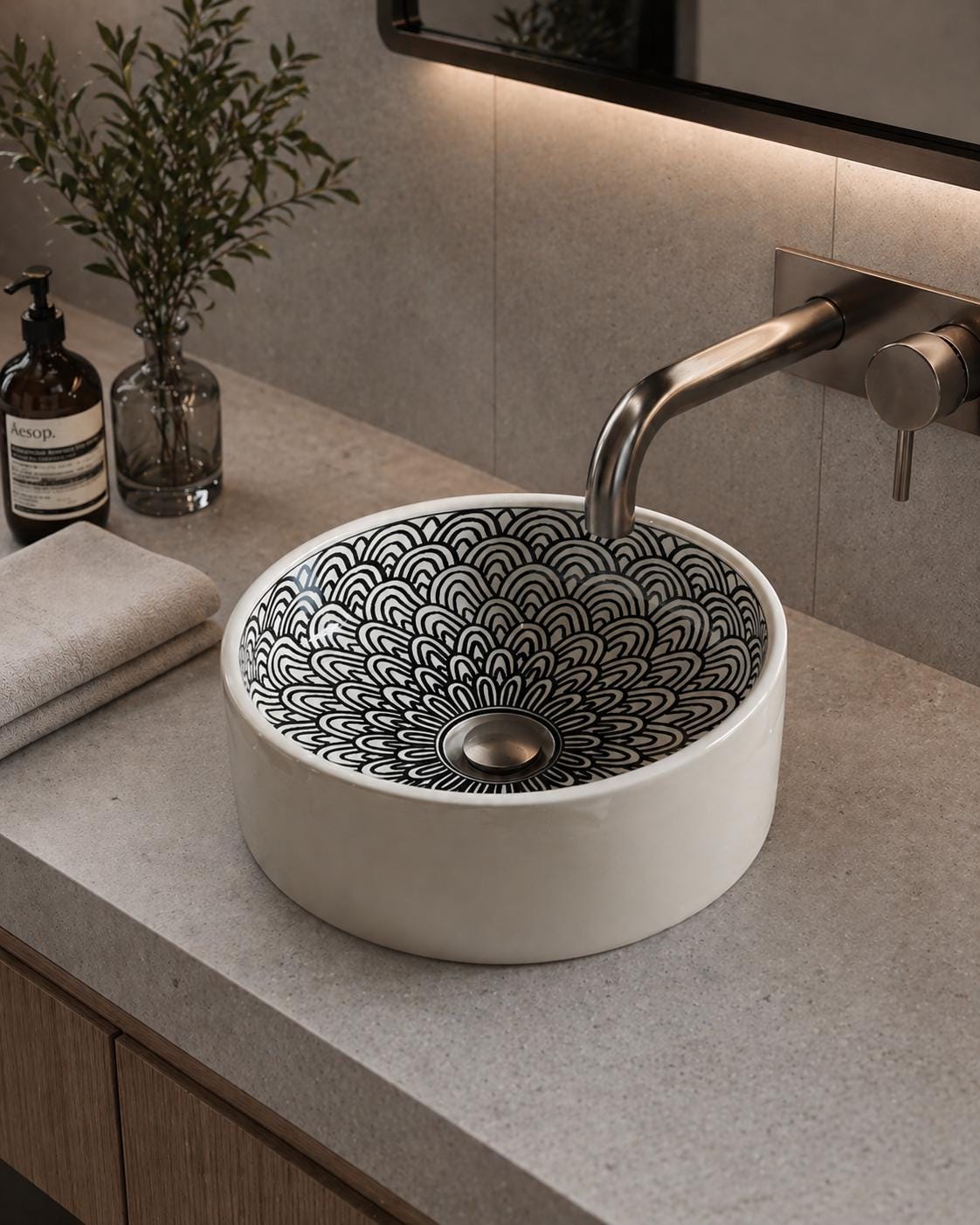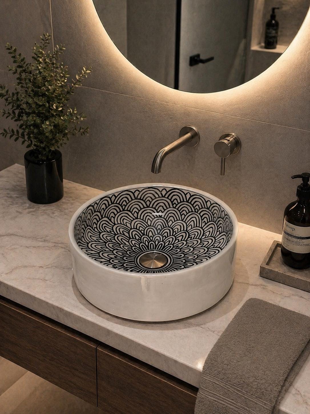 The contrast between the detailed interior and the smooth outer surface makes it perfect for modern, contemporary, or even wabi-sabi style bathrooms. Its round shape and balanced proportions add softness and harmony to any vanity setup.